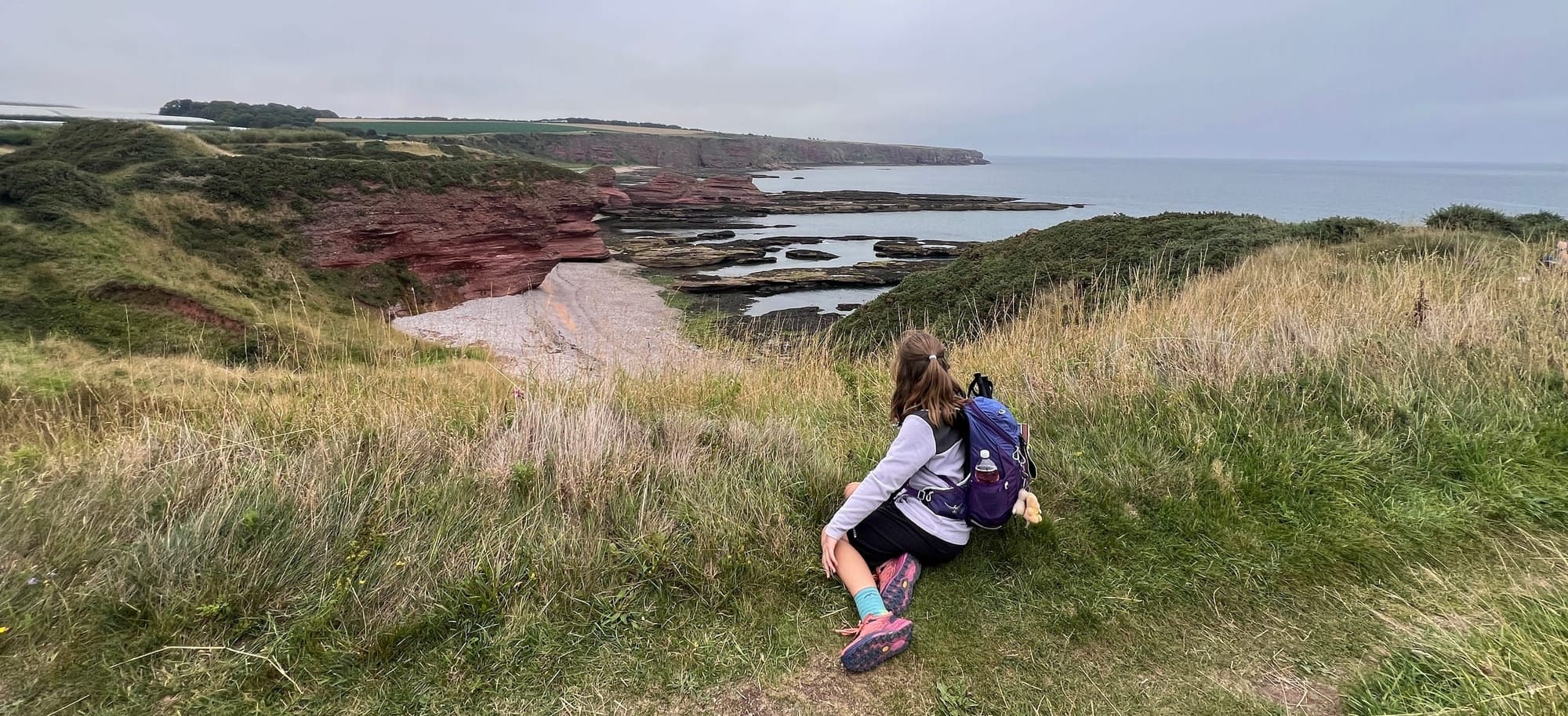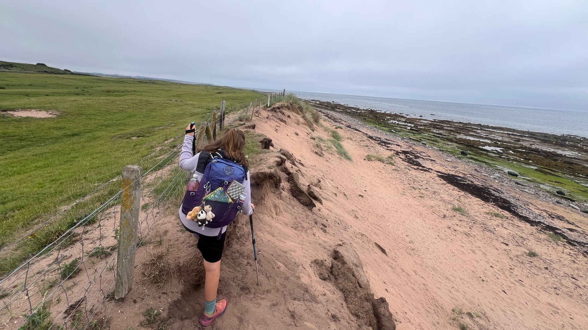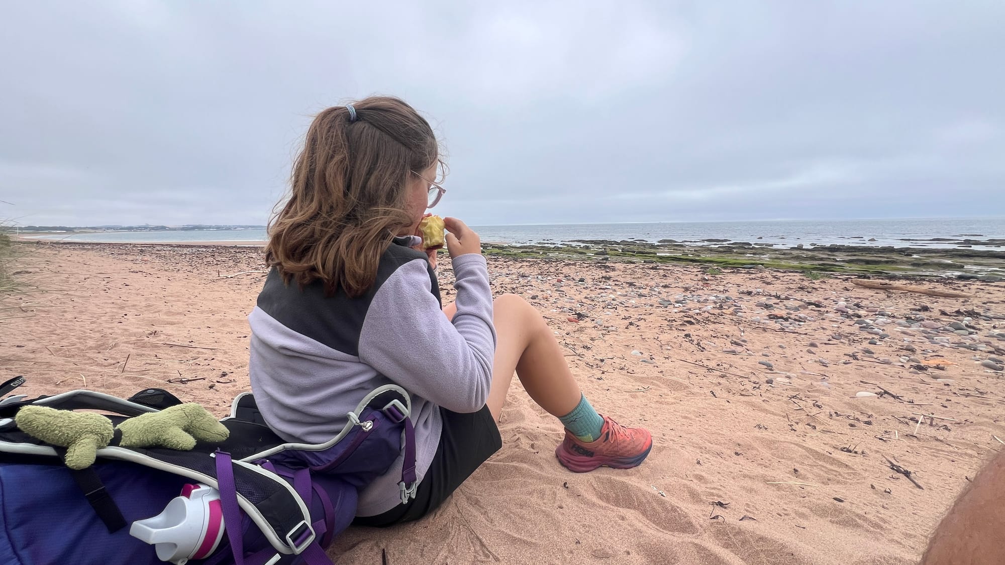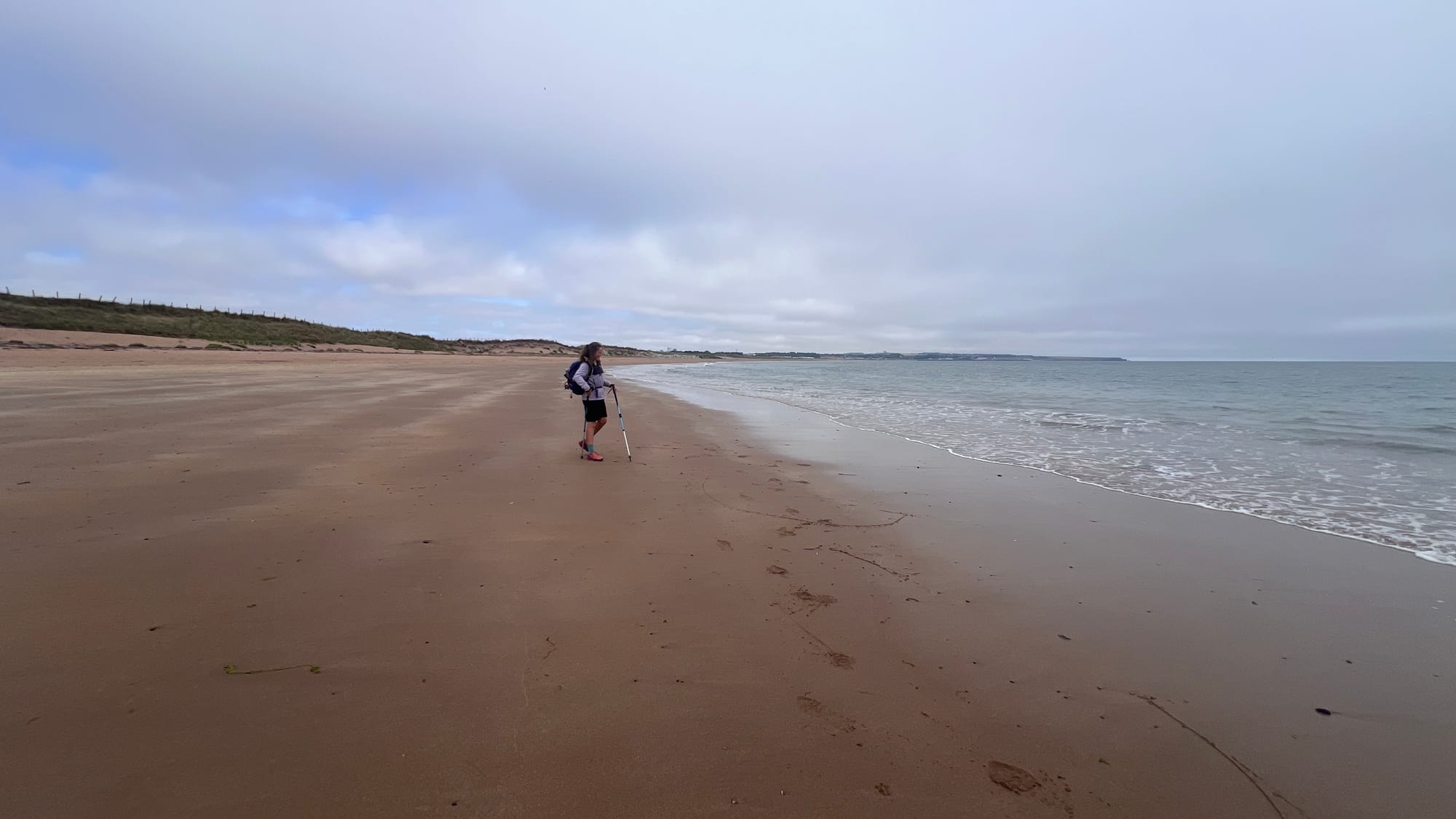 Arriving at Carnoustie, Westhaven, it was still early in the morning. A few dog walkers, a man reading a book sitting on a bench, and a cold wind blowing off the sea. It didn't feel like the height of summer. But it felt good, refreshing, especially after the two hours of driving in the car to get here! We couldn't wait to get going! We were excited and chomping at the bit to start walking and get sand on our shoes... Sarah had to keep telling Eve to come back and 'calm down' as I prepared our backpacks, switched on the satellite trackers, and drank the last dregs from my flask.