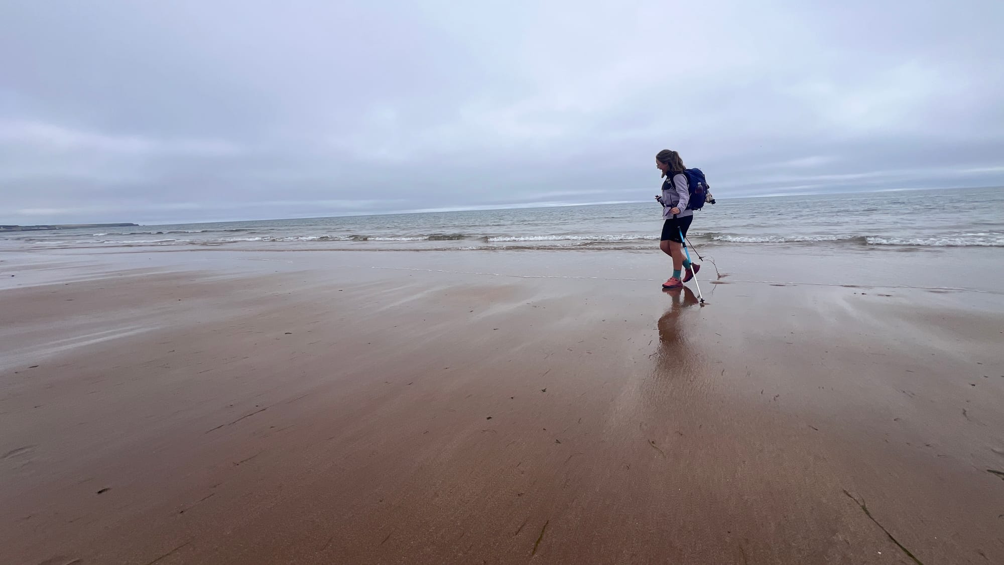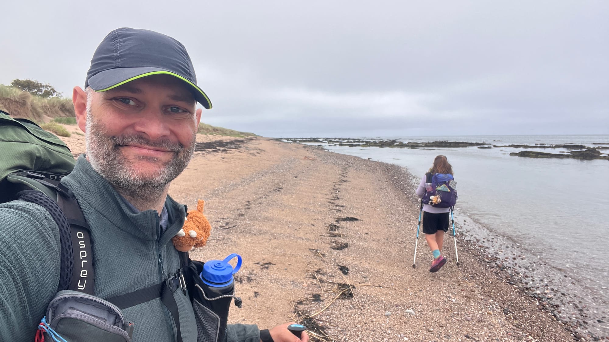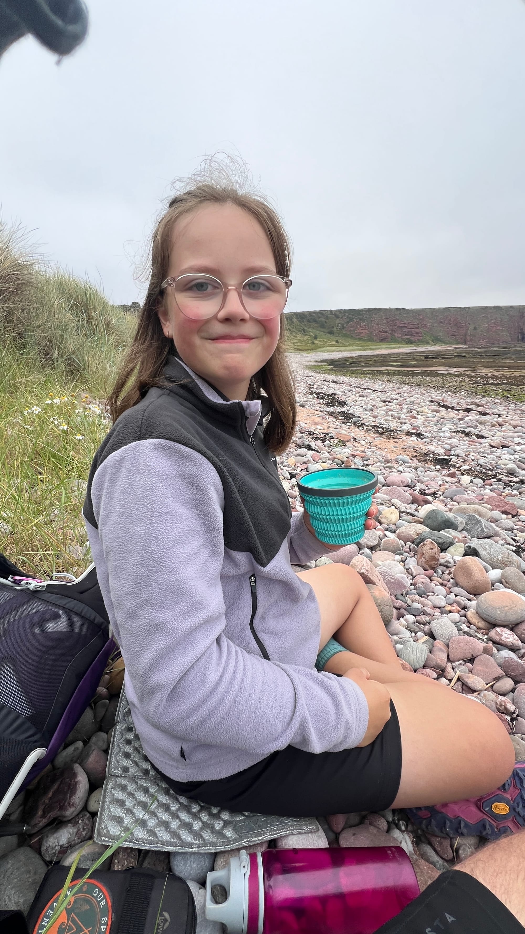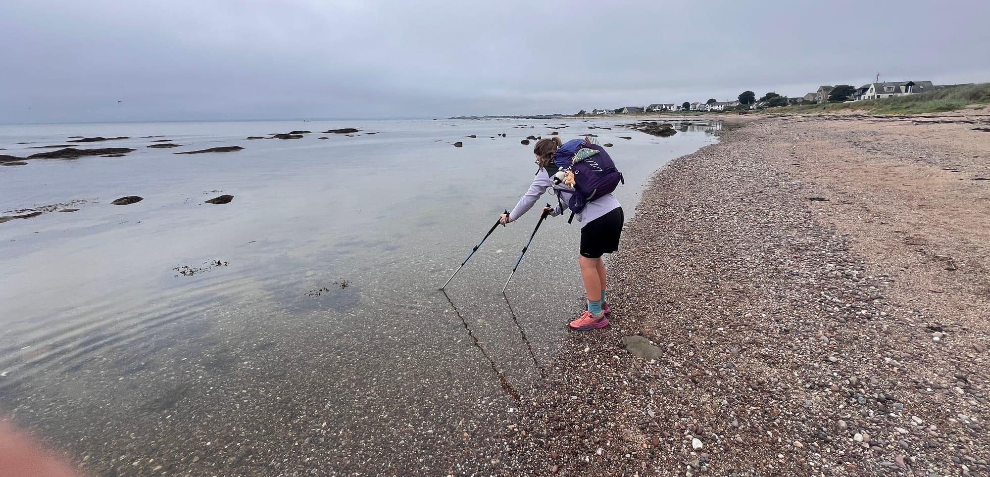 Arriving at Carnoustie, Westhaven, it was still early in the morning. A few dog walkers, a man reading a book sitting on a bench, and a cold wind blowing off the sea. It didn't feel like the height of summer. But it felt good, refreshing, especially after the two hours of driving in the car to get here! We couldn't wait to get going! We were excited and chomping at the bit to start walking and get sand on our shoes... Sarah had to keep telling Eve to come back and 'calm down' as I prepared our backpacks, switched on the satellite trackers, and drank the last dregs from my flask.