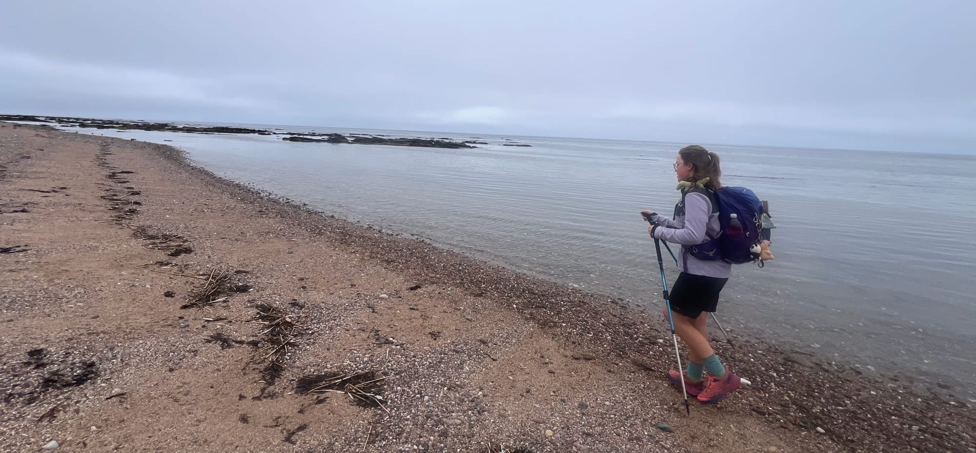 We stopped for lunch after being pushed onto the beach as the dunes gradually faded into sandy shoreline. Sitting on our backpacks, behind a concrete structure, cuddled close together, we ate! I cherish these moments more than I can say, and I hold them dear!
