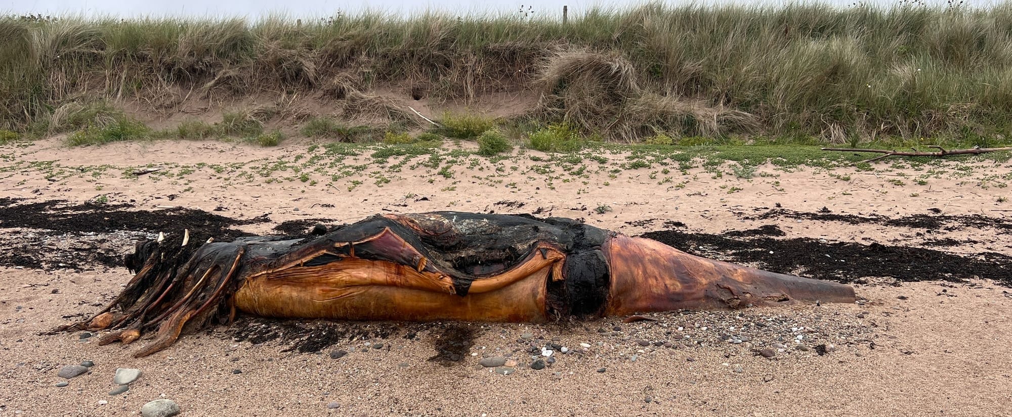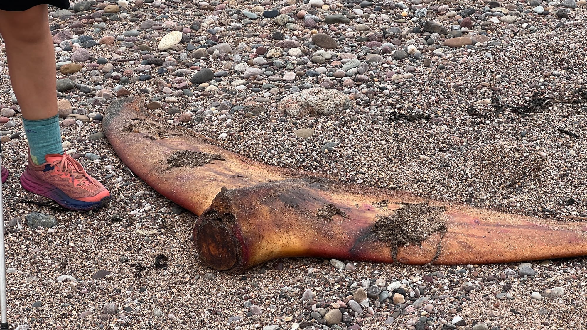 As we strolled along the beach, Eve spotted a whale's tail lying on the sand. At first, we both thought it was fake and had a conversation to justify to each other why we believed it was actually real! The tail (as you can see from the picture) looked as if it had been severed. The cut was so precise that nothing about it seemed natural. We took a picture with Eve's foot in the frame so you could gauge the size of the tail! After deciding it was genuine, we immediately asked each other, "Where's the rest of it?" and "Why would someone cut the tail off and leave it?" This question would soon be answered. As we continued walking, we spotted other parts of the whale, including the massive decaying torso, blubber, skin, and more. What we couldn't find anywhere on the beach was the whales head!