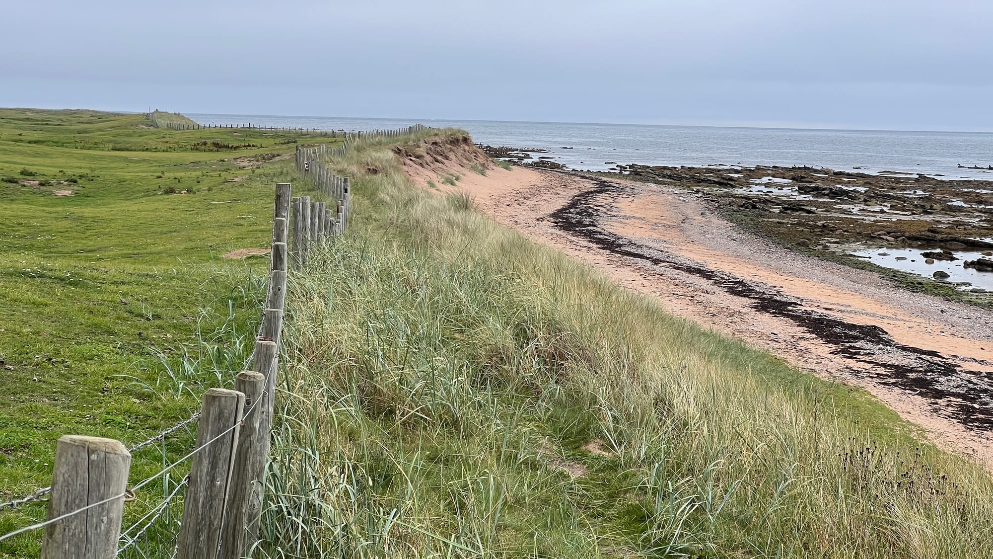 Reaching the top of Carlingheugh Bay feeling tired and hungry. At the top of Carlingheugh Bay, there is a fence constructed from staves with notes. I don't recall seeing a fence like this anywhere on our travels. The area around Carlingheugh Bay felt wild and quite remote, despite its closeness to roads and large towns. Seeing such an ornate fence, in such a good state of repair, looked out of place — but not in a bad way.