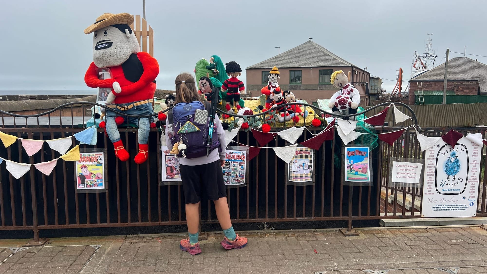 Arbroath town, a crochet display and the log road towards the Arbroath Cliff Trail