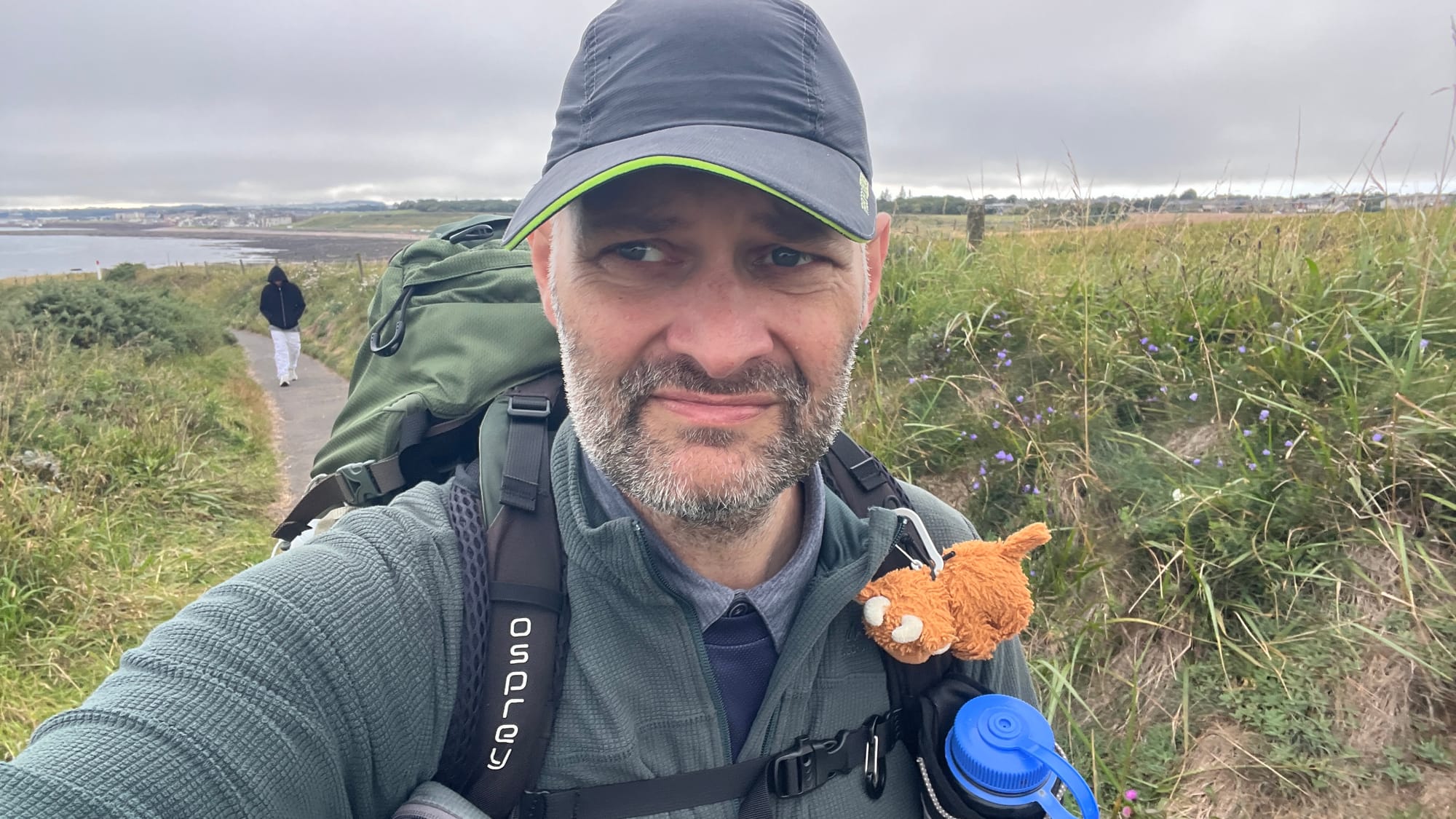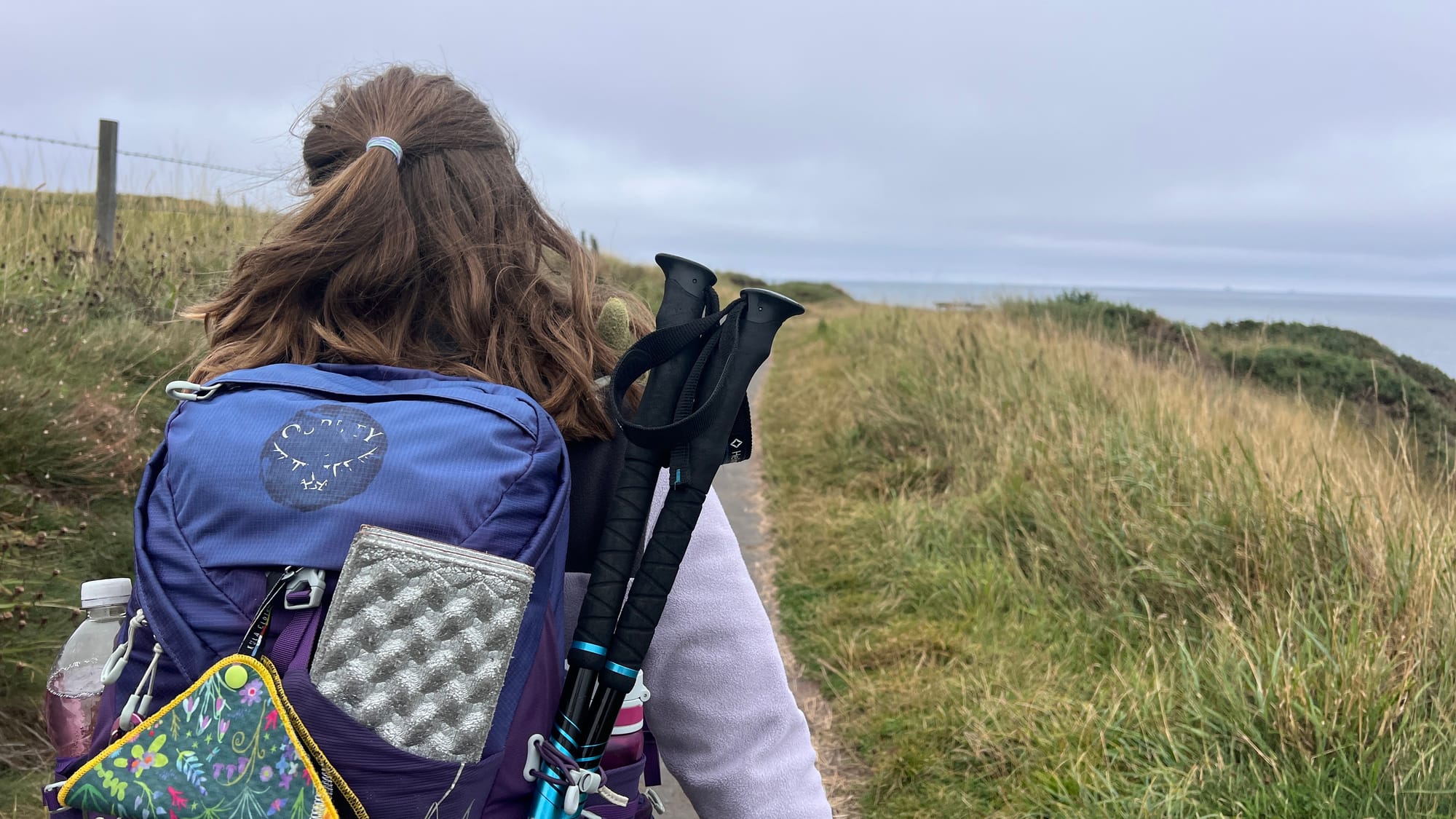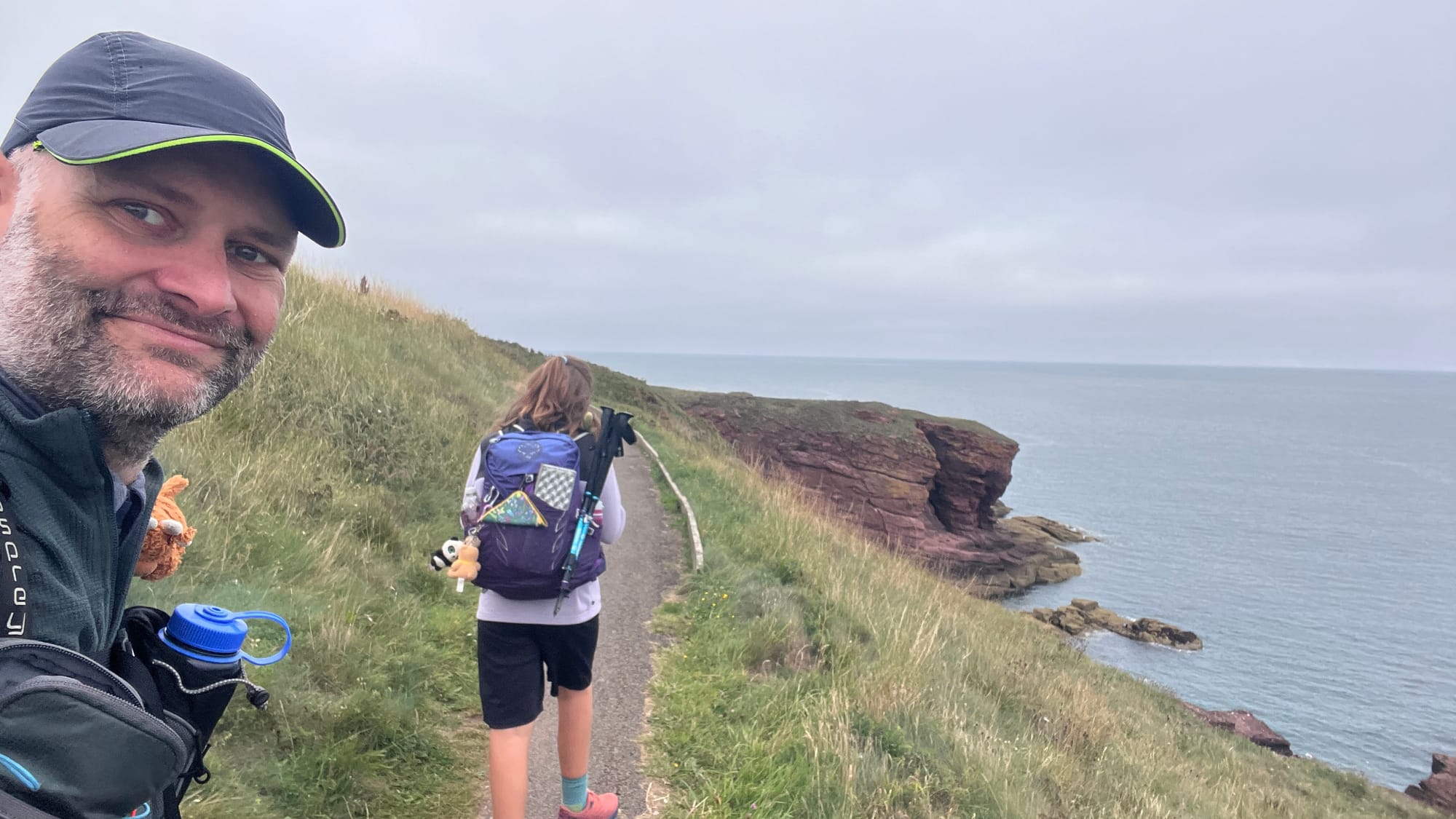 We walked up a slight embankment from the road below onto the Arbroath Cliff Trail, passing a man sitting on a bench. As we walked past, he got up and started to walk directly behind us, gradually catching up... I took this selfie-style image so I could get a better look before deciding what to do! For a warm(ish) day walking into a remote part of the Scottish coast, everything about him looked 'off' and felt, to me, 'odd'. I felt concerned and began to worry about his motives! As he approached, I was busy formulating a plan in my head—a plan I had run through countless times—when all of a sudden he shouted—loudly!