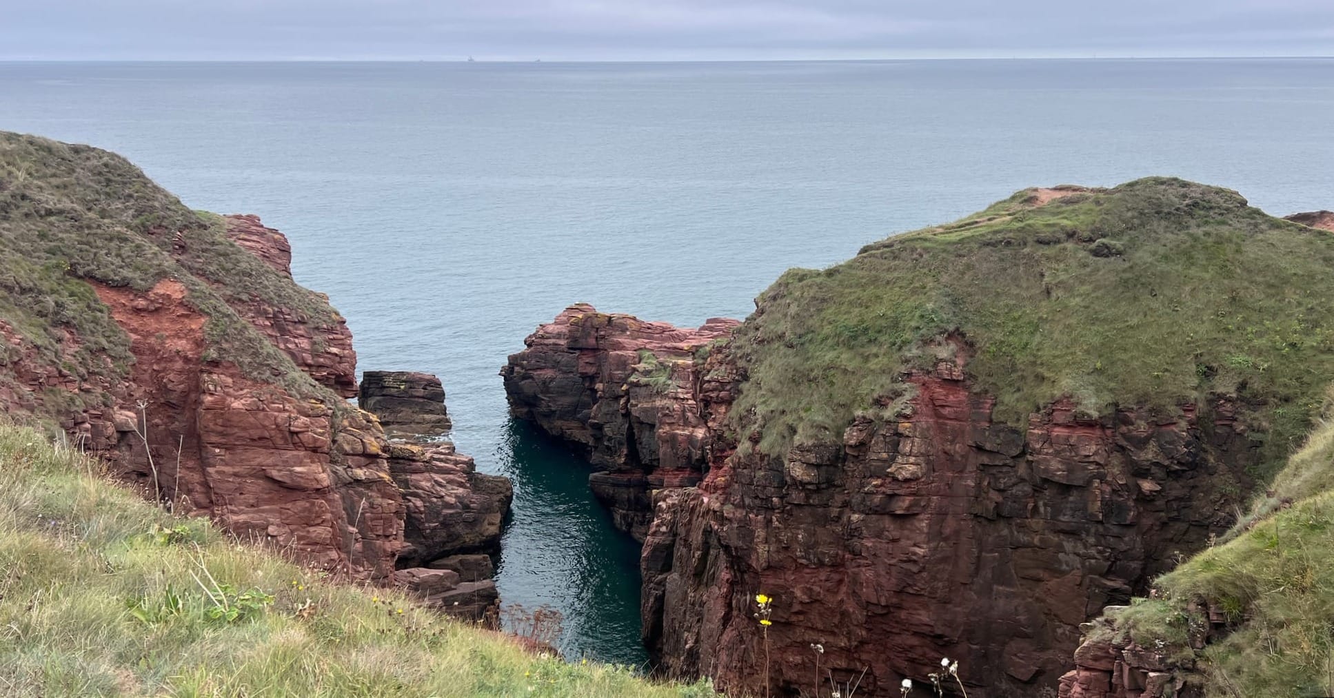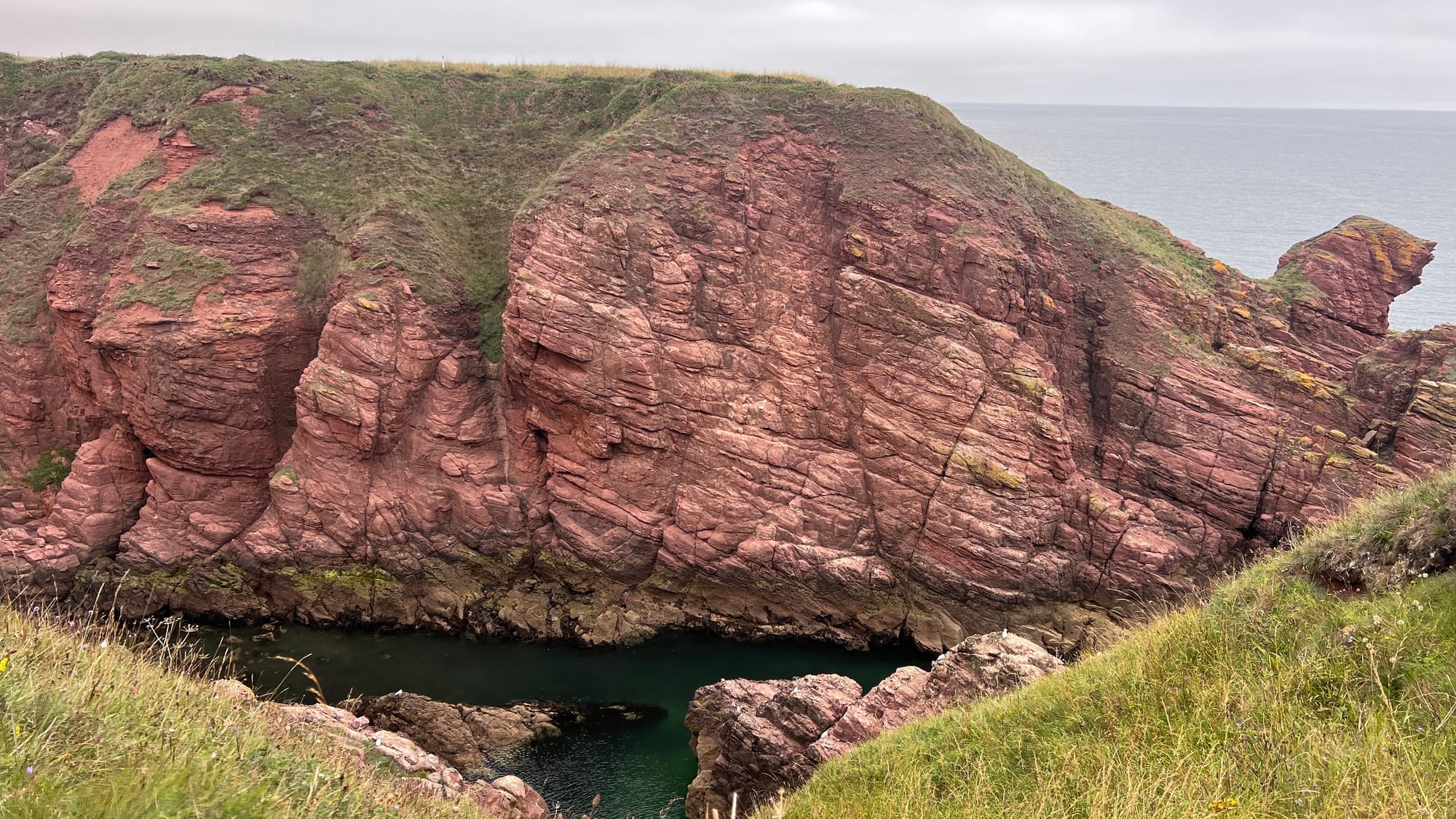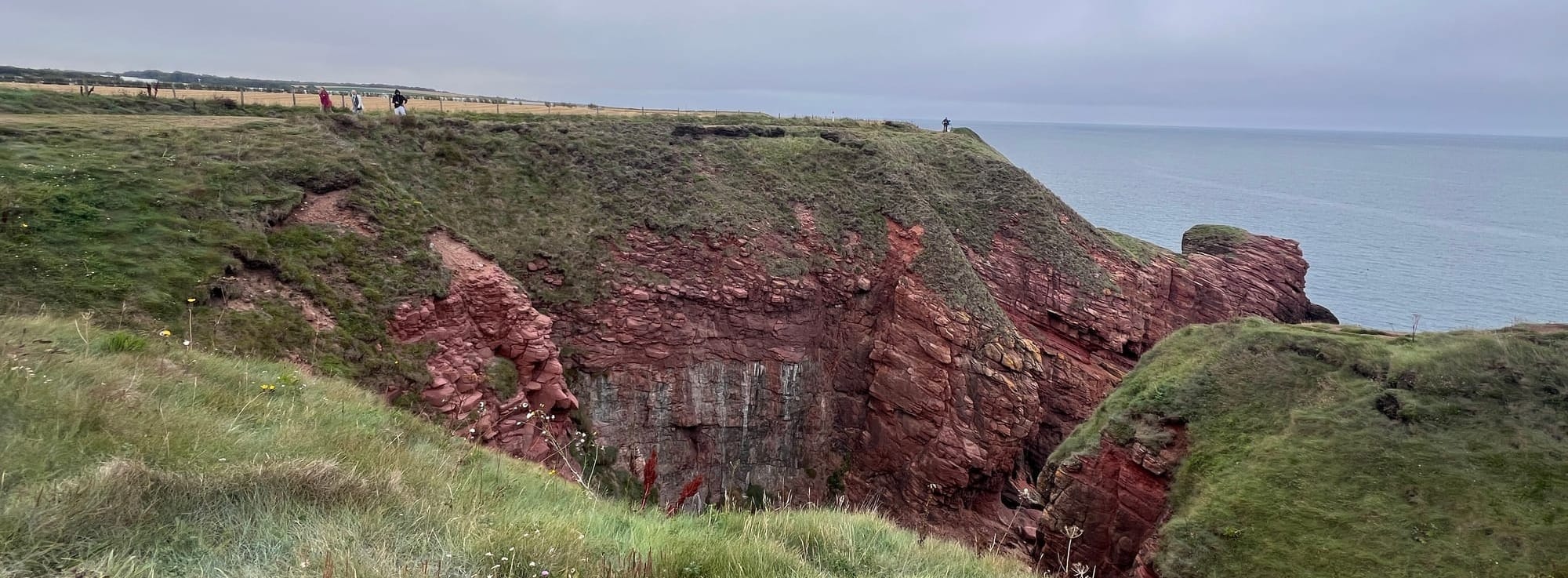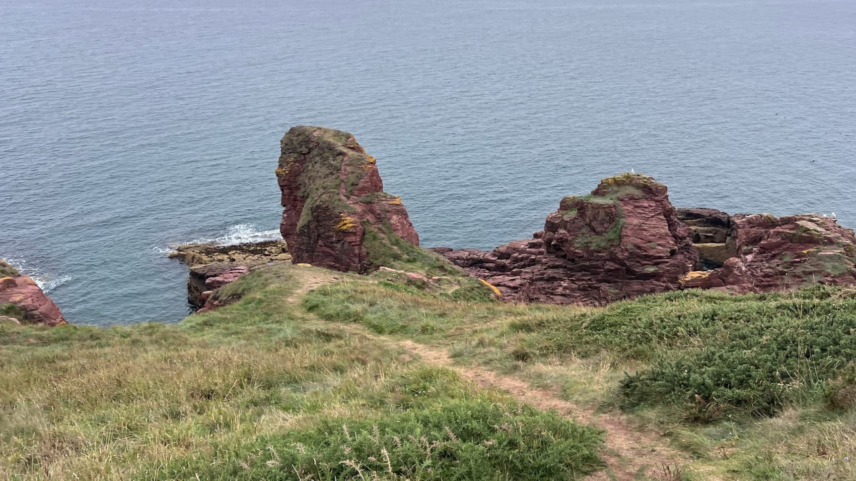 The Arbroath Cliff Trail is incredible—spectacular! The cliffs presented a stark contrast, even a little shocking after walking through the urban, concrete front of Arbroath. It immediately reminded us both of the South West Coastal Path (SWCP) in England.