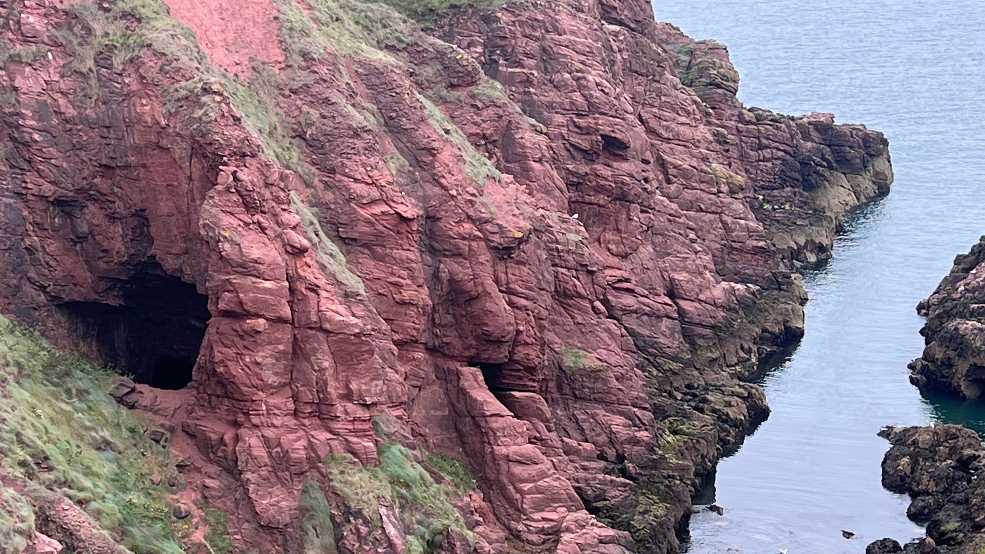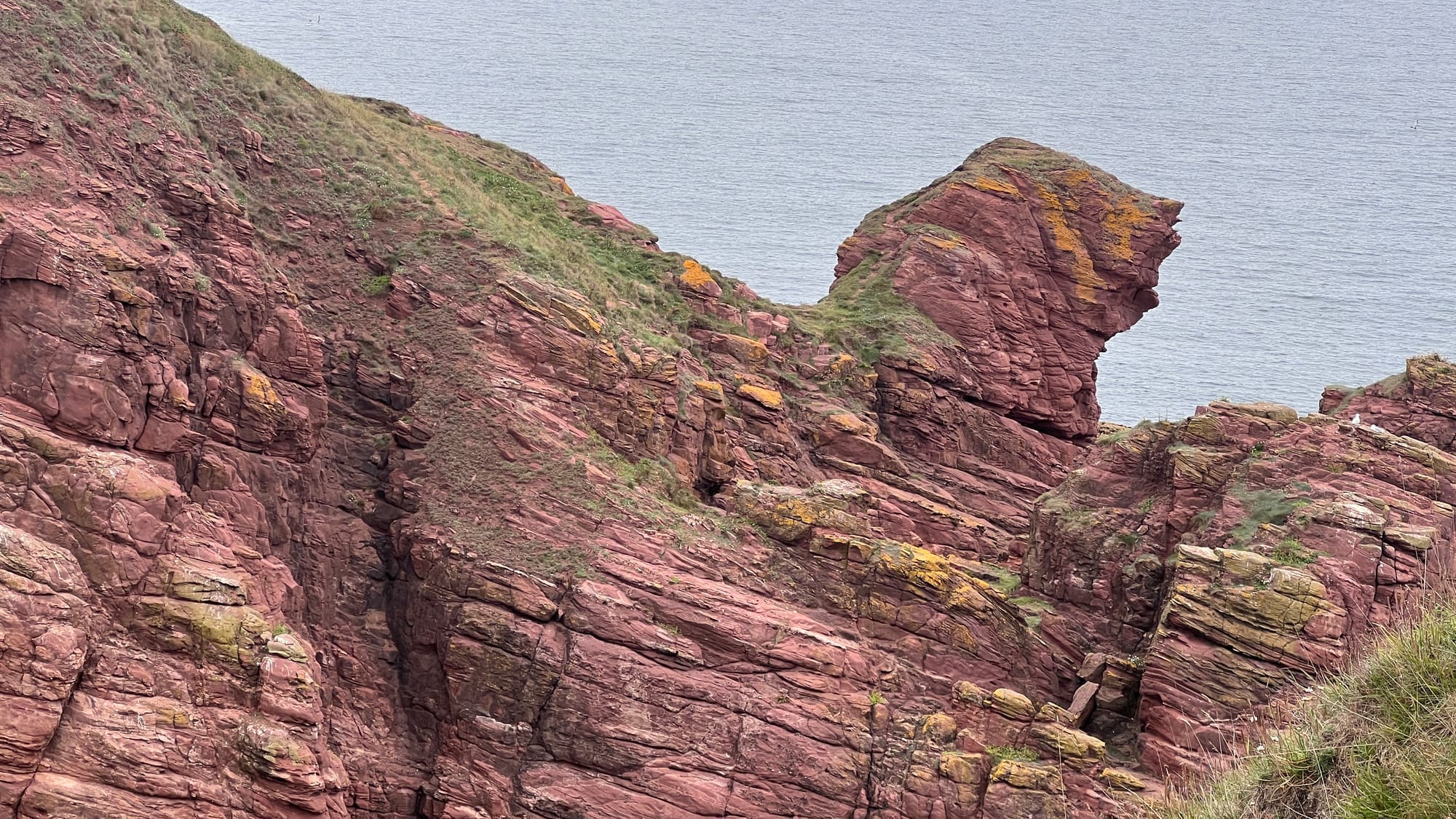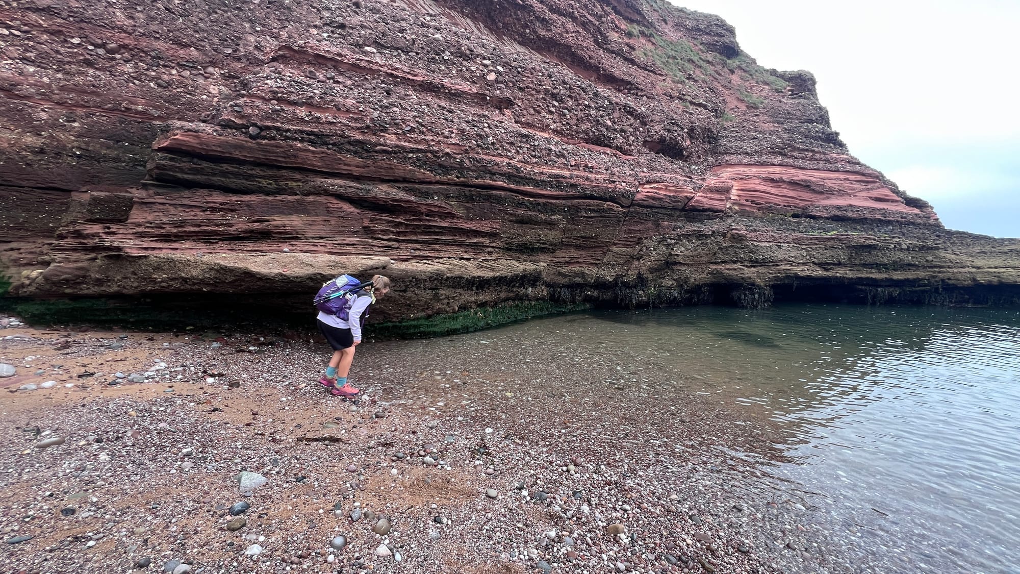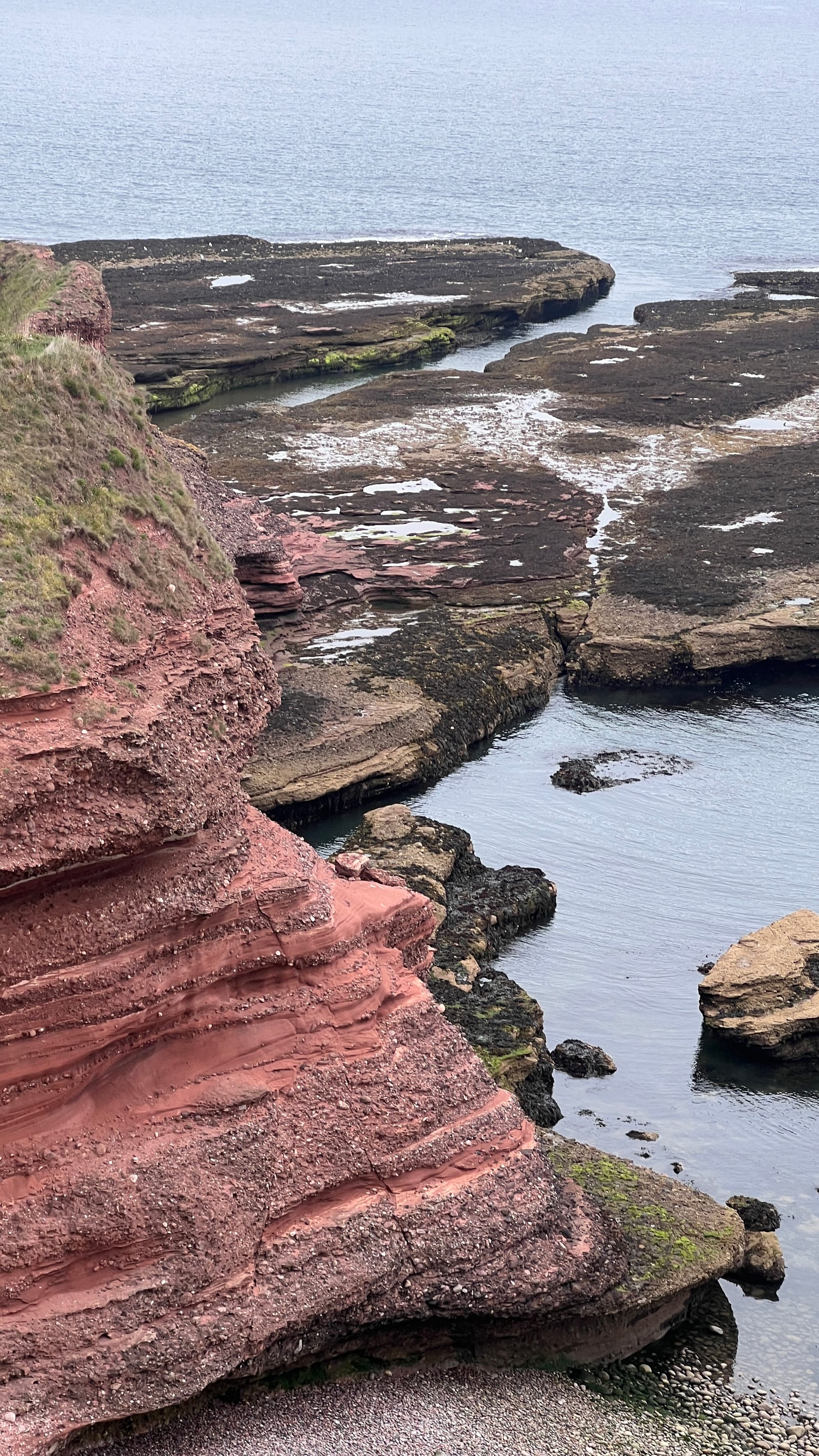 Descending into Carlingheugh Bay was the first time we got close enough to the cliffs to touch them. The cliffs are made of sandstone and conglomerate, which formed an ancient seabed. Over the years, the layers have accumulated, been compressed, bent, twisted, and pushed into the fascinating formations we see today! Seeing them up close and touching them was like stepping back in time. It filled us both with wonder to imagine what these stones might have witnessed over the millennia.