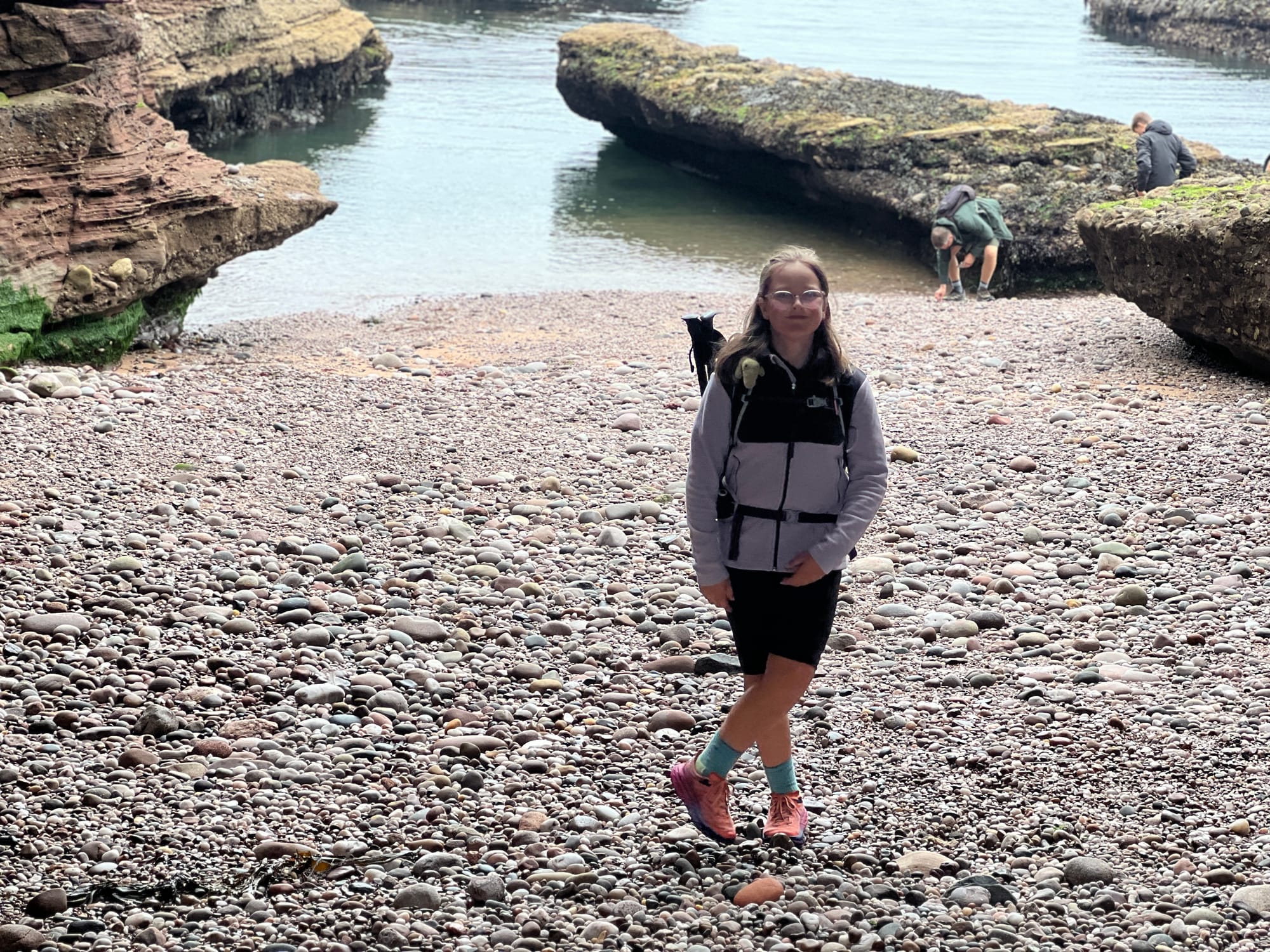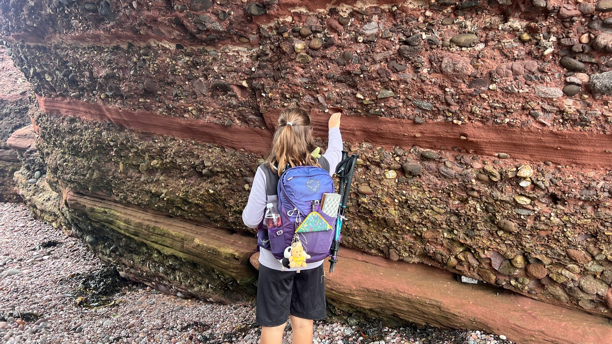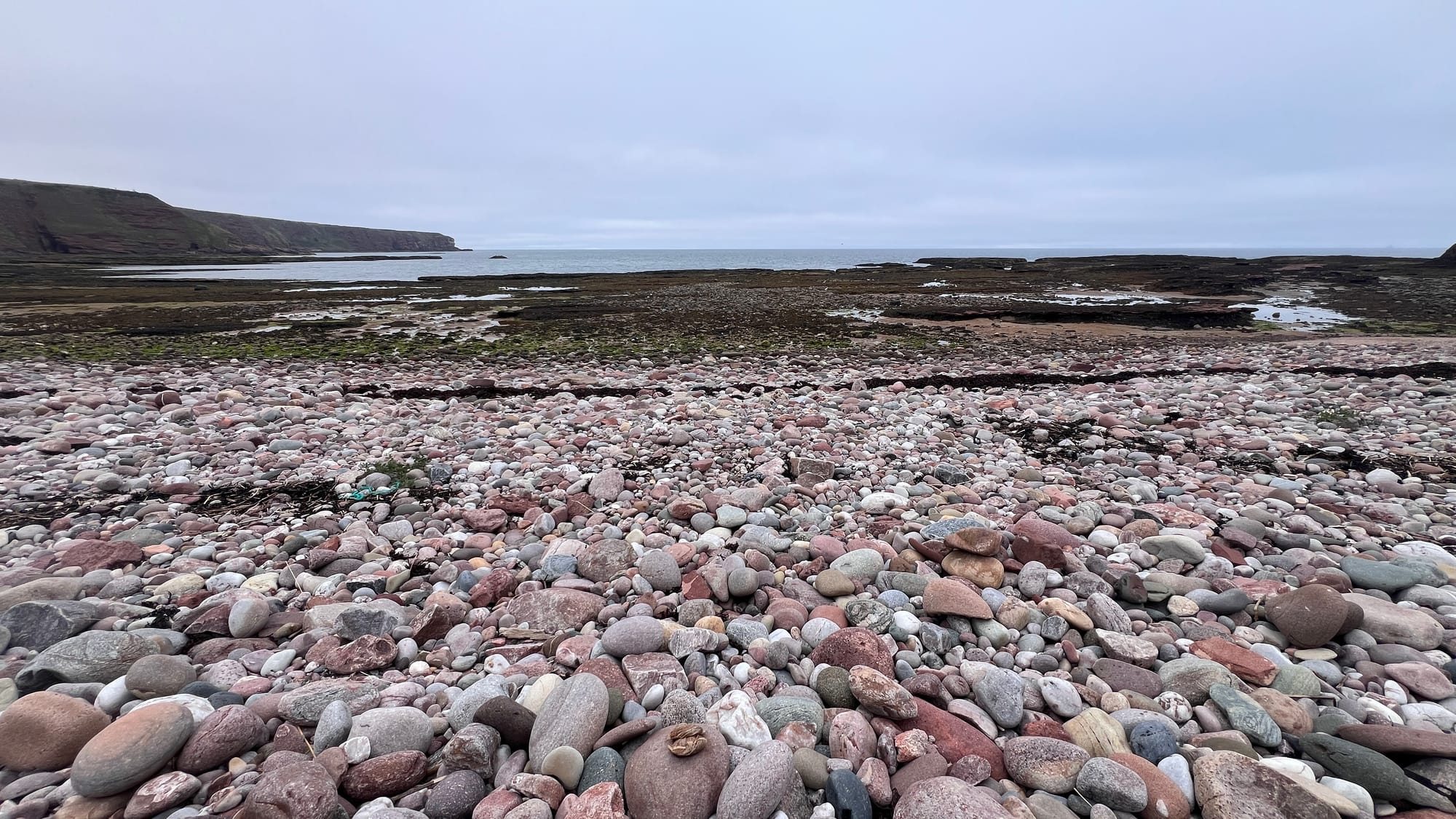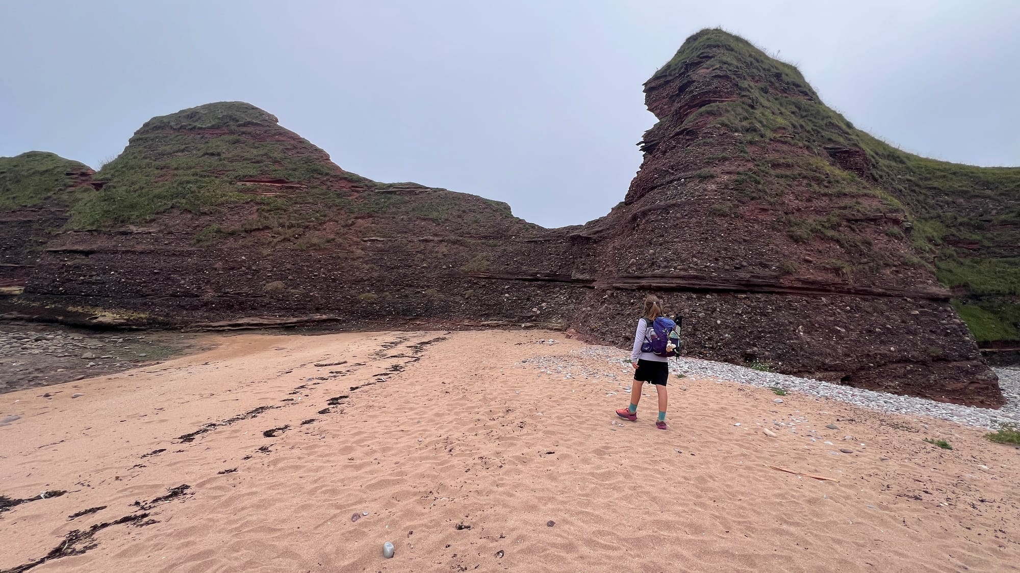 Descending into Carlingheugh Bay was the first time we got close enough to the cliffs to touch them. The cliffs are made of sandstone and conglomerate, which formed an ancient seabed. Over the years, the layers have accumulated, been compressed, bent, twisted, and pushed into the fascinating formations we see today! Seeing them up close and touching them was like stepping back in time. It filled us both with wonder to imagine what these stones might have witnessed over the millennia.