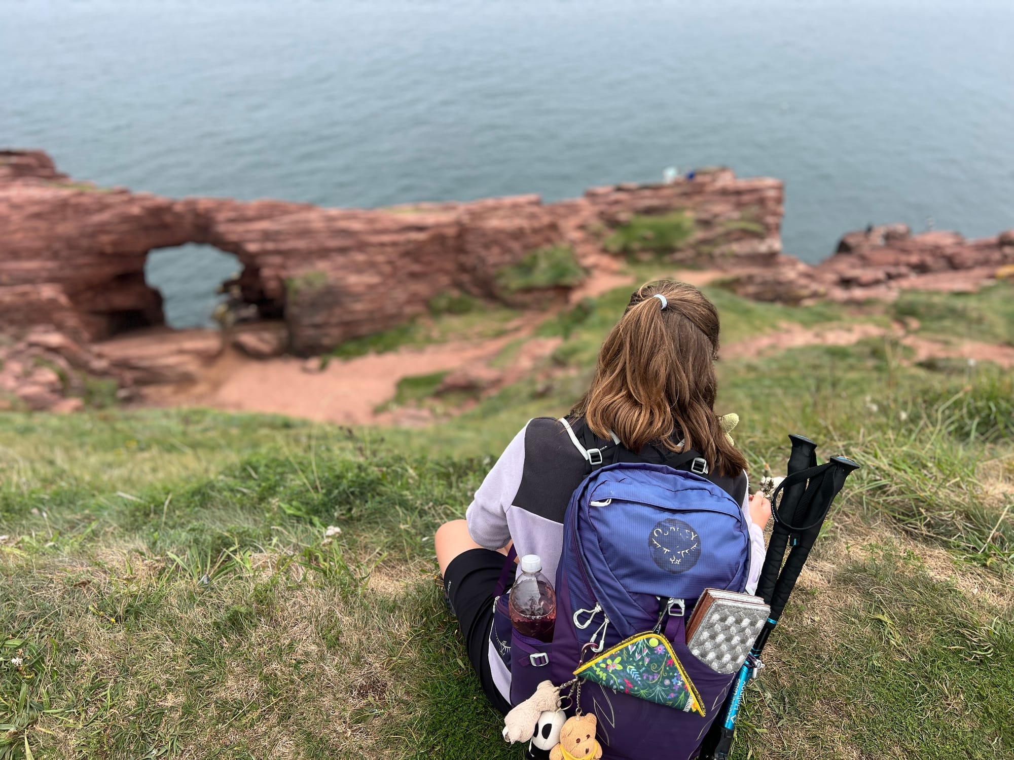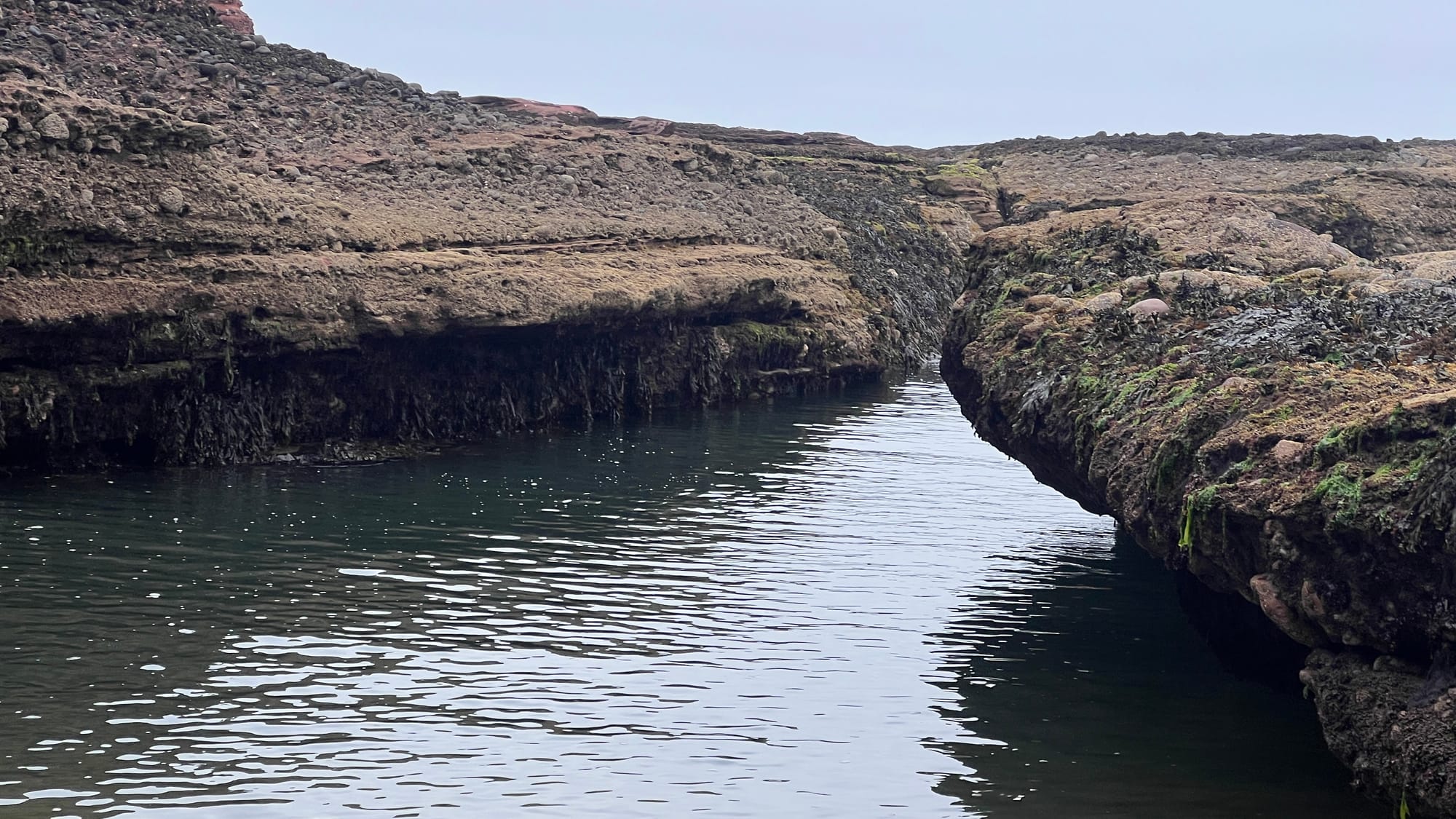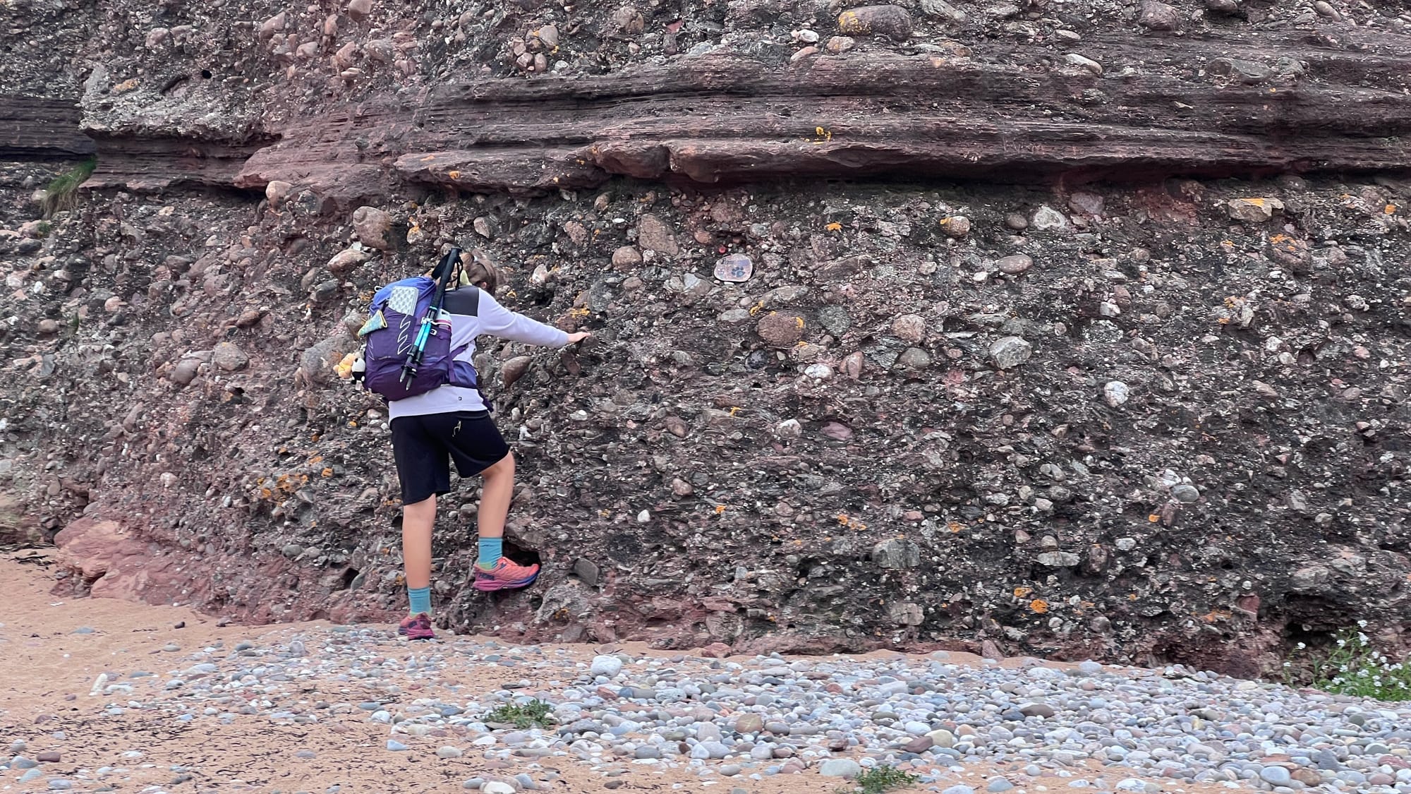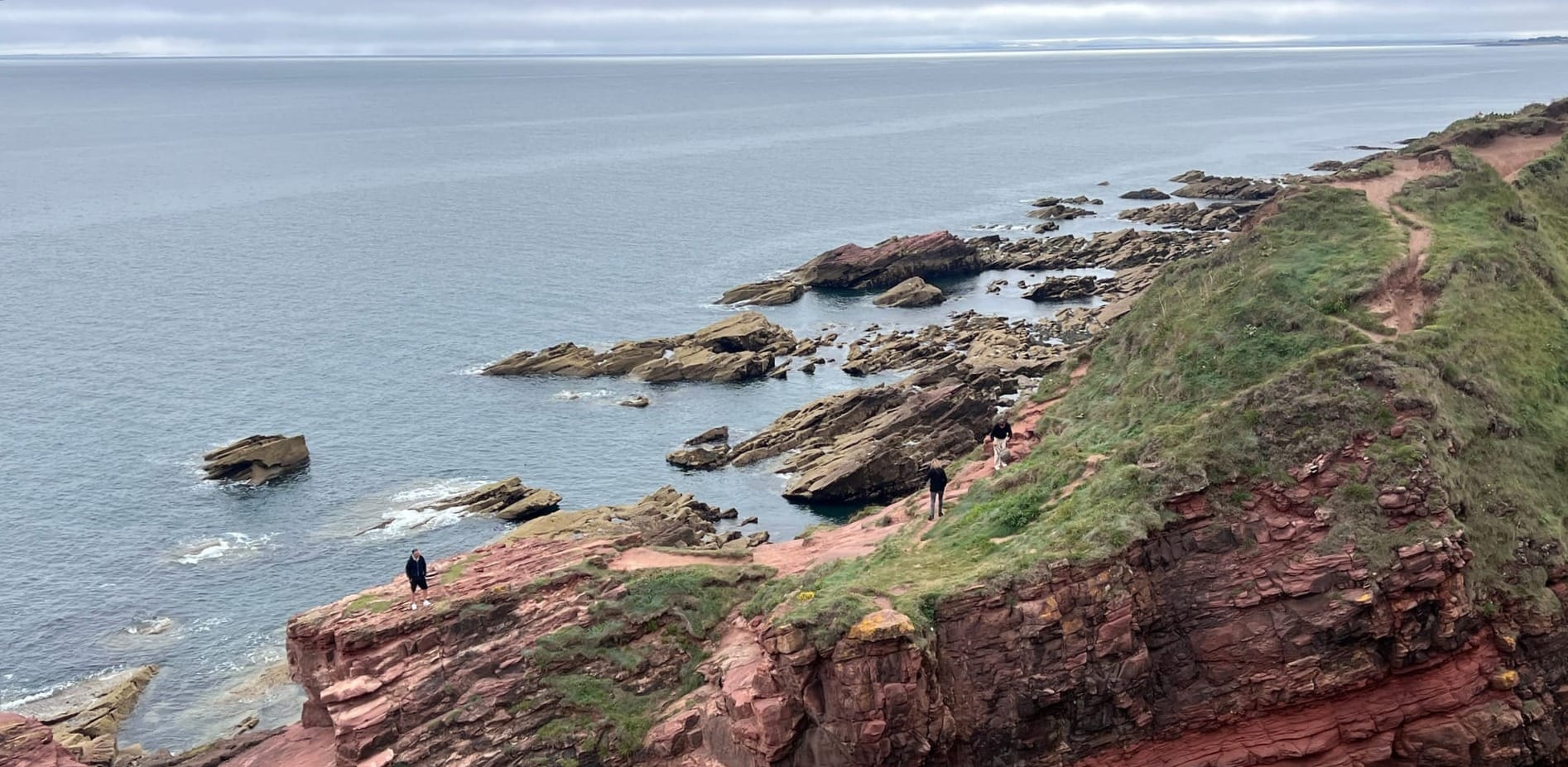 Descending into Carlingheugh Bay was the first time we got close enough to the cliffs to touch them. The cliffs are made of sandstone and conglomerate, which formed an ancient seabed. Over the years, the layers have accumulated, been compressed, bent, twisted, and pushed into the fascinating formations we see today! Seeing them up close and touching them was like stepping back in time. It filled us both with wonder to imagine what these stones might have witnessed over the millennia.