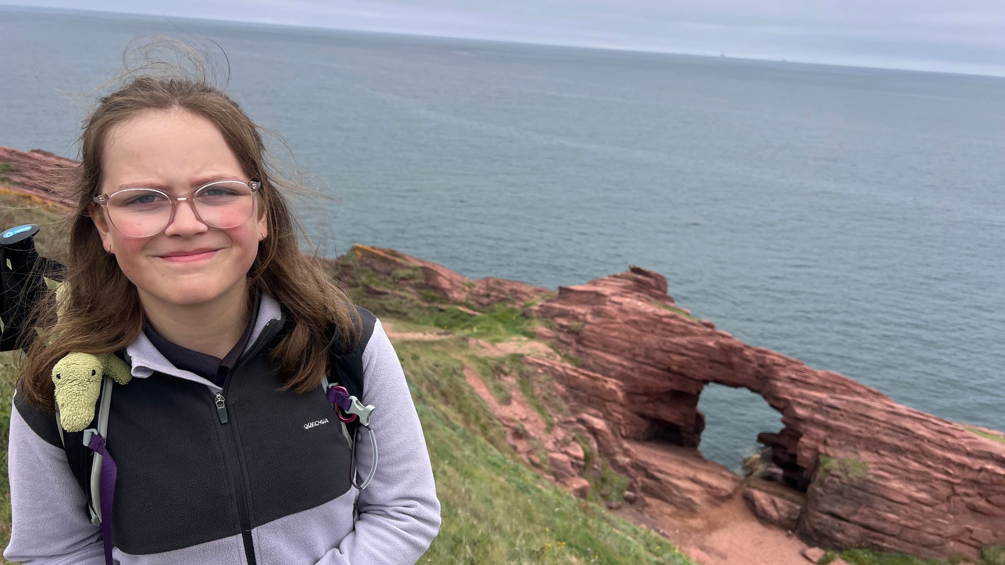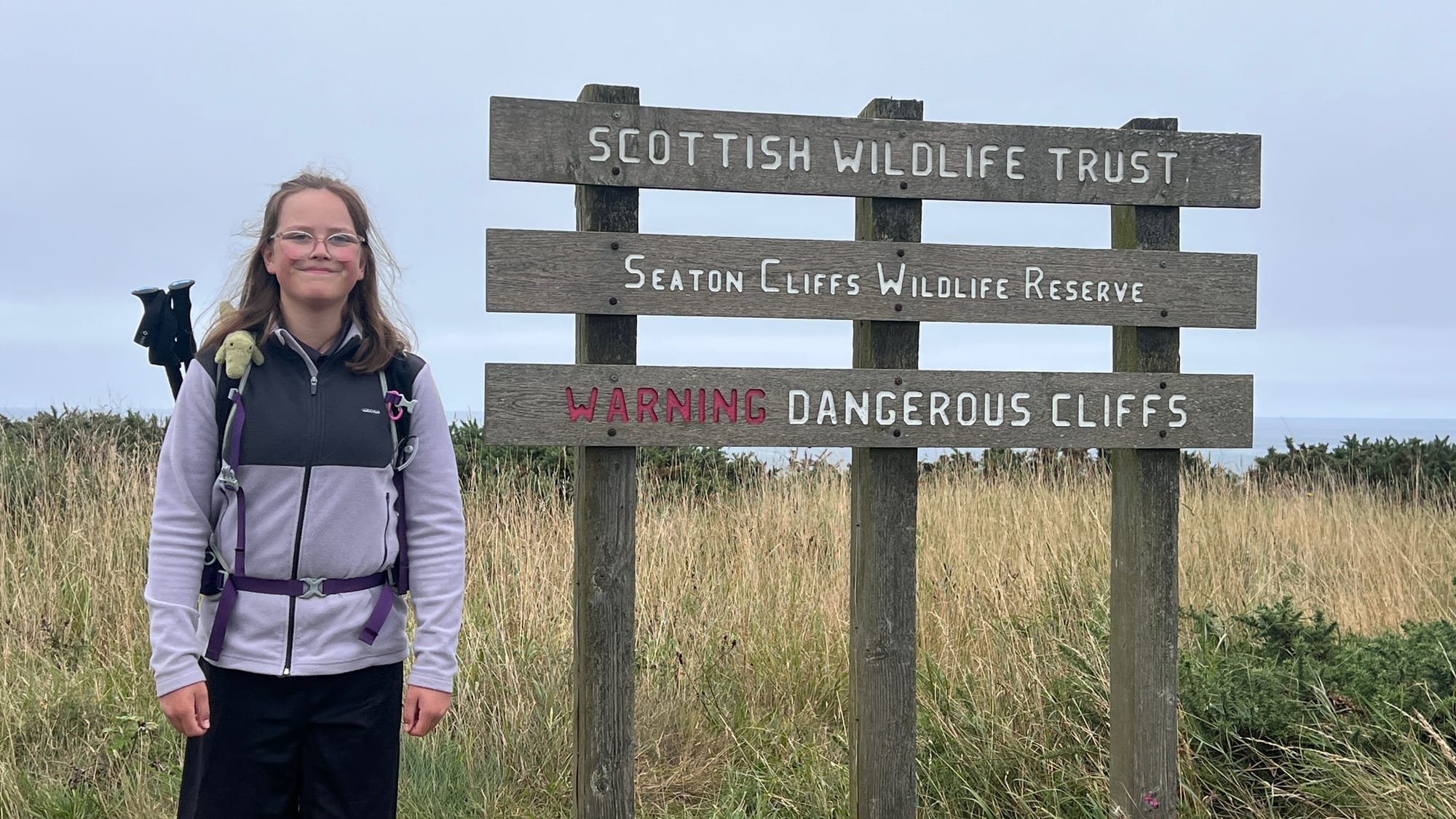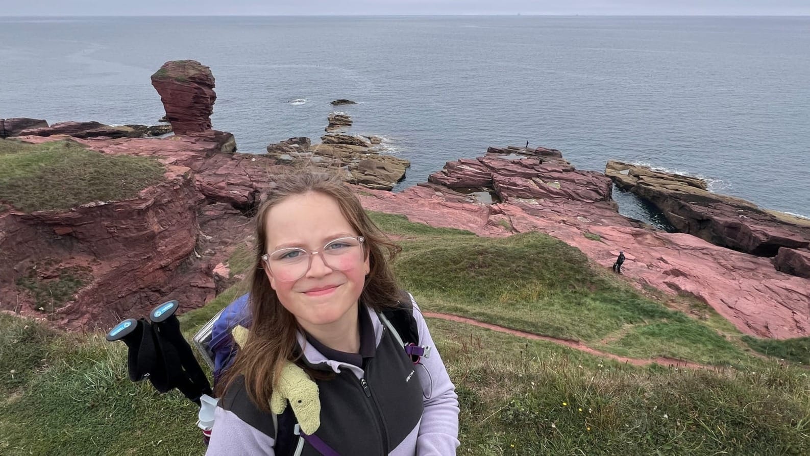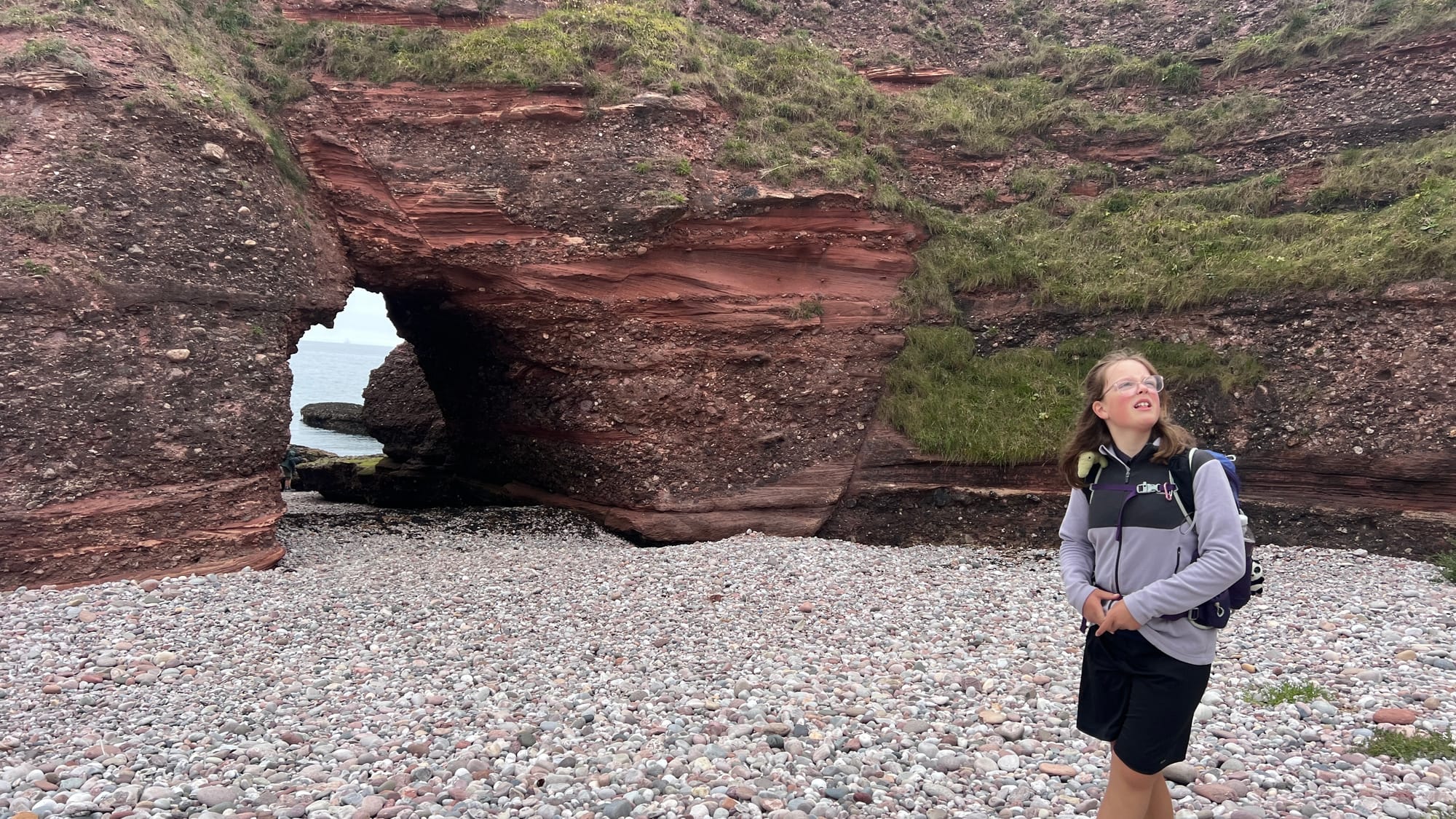 Descending into Carlingheugh Bay was the first time we got close enough to the cliffs to touch them. The cliffs are made of sandstone and conglomerate, which formed an ancient seabed. Over the years, the layers have accumulated, been compressed, bent, twisted, and pushed into the fascinating formations we see today! Seeing them up close and touching them was like stepping back in time. It filled us both with wonder to imagine what these stones might have witnessed over the millennia.