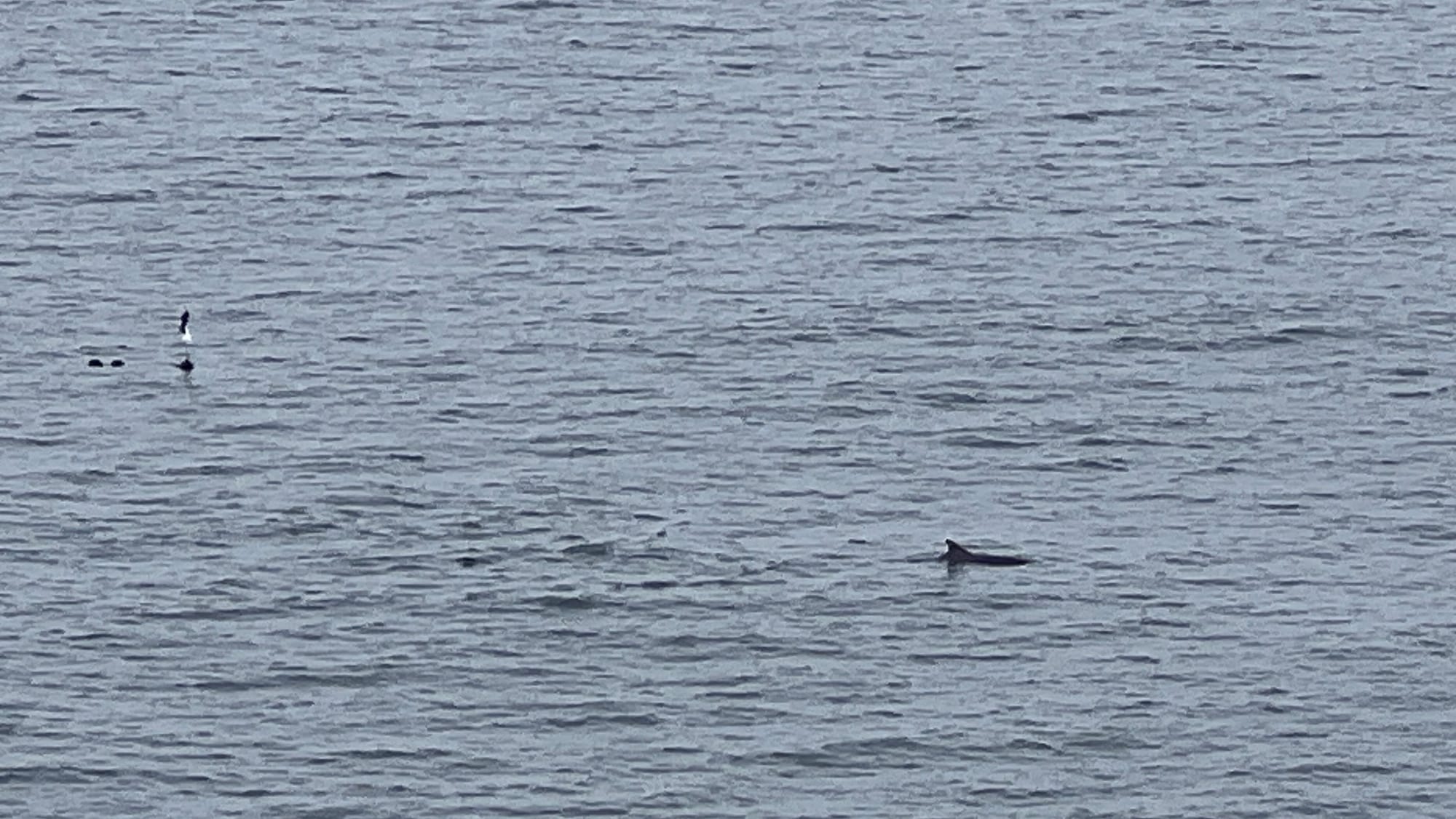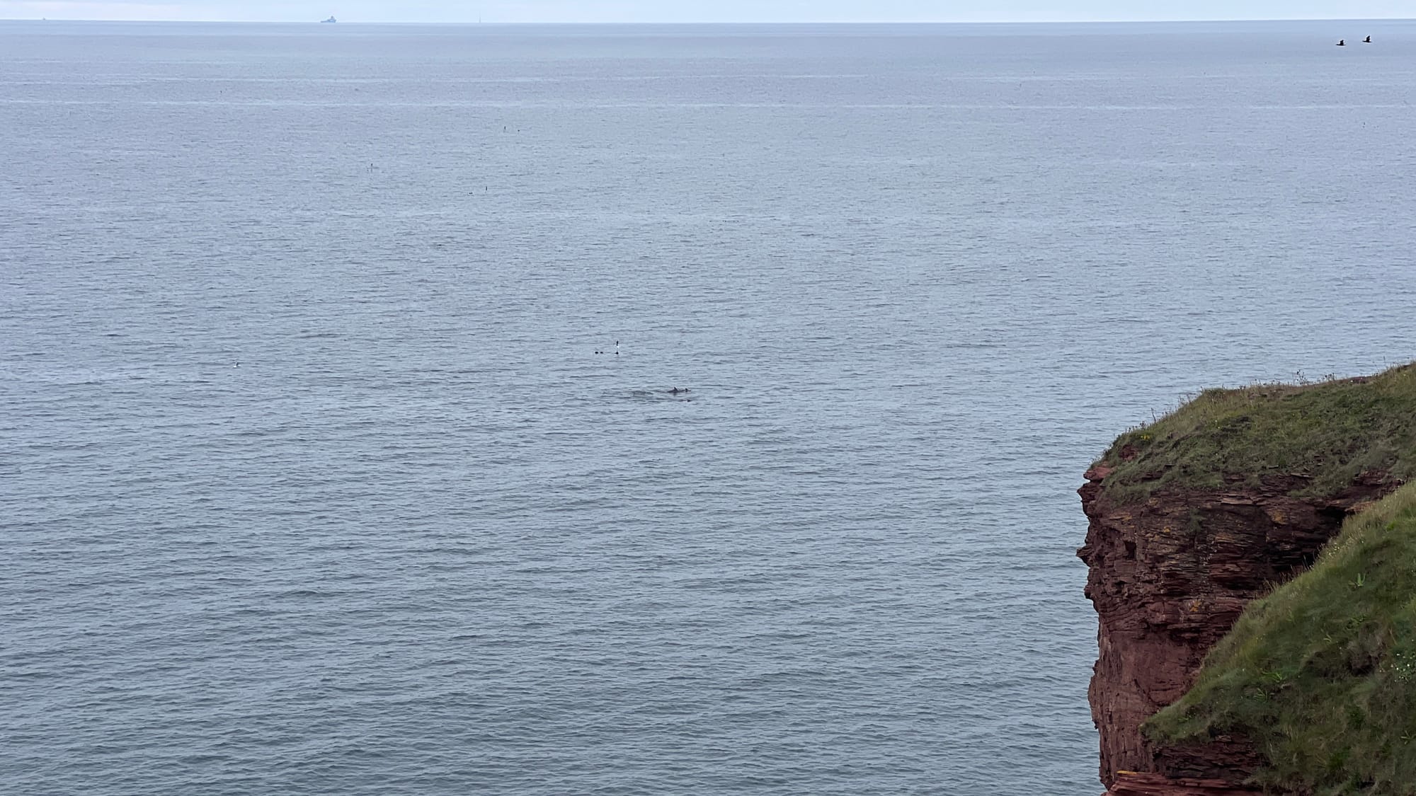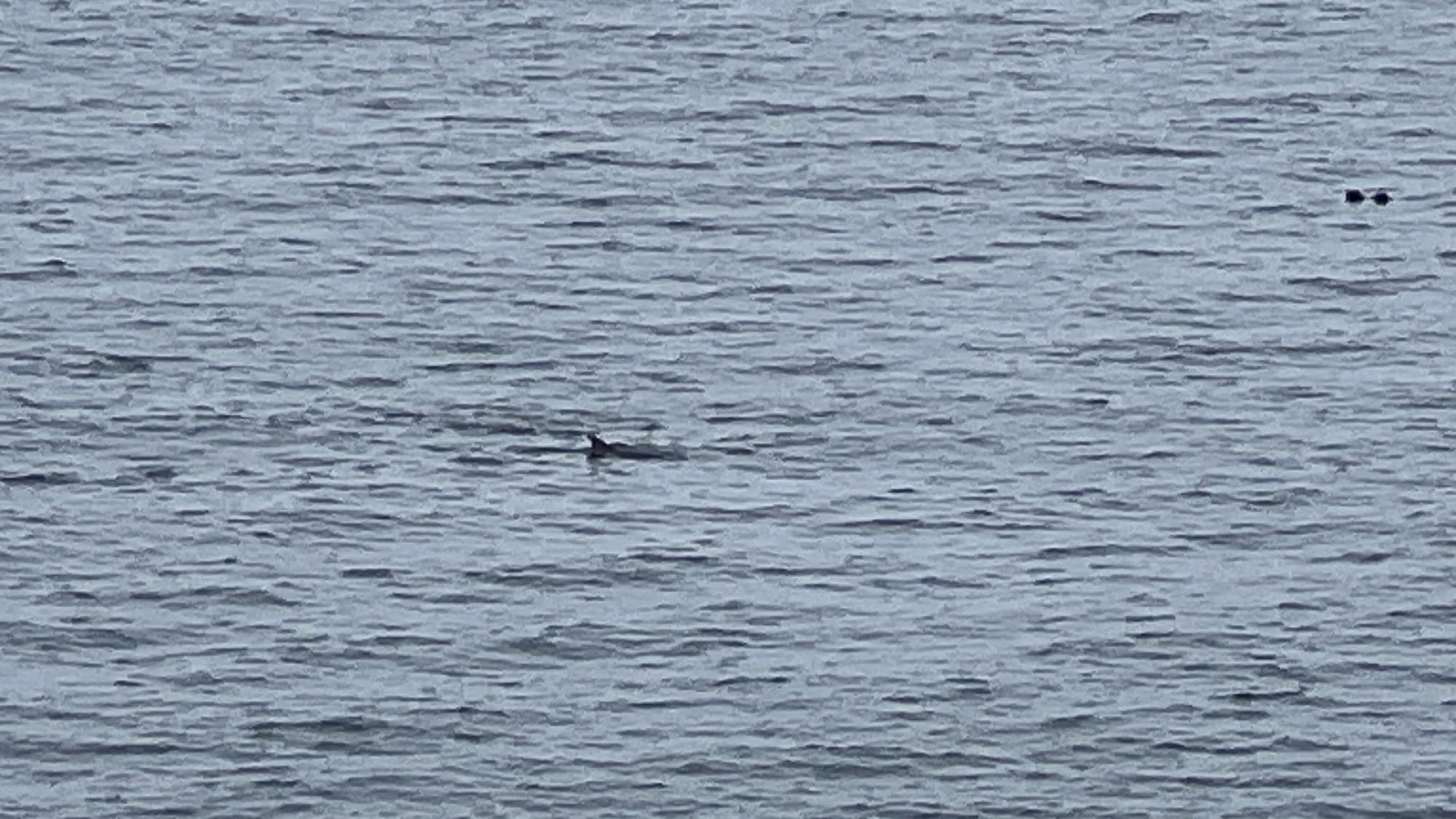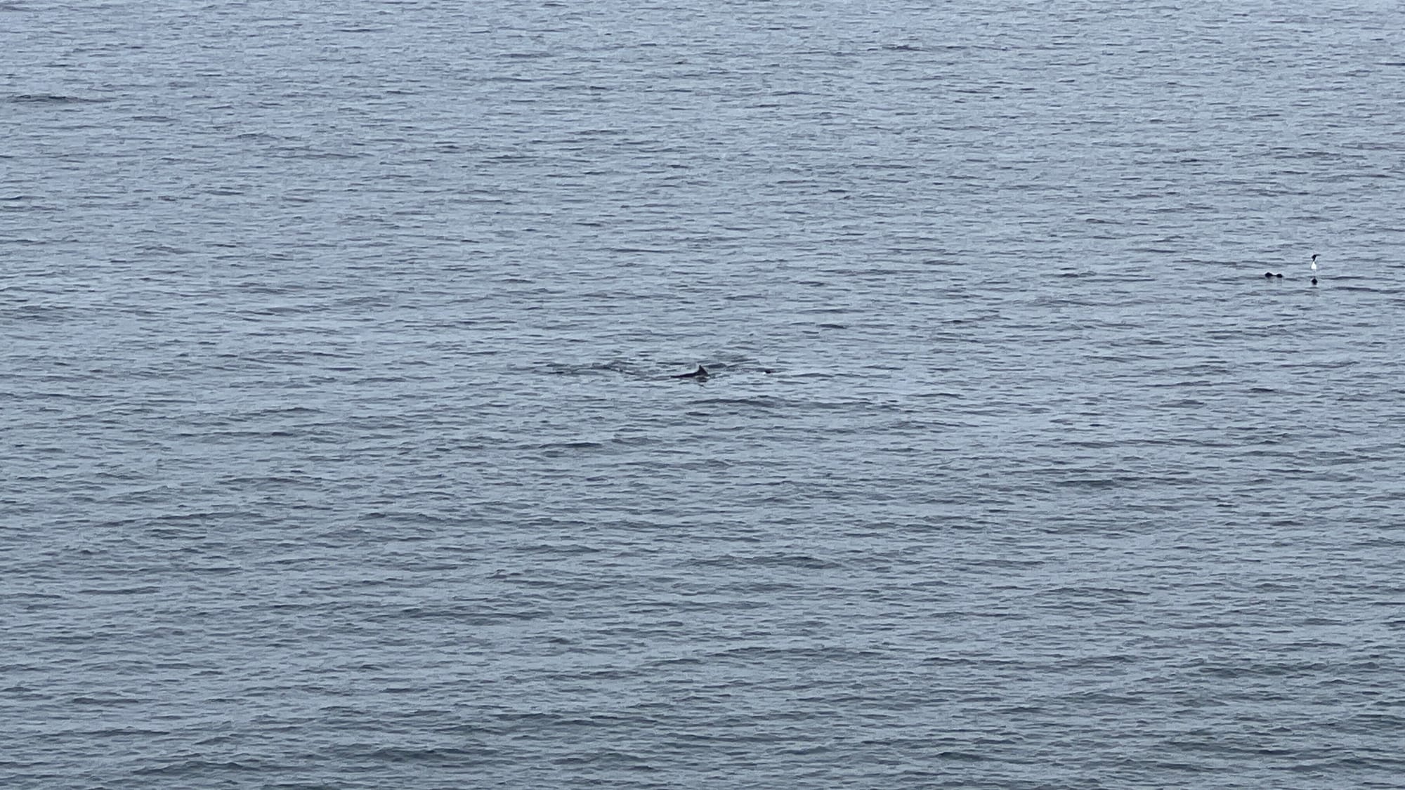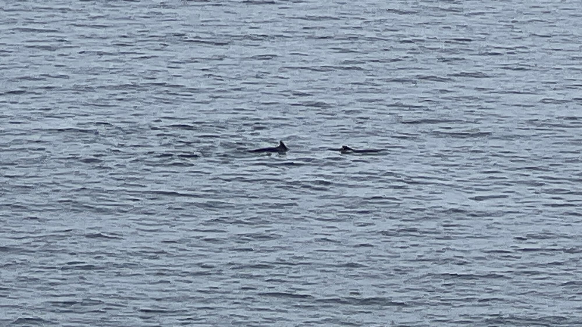 As we walked, Eve was gazing out to sea when she suddenly and dramatically asked, "What's that?" I looked in the general direction she was pointing and saw nothing, so she responded with something that sounded like, "Flags?" We had seen many flags along this section of coast used by fishermen to indicate crab and lobster pots, so we naively assumed this was what Eve had seen. "NO, they look like fins!" Eve insisted, but I still couldn't see them.