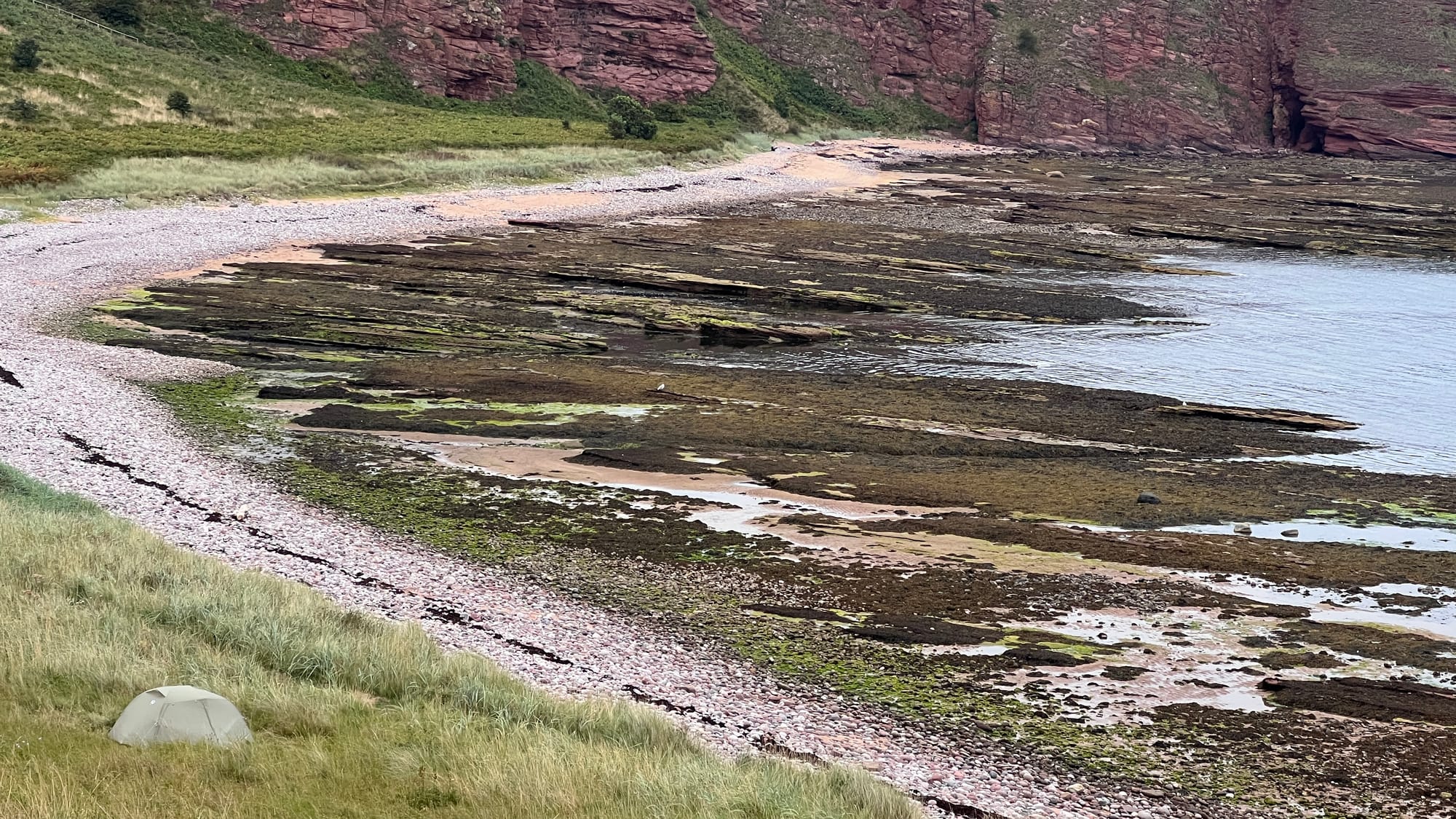 Finding a small camping spot wasn't hard. What was tough was finding water! We found a small trickle of water coming out of the cliffs near the place where we had walked down into Carlingheugh Bay. The problem was that it was surrounded by saturated mud and rubbish. I decided to climb carefully above the rubbish to find the water's source. It was clean. However, we both agreed to only use boiled water, so we limited ourselves to hot drinks, saving the water we had carried for overnight and the morning. We've used this procedure before, and it works well. We always try to keep some spare water for emergencies like this!