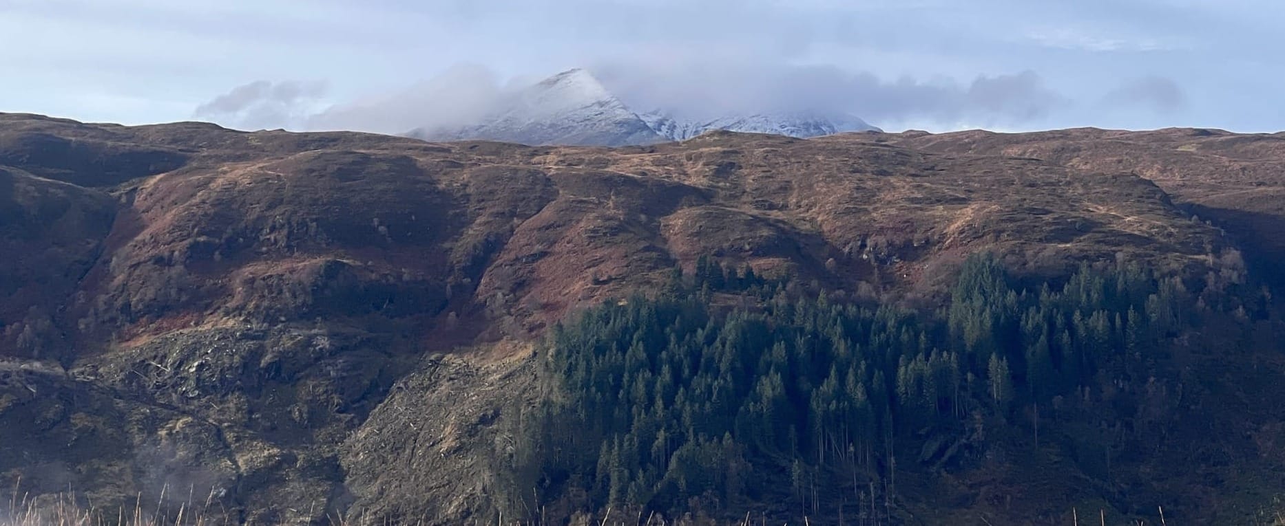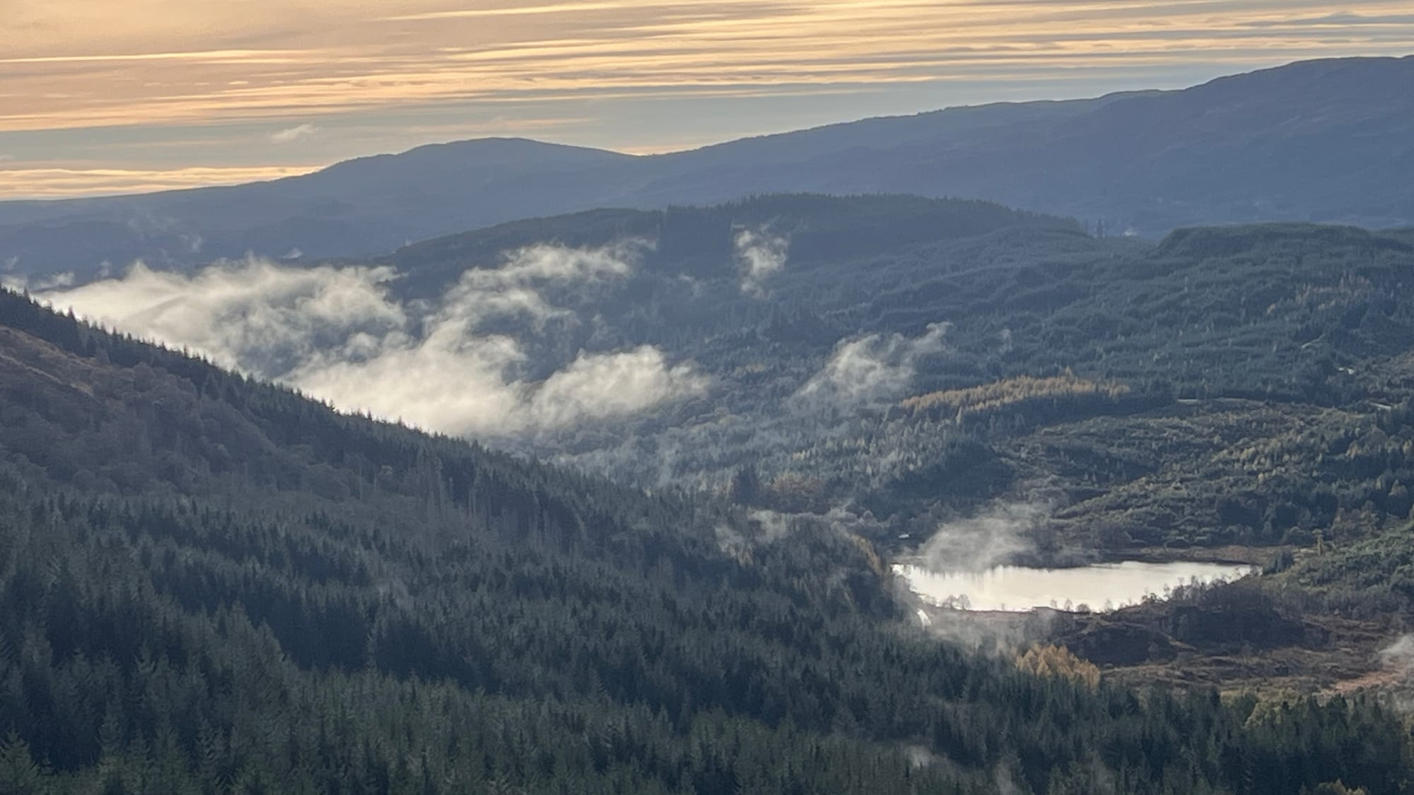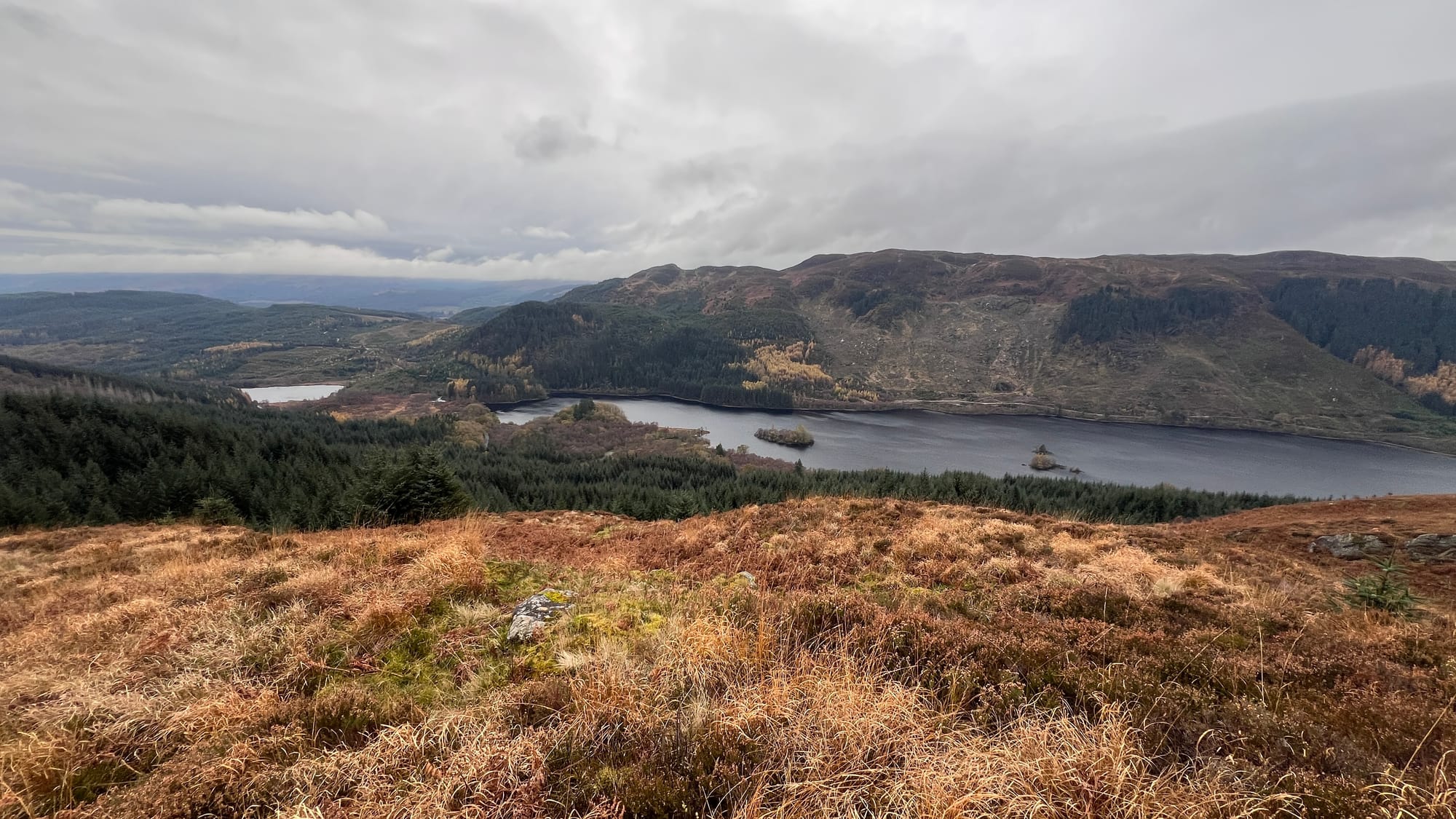 Standing at Bealach na Craoibhe, I paused in silence, listening to the wind stirring the air all around. My heart slowed as I stood in silence, the solitude of the landscape penetrating and refreshing the soul, giving me a deep sense of peace. Behind me, clouds were gathering, drifting down the glen, obscuring Loch Chon, before the grand reveal, like pulling back the curtain at the theatre. The forests formed a tapestry of pine green, burnt brown, and yellow hues: Loch Chon, a giant dark black mirror reflecting the hills behind. Nature was putting on its very own show, and I was the only spectator.