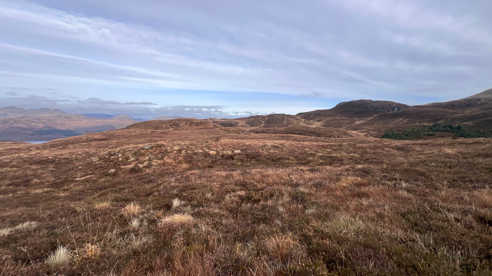 Continuing, I inadvertently walked into a patchwork of bottomless bog. For 20 minutes, I persisted in finding a way through, to no avail. Retreating to safe ground, I made a wide arc around towards the cairn close to Sgiath Mhor, avoiding the lower ground.