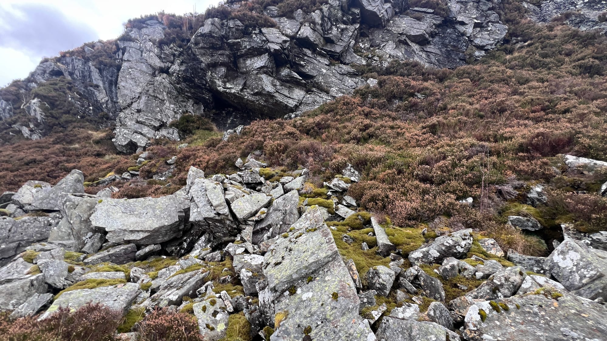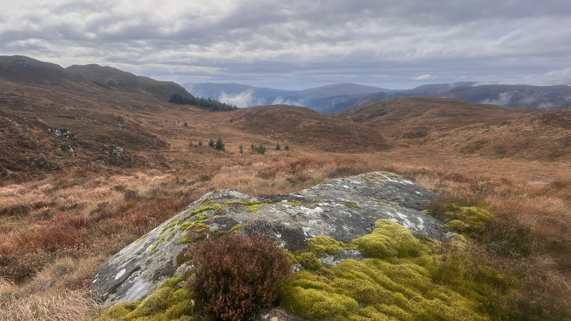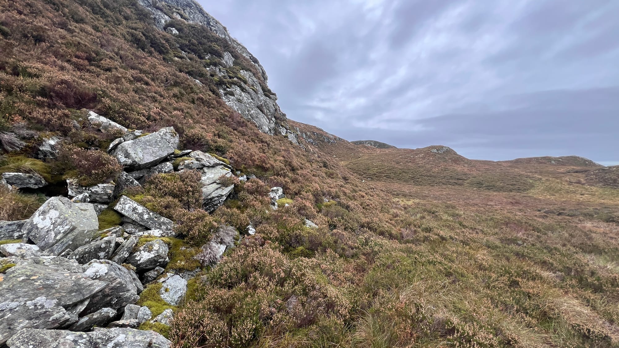 The terrain was difficult to walk over. The heather was coarse and woody, and I got tangled in the decaying remains of ferns and bracken, causing me to trip and stumble. Progress was slow as I walked from one knoll to the next.