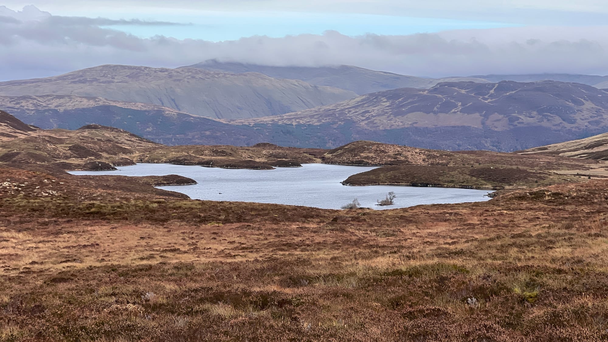My initial idea was to summit the small hill to get a good perspective overlooking Loch Tinker. As I rounded the cairn to start the short ascent, Loch Tinker came into view, and I immediately abandoned plans to climb higher. I made a beeline straight for Loch Tinker, walking through thigh-high grass and heather. This wasnât my best decision of the day.