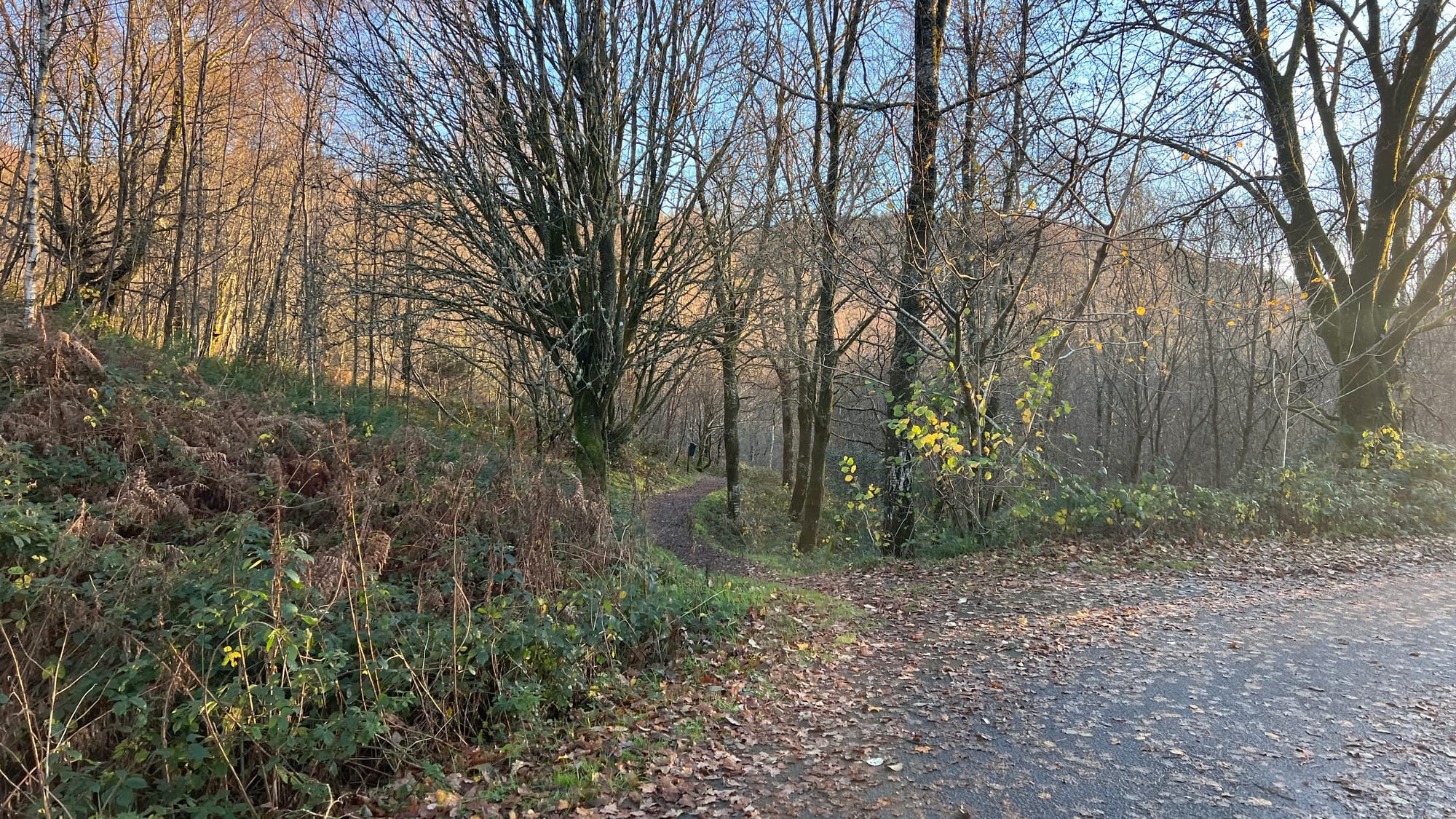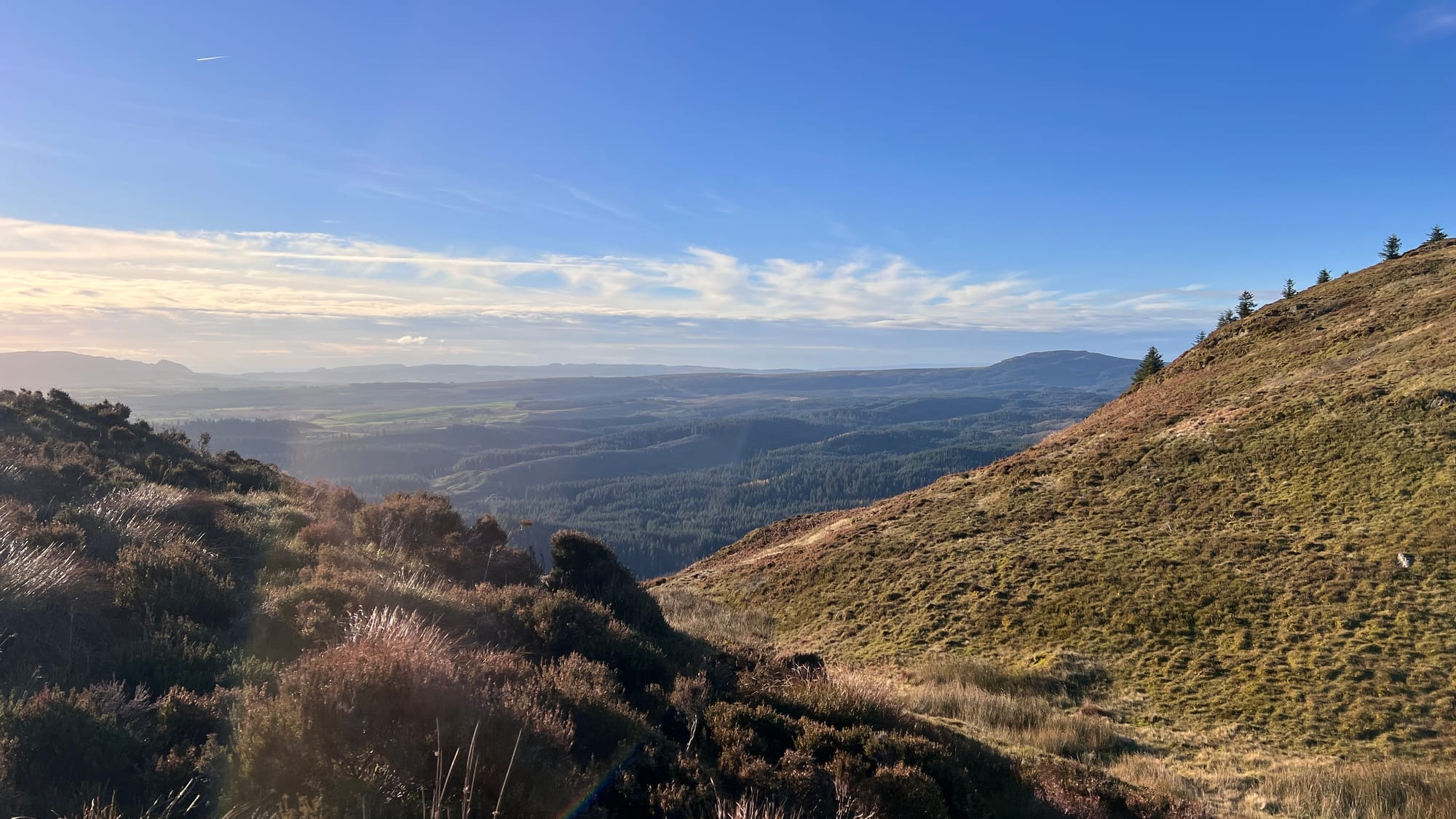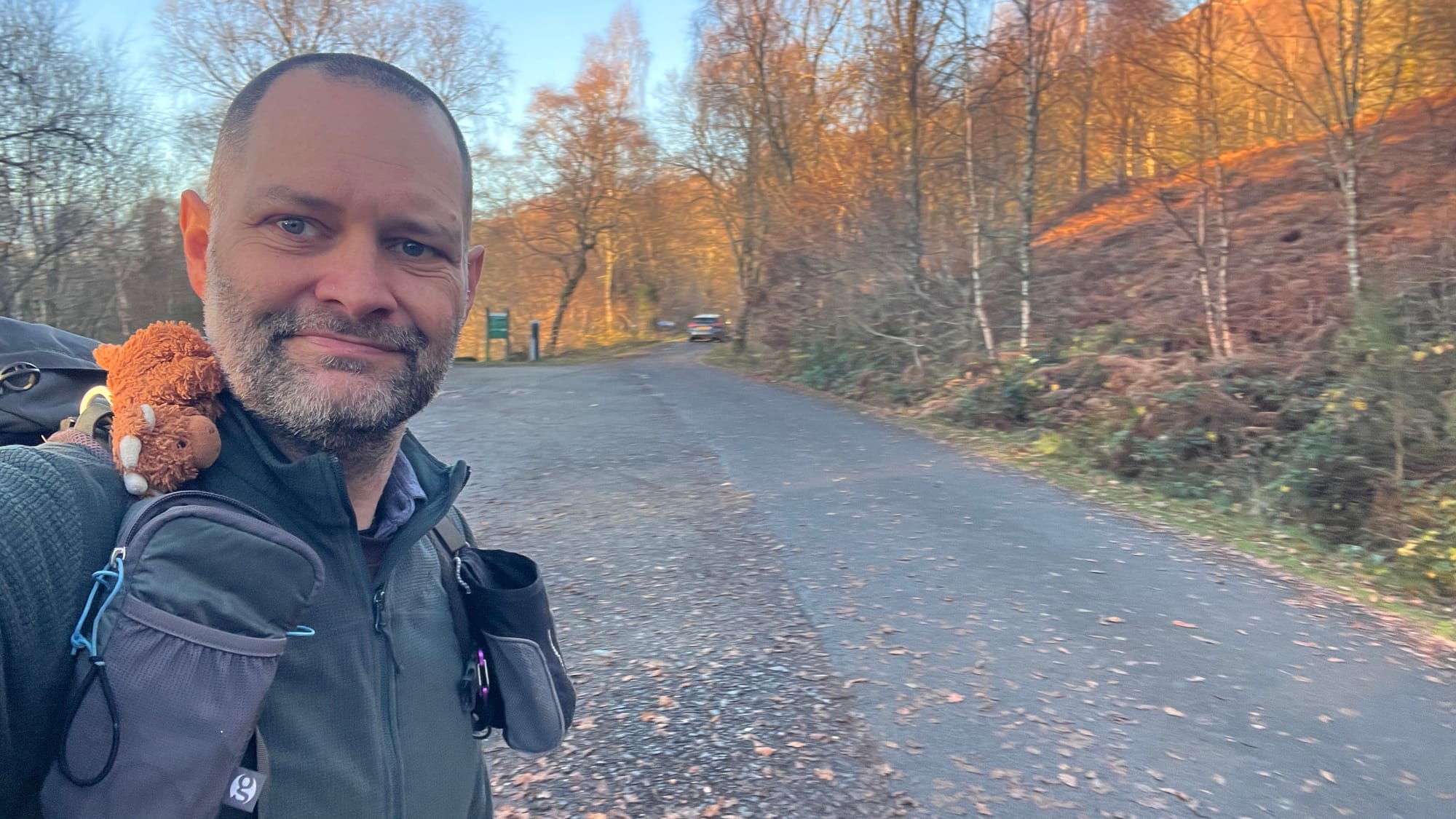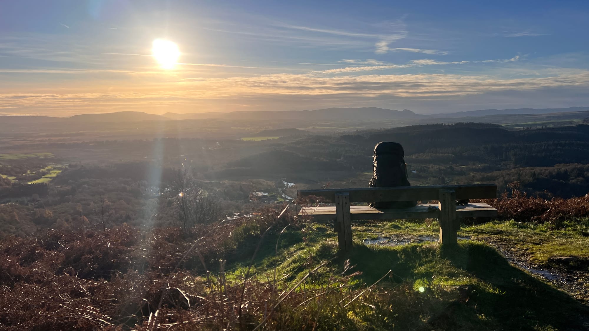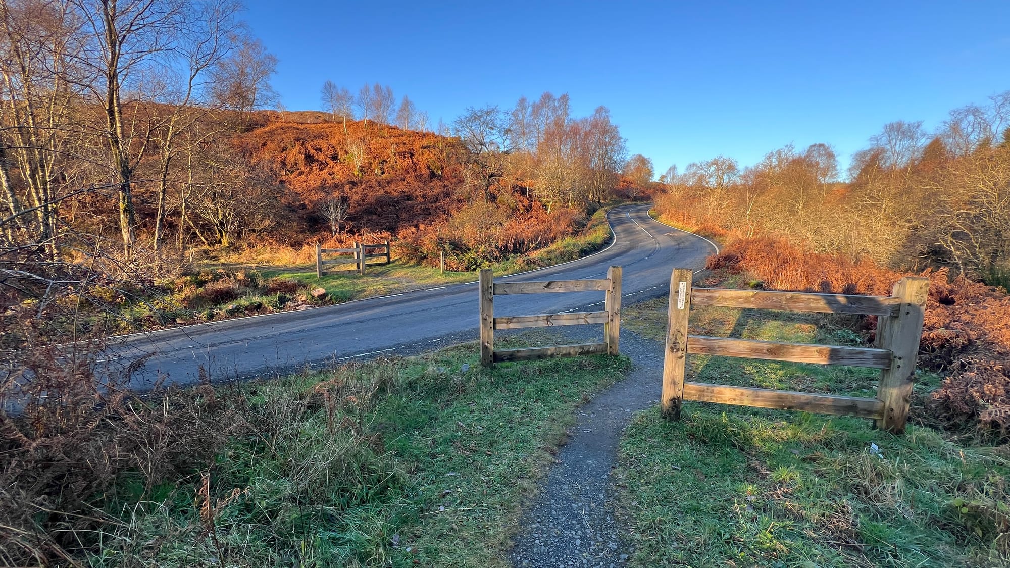 Starting at The Lodge Forest Visitors Centre, follow the forest path located on the northeast corner of the car park until you reach the trail on your right, next to a small berm. Follow the path past the waterfall on your right until you arrive at A821 Dukes Pass. Cross the road and continue along the path directly ahead. The path is well-maintained and gradually winds uphill. Eventually, you will reach a bench offering your first views over the lowlands.