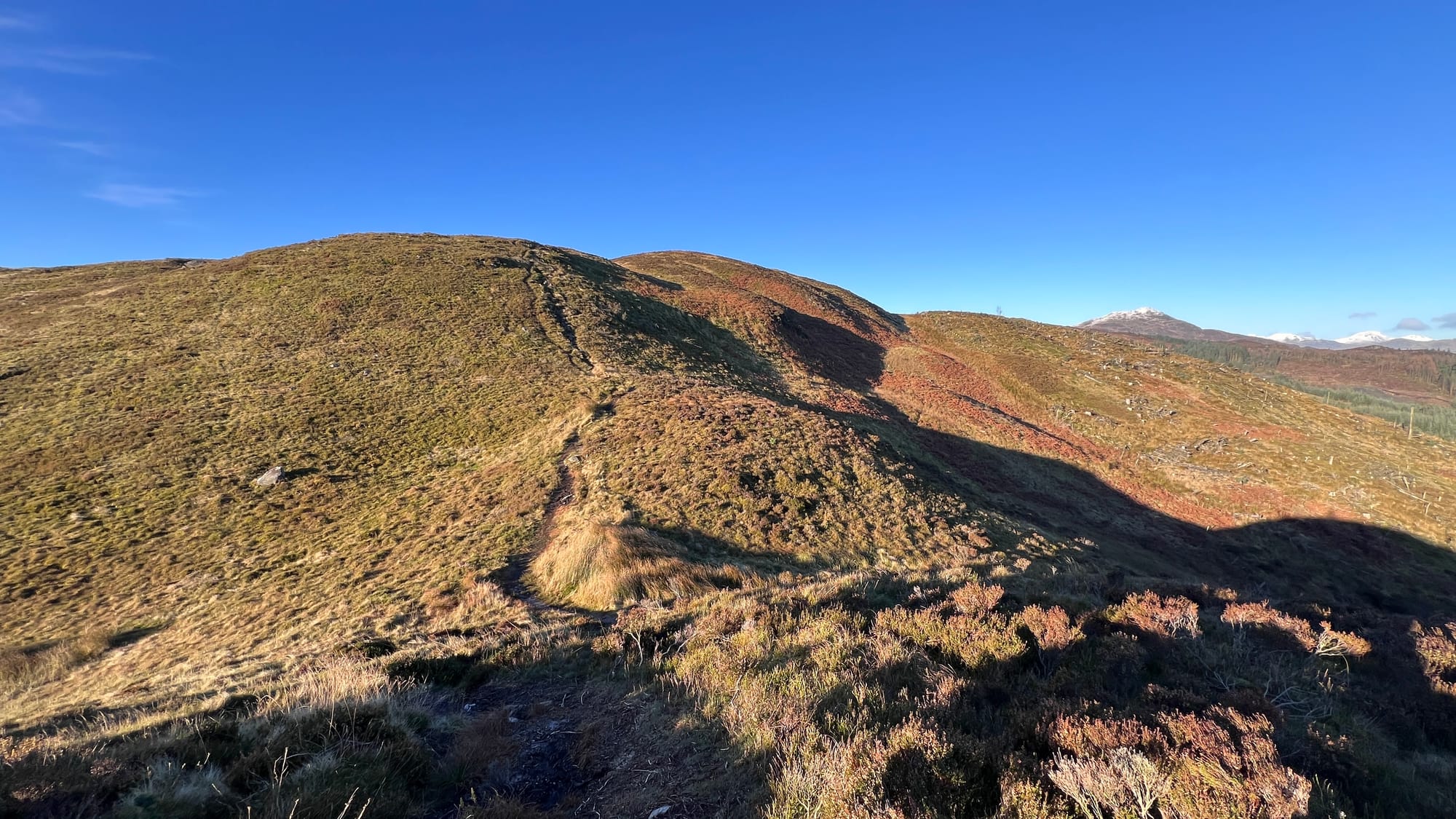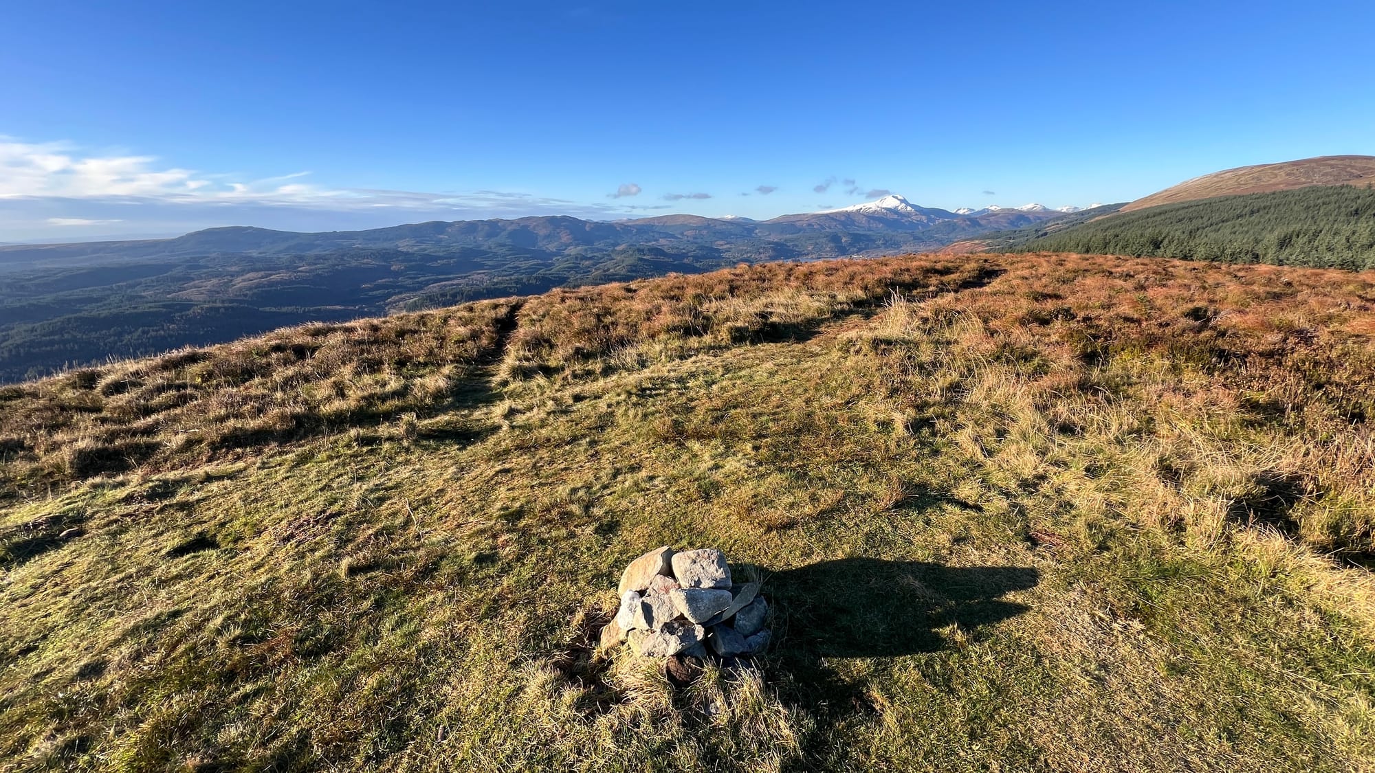 Following the trail, the summit comes with little warning, marked by a tiny cairn that sometimes disappears, perhaps by locals who remove it, before it reappears some time later! The most noticeable feature upon reaching the summit is the view ahead of you over Loch Ard towards Kinlochard.