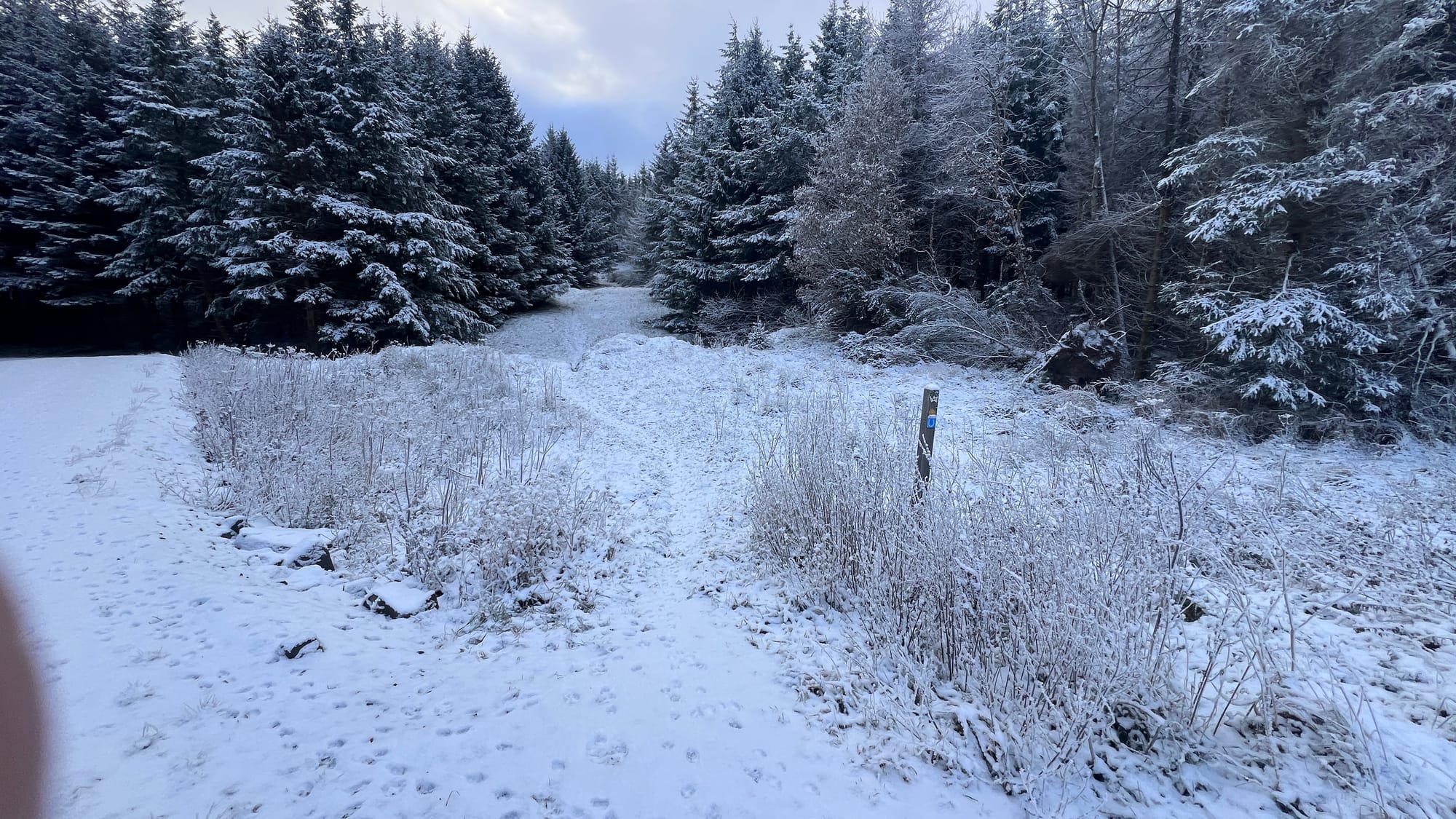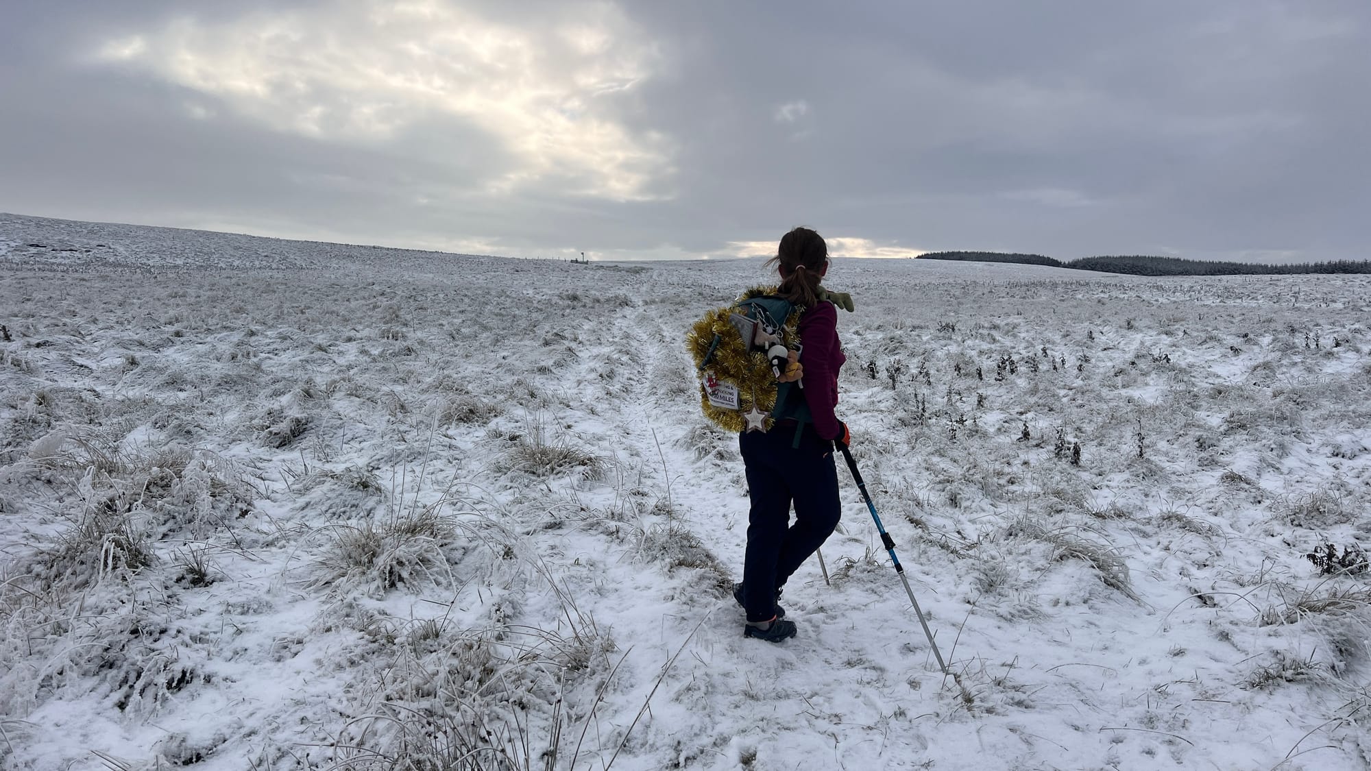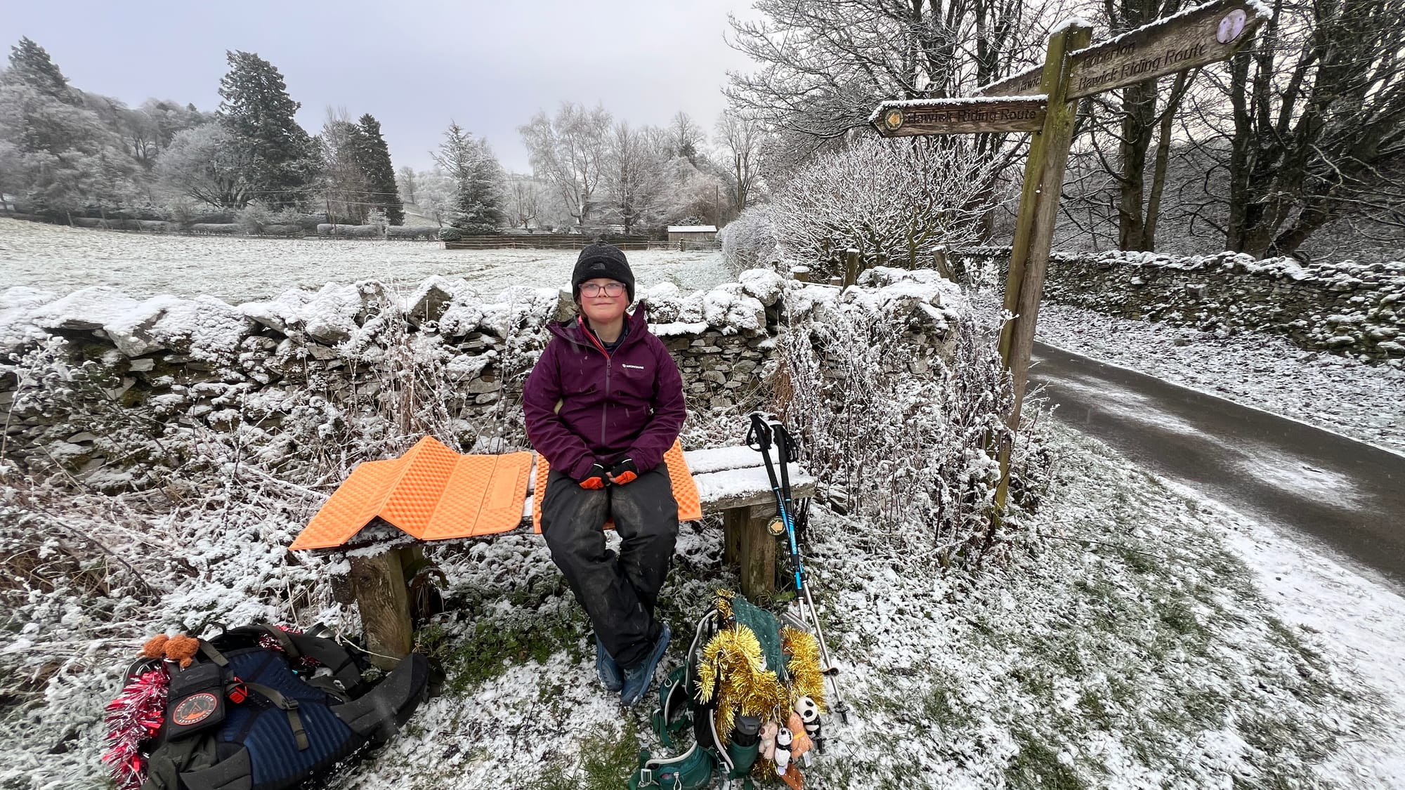 It felt like the perfect end to reach the final waymarker just as the snow came on again. It was a fitting end to a wintery trail, that had taken us through the Scottish Borders to complete trail 19 of 29. We sat on a small bench, ate some chocolate and waited for Sarah to arrive as the snow fell and settled around and on us.