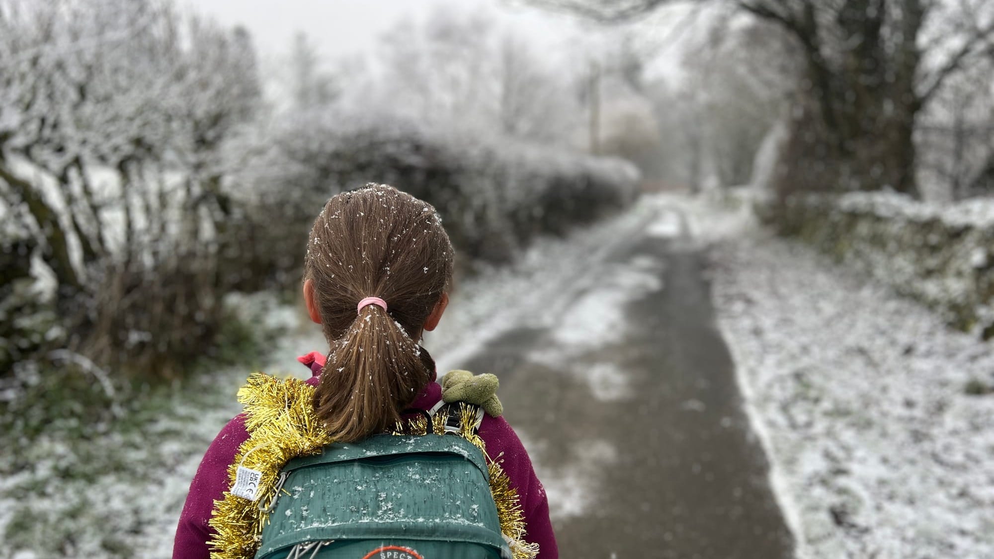 The track ended and found ourselves following a long trail flanked either side by snow-covered hedges that gave occasional glimpses to the stationary livestock behind. The path meandered gently up and down like a gentle fairground ride for children. Eve was still running, jumping and skipping in front of me as I struggled to keep up. I didn't try to stop her or slow her down. The pleasure of watching Eve run off with excitement and contentment in her environment was all mine.