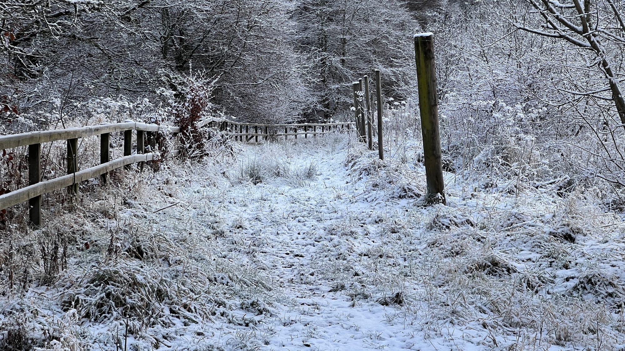Winding through gorse bushed bushes and around pheasant feeding areas we are on a very well-made track. We couldn’t see it as we approached as everything looked white, but once on it it would through the flat expanse of moorland like a giant serpent. It afforded us an easy path, albeit covered in untouched snow.