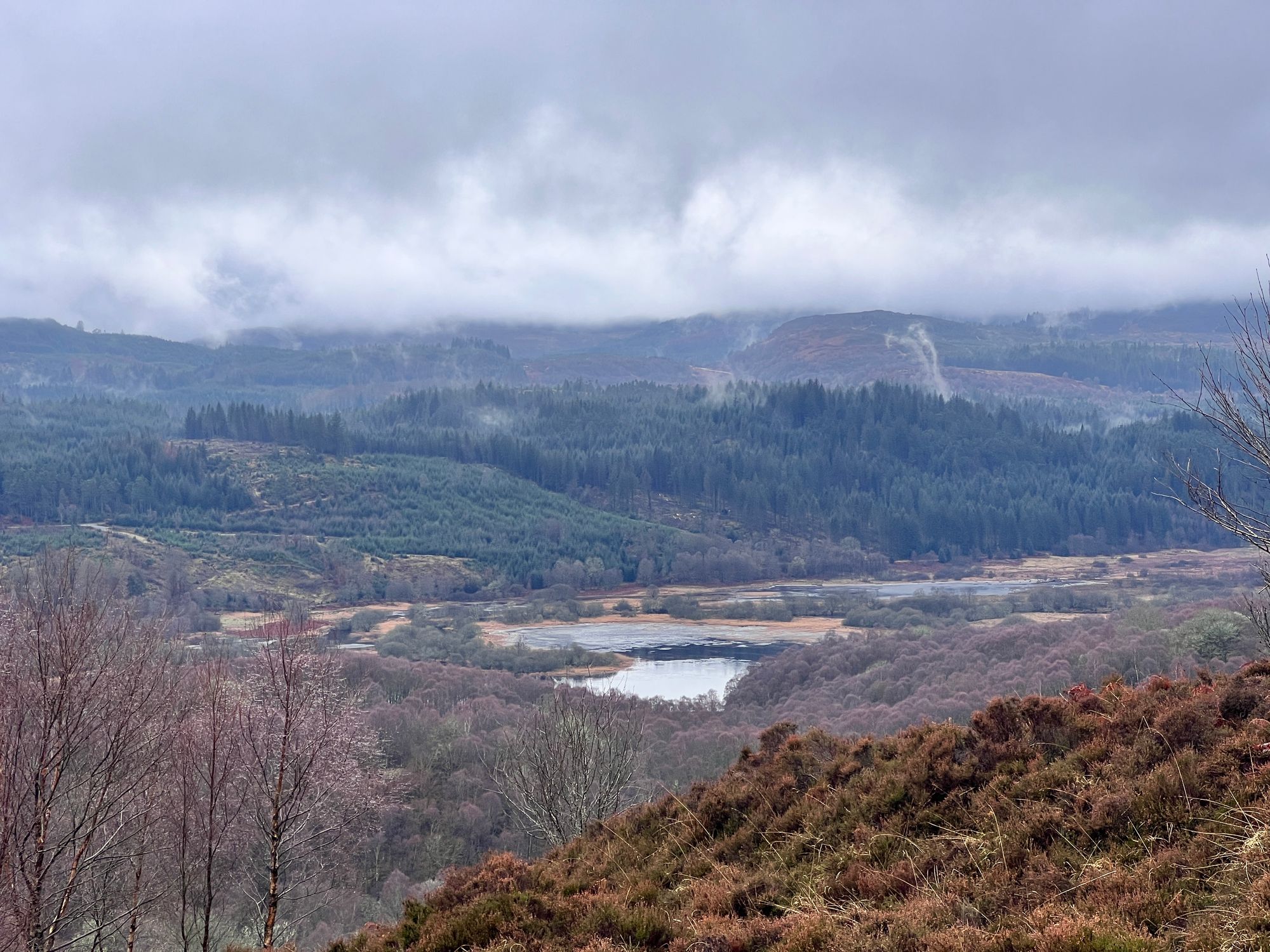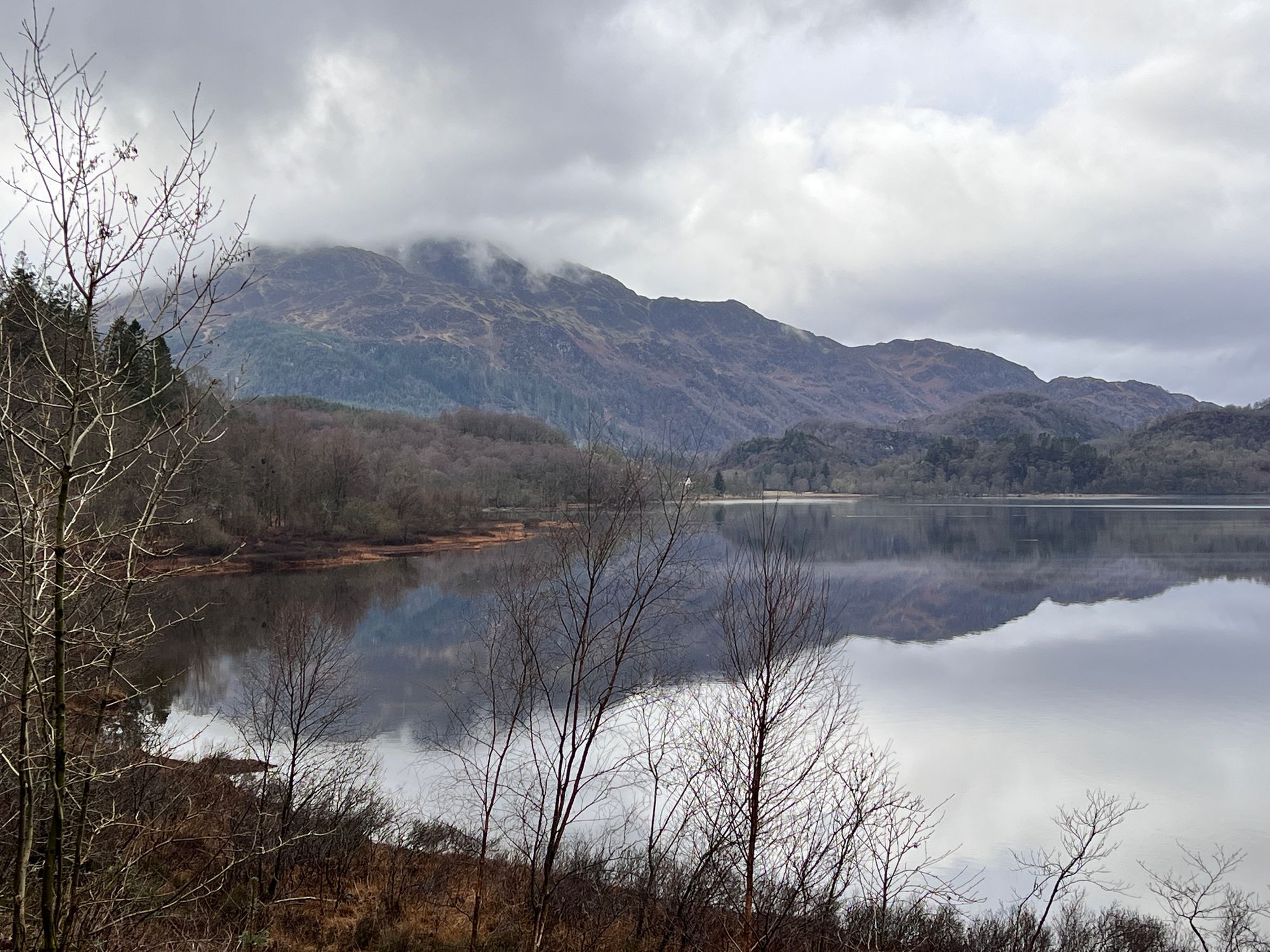 Ben Venue in the distance looked large and imposing, its peak covered in snow and fog. Eve and I have both hiked up Ben Venue. We have even made a YouTube video about it. It was a long hike, and we didn't get off the hill until it was pitch dark.