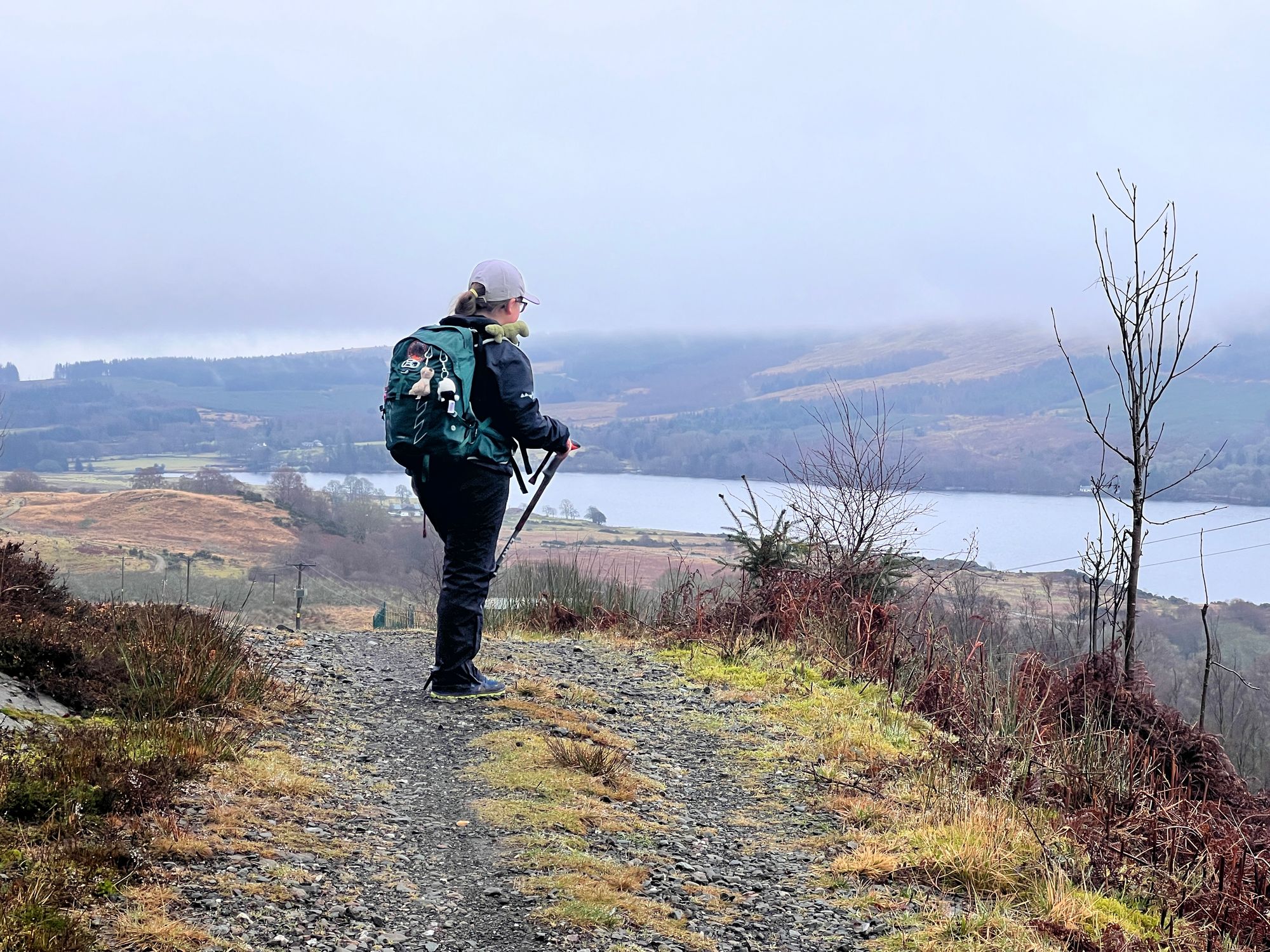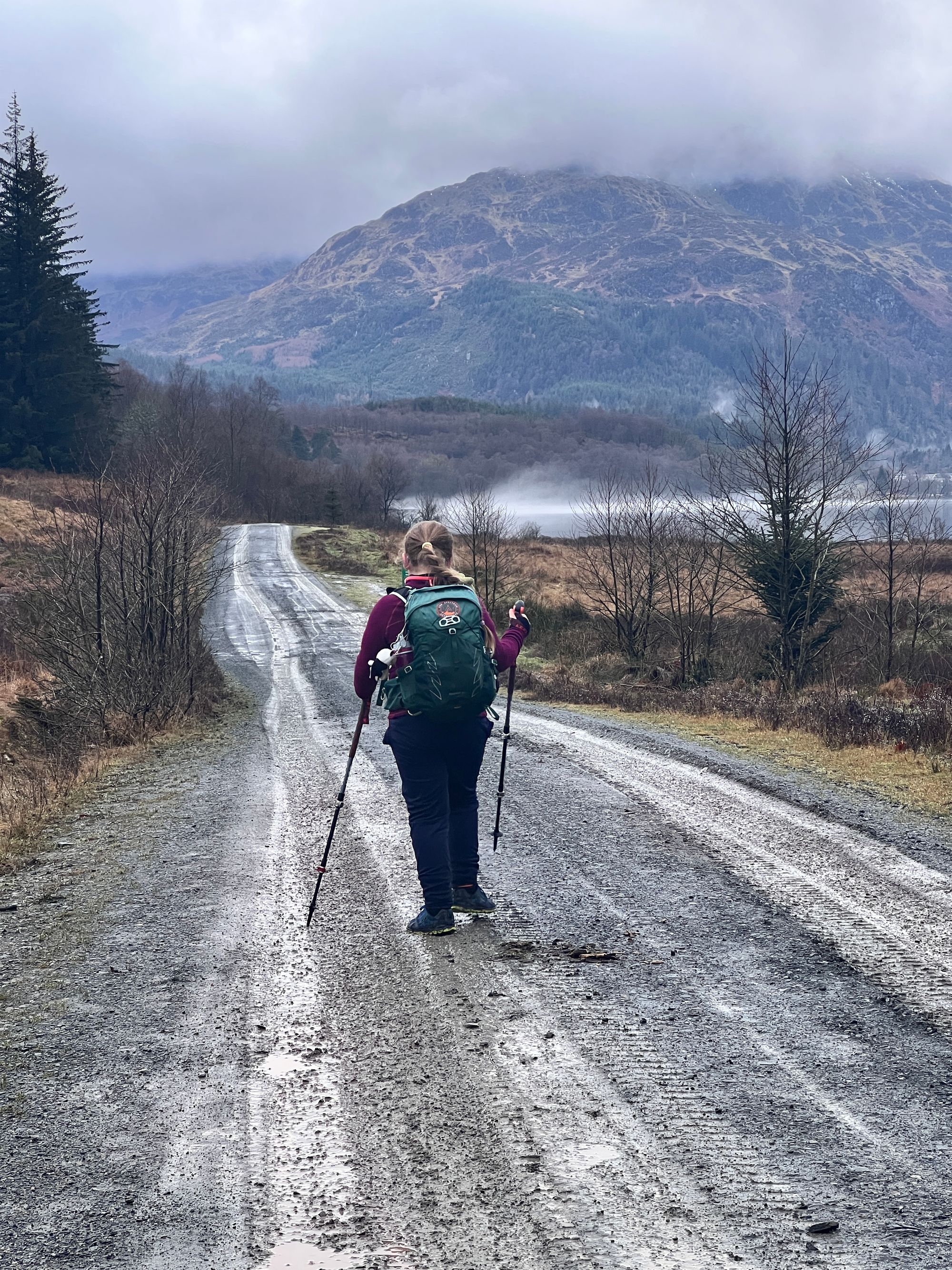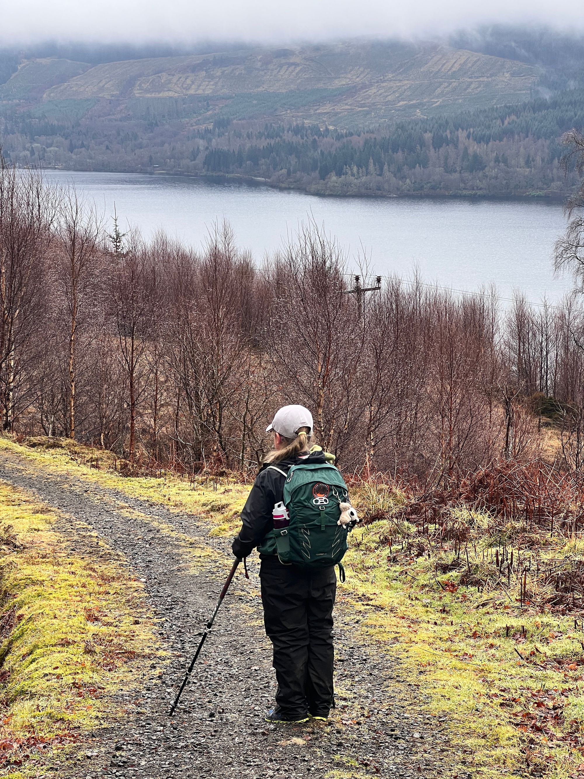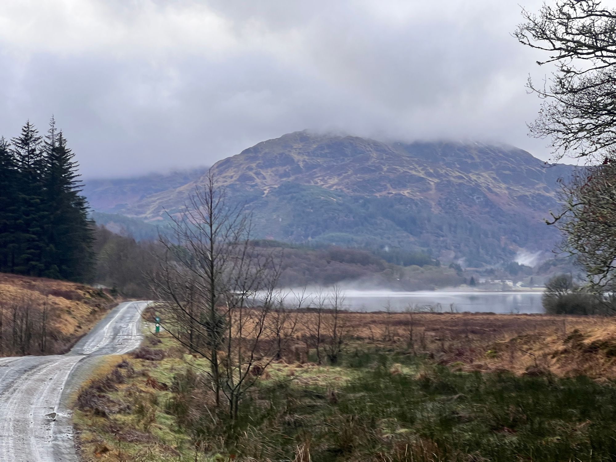 The path follows the road for miles, passing Loch Venachar. The views are stunning but were obscured by the fog.