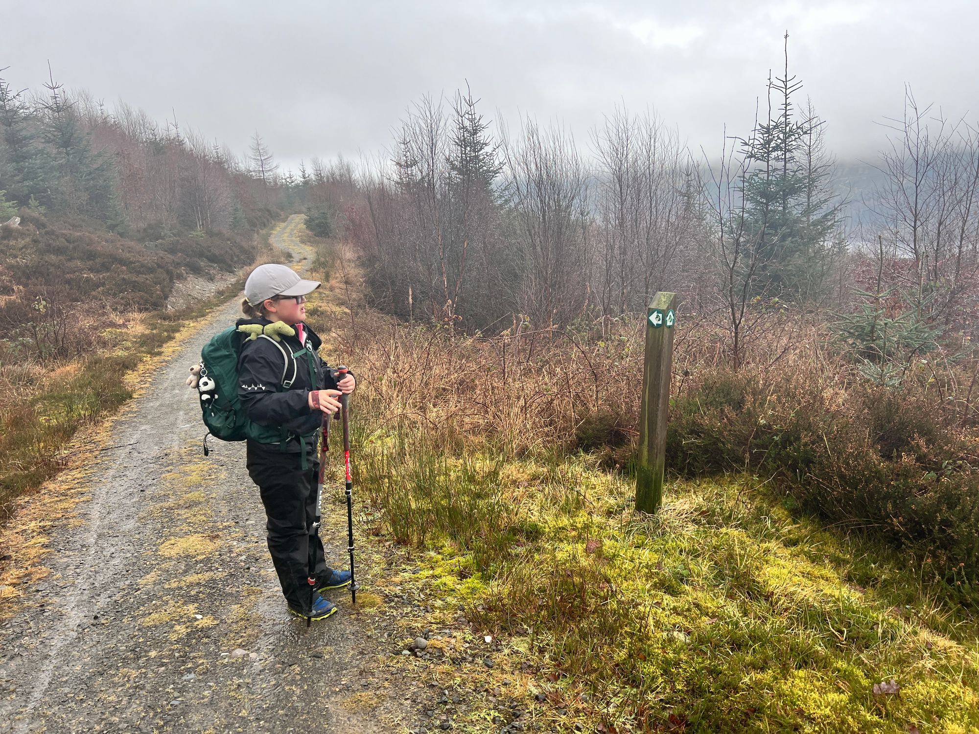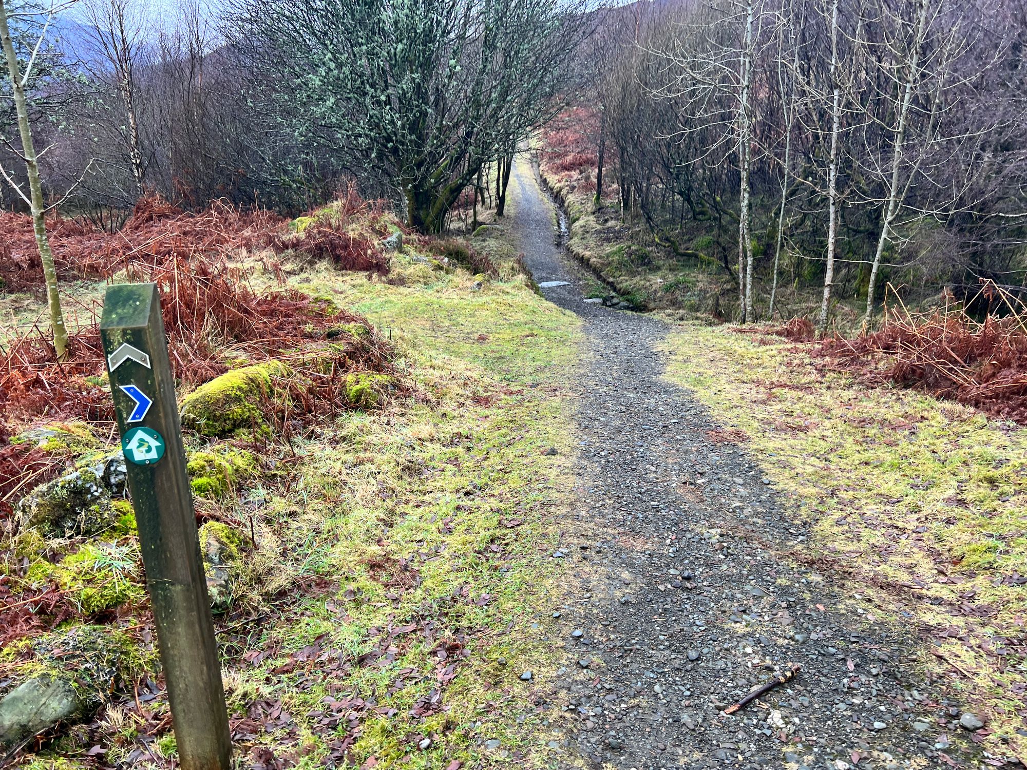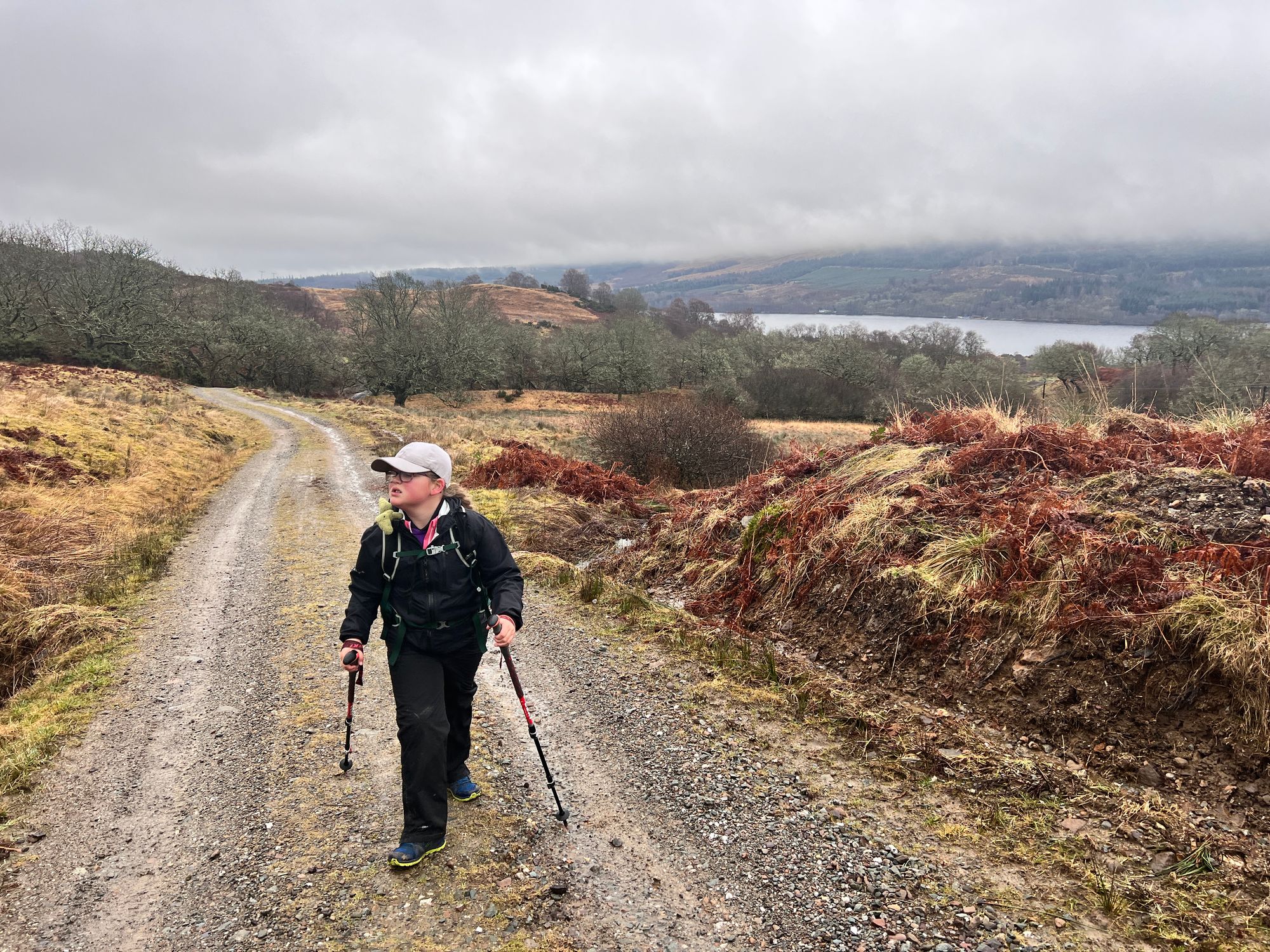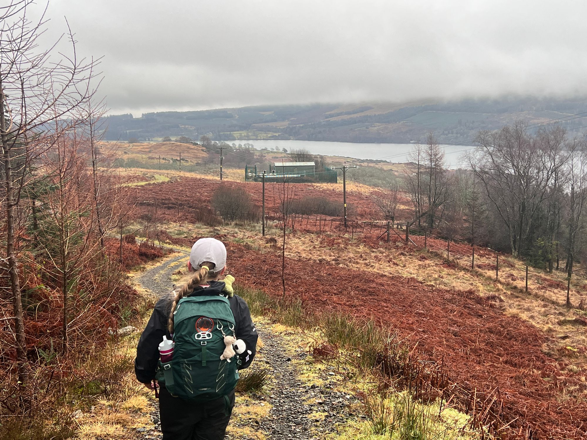 The path follows the road for miles, passing Loch Venachar. The views are stunning but were obscured by the fog.