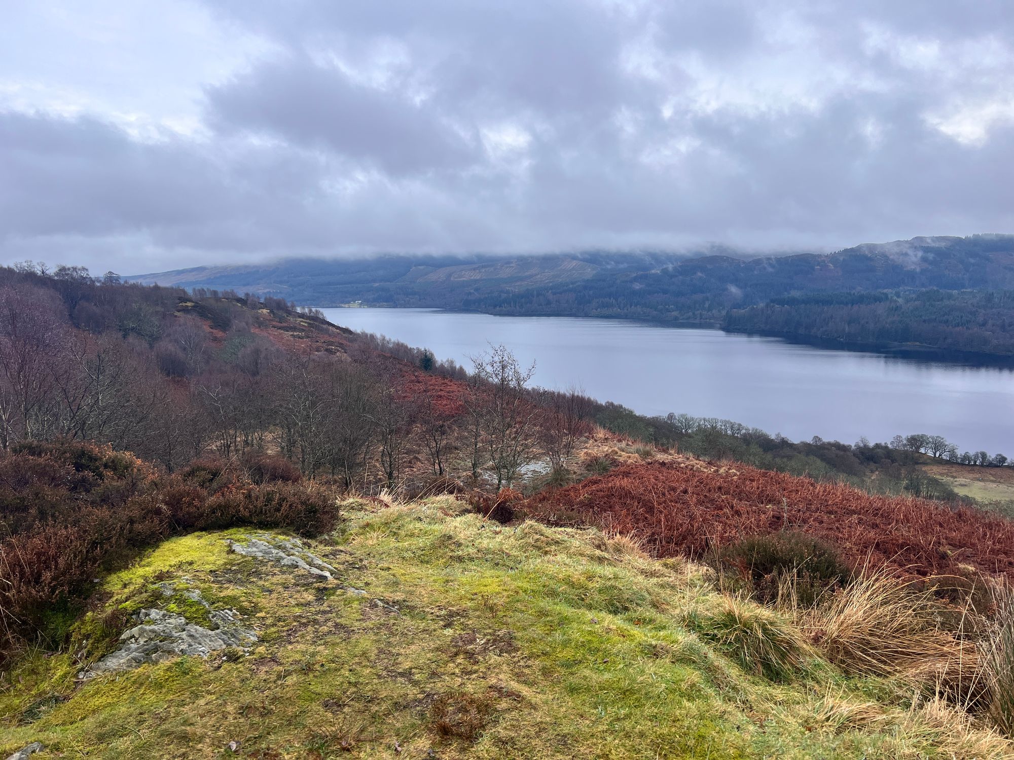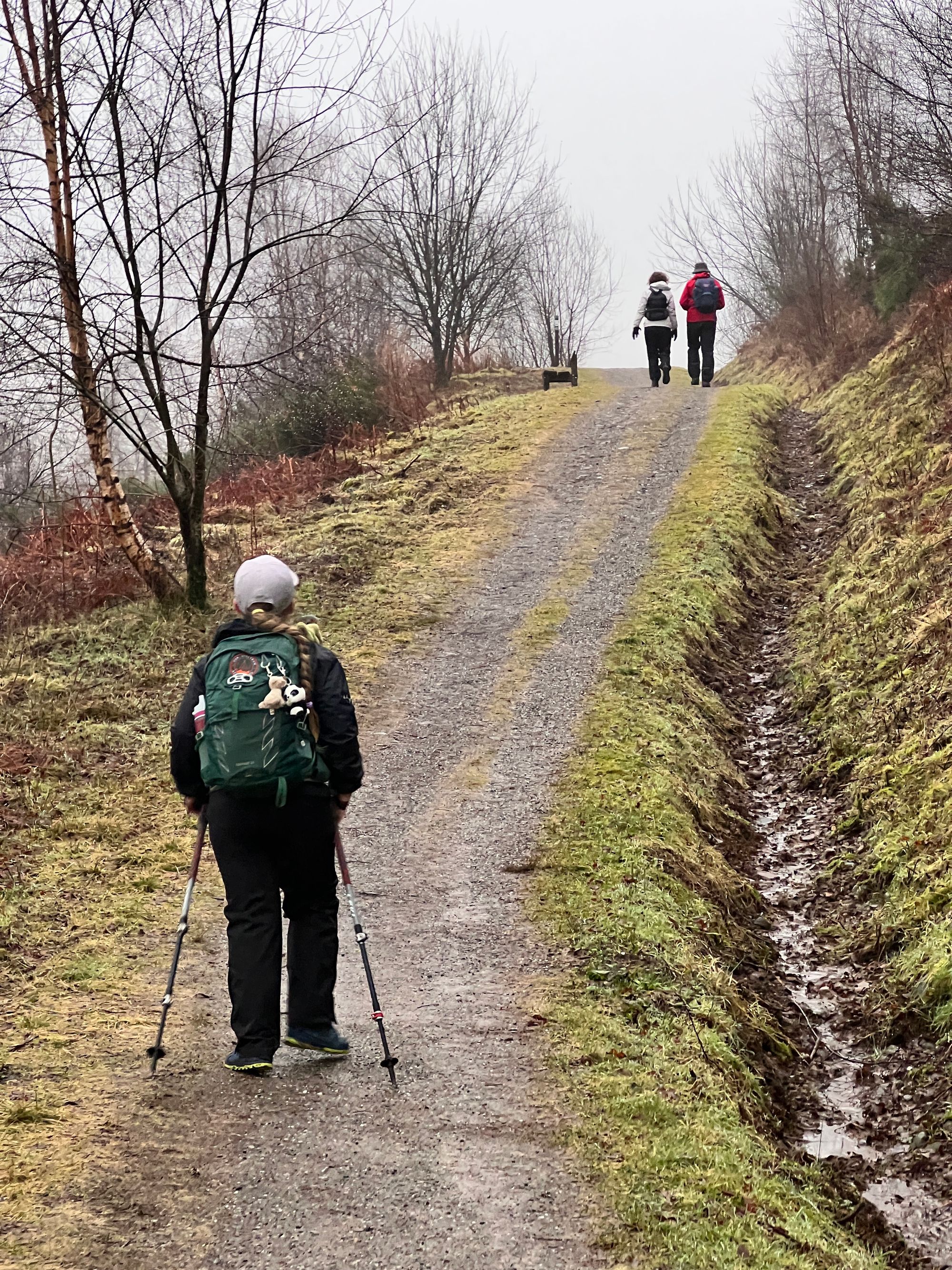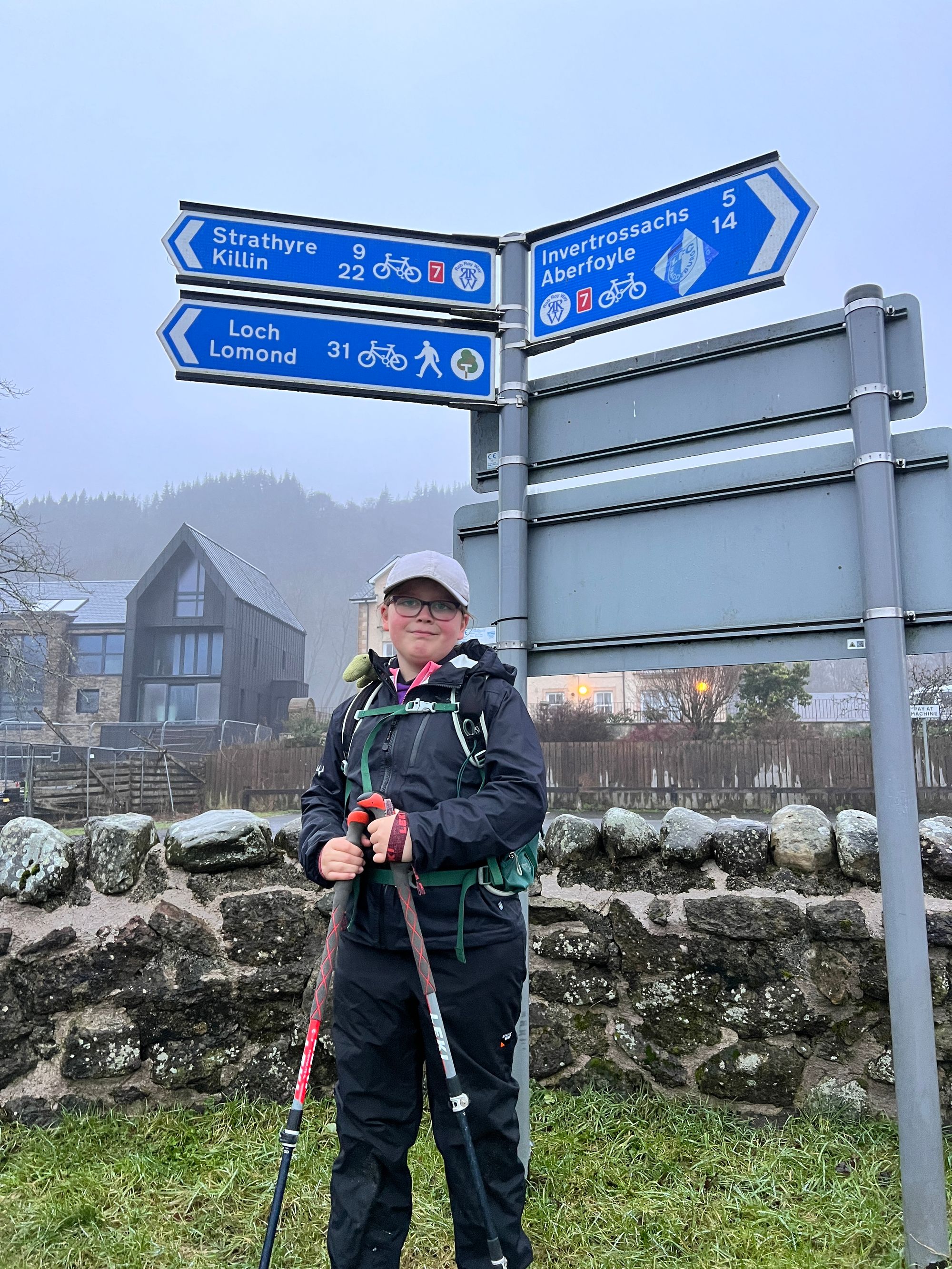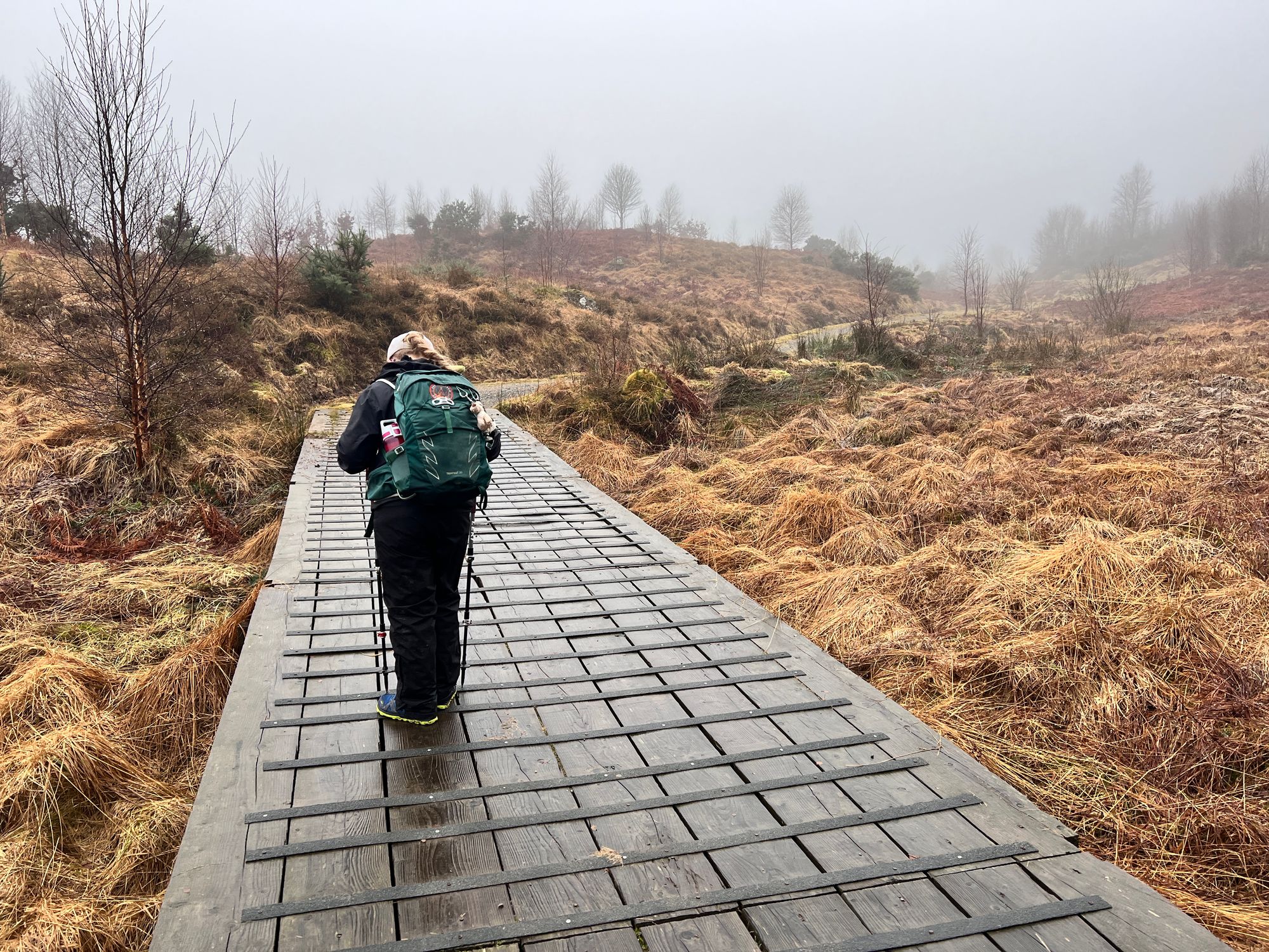 The path follows the road for miles, passing Loch Venachar. The views are stunning but were obscured by the fog.