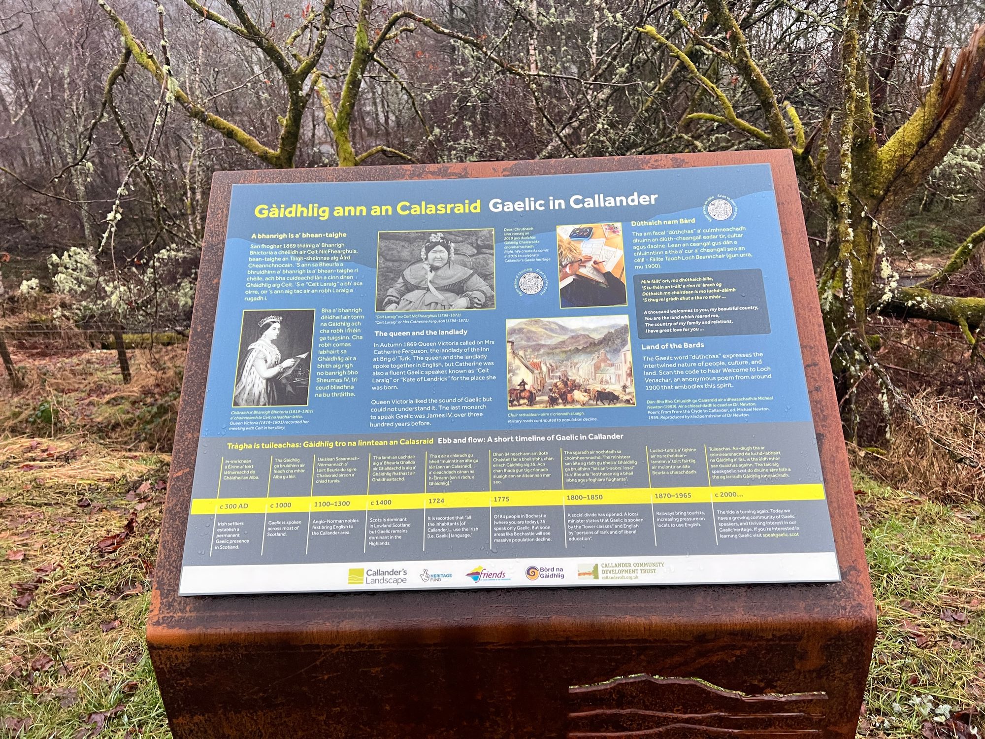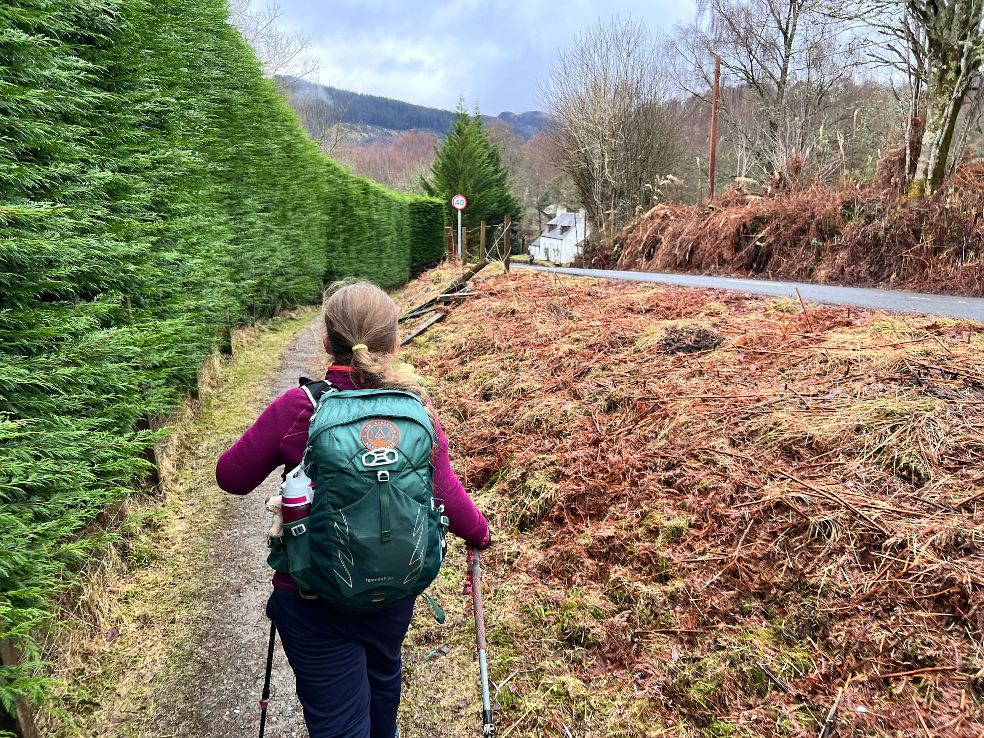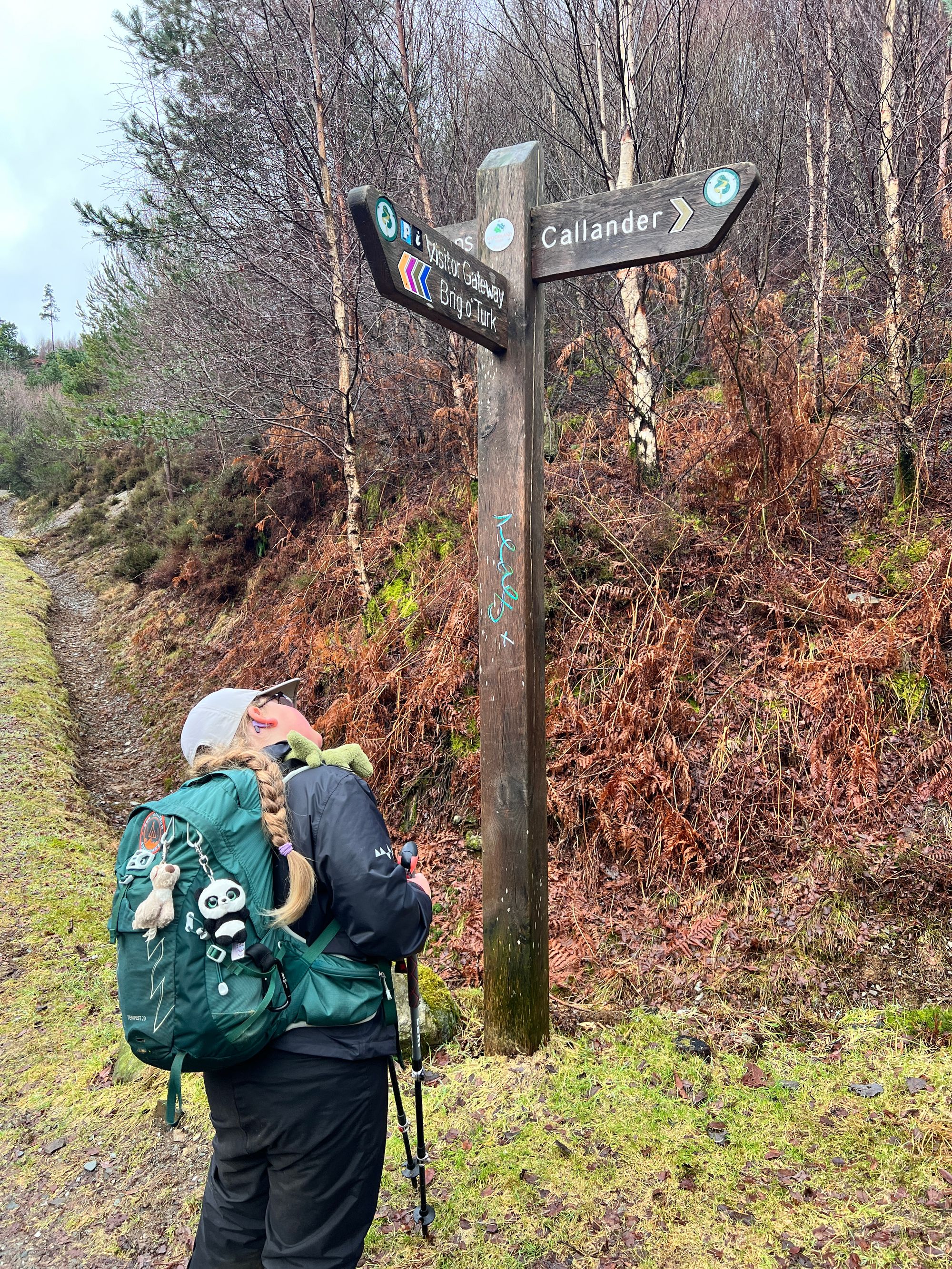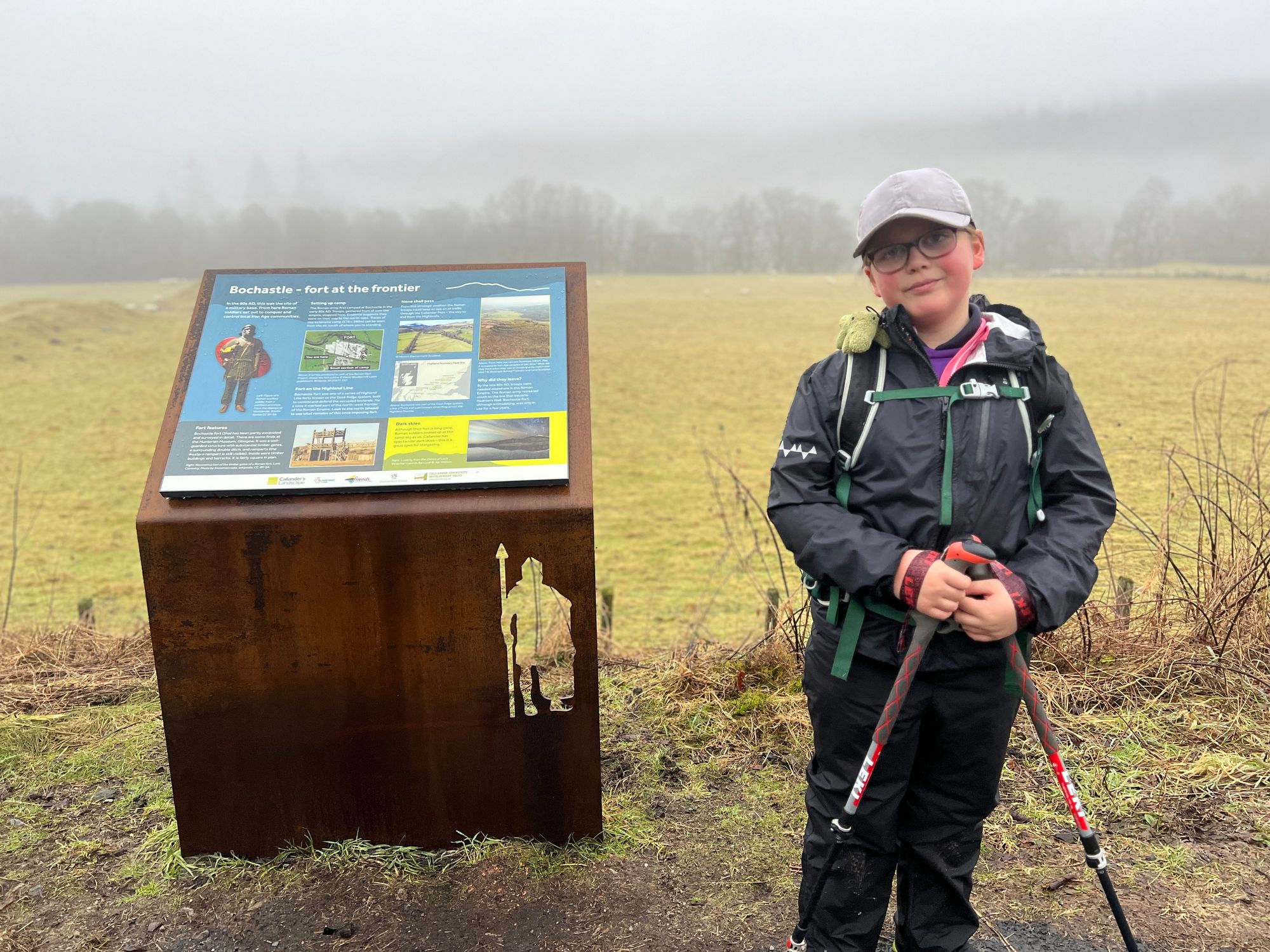 The first section out of Callander follows an old disused railway line. It's flat, easy walking where we passed several dog walkers. We took some time to read the information plaques about the old roman fort that sat as a boundary to the Scottish Highlands in 80 AD. You can still see some of the old roman ditches. Eve had a very early morning history lesson.