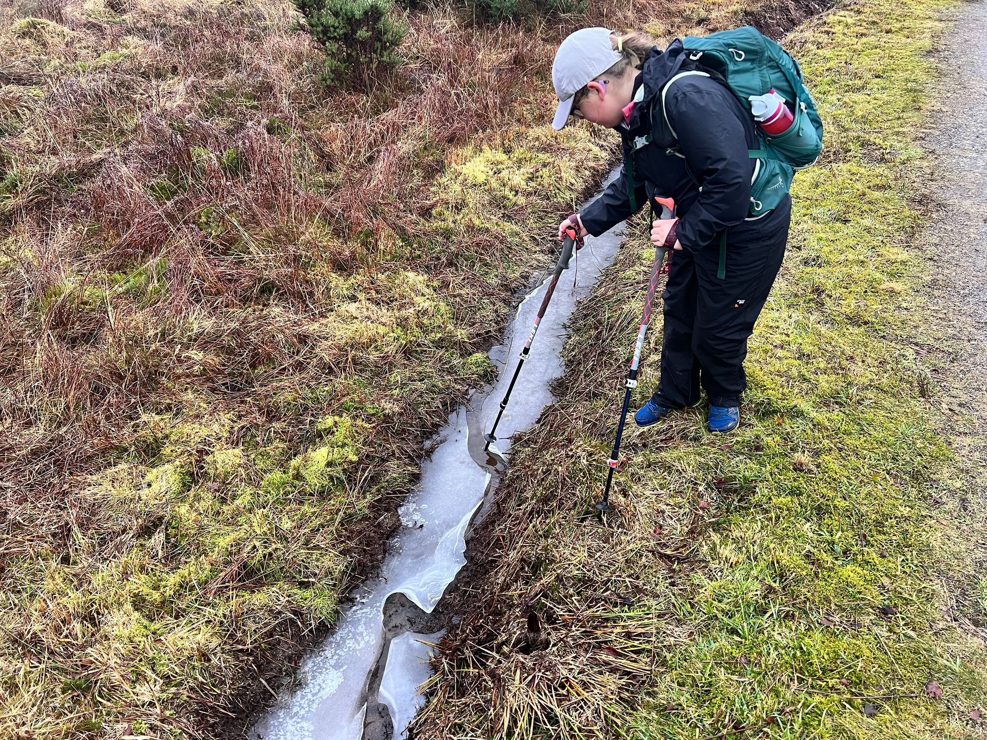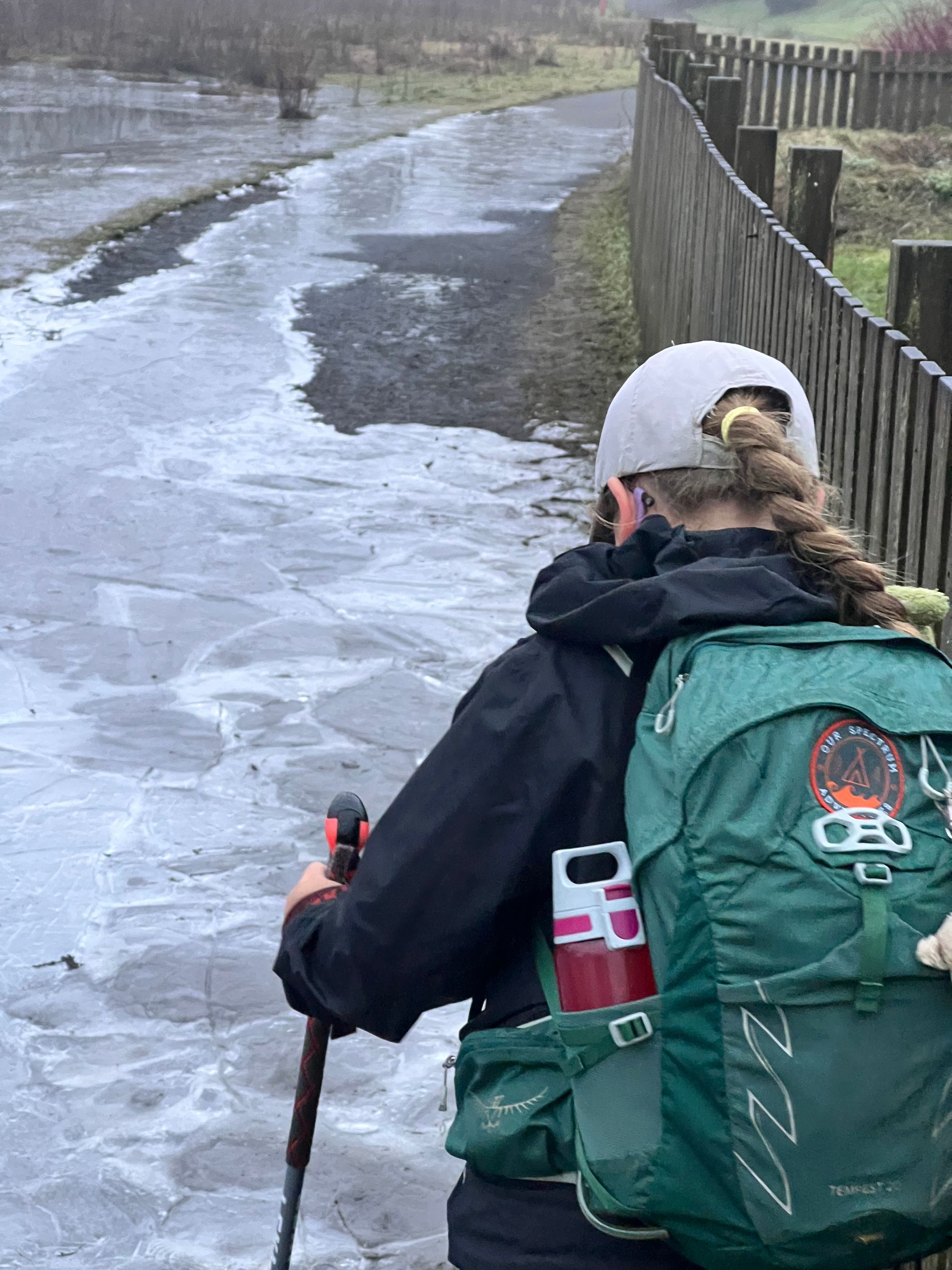 The first obstacle was a huge slab of ice that covered the path. It was easy to walk around but in the darkness could easily be missed with painful consequences. The ice was like a skating rink. Eve was keen to give it a go, but I managed to talk her out of it. I had images of a broken leg within minutes of leaving Sarah.