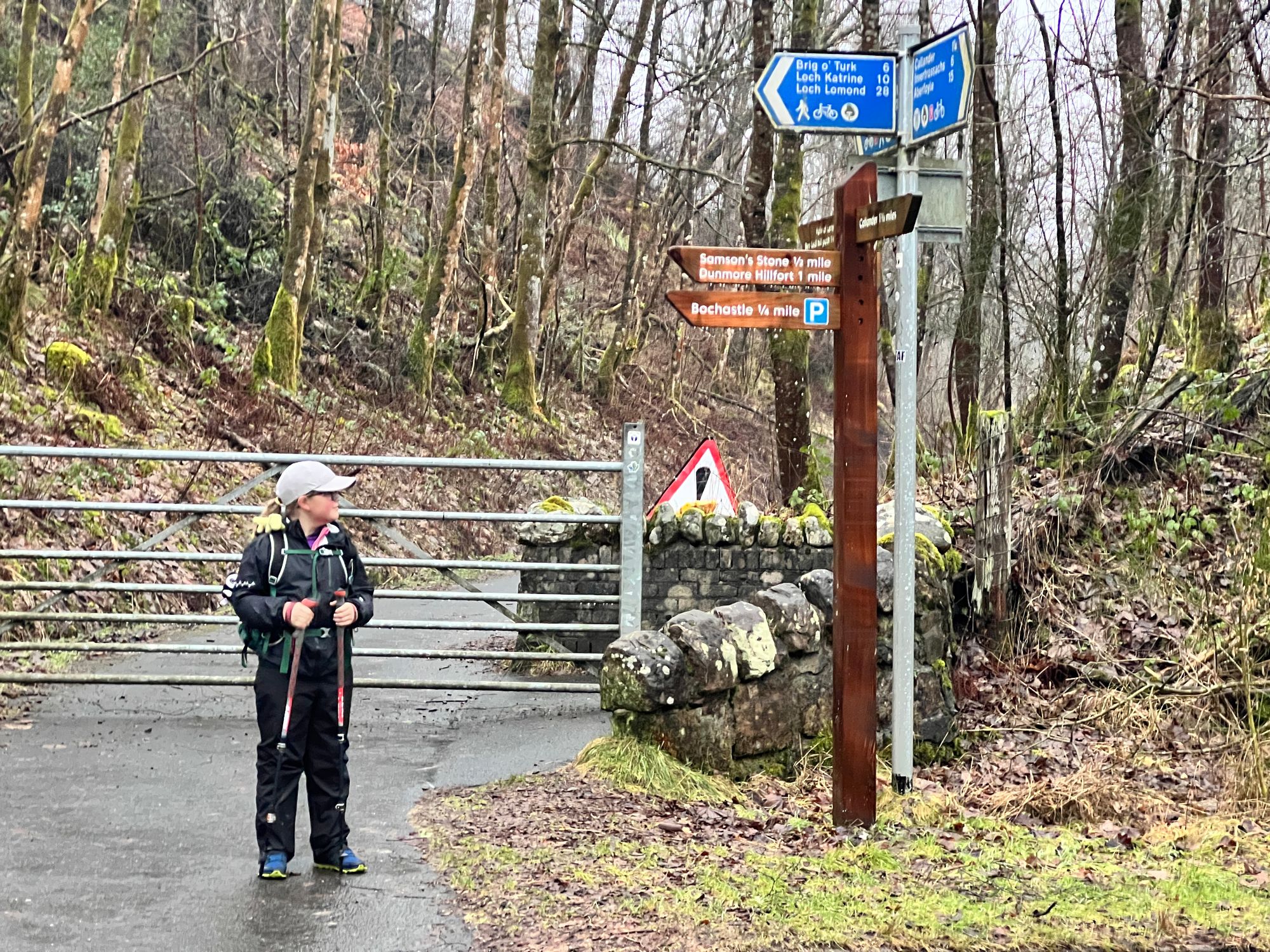 At the end of this small tarmacked section, we arrived at the busy A821. We crossed it safely and headed into the car park at the base of Bochastle Hill.