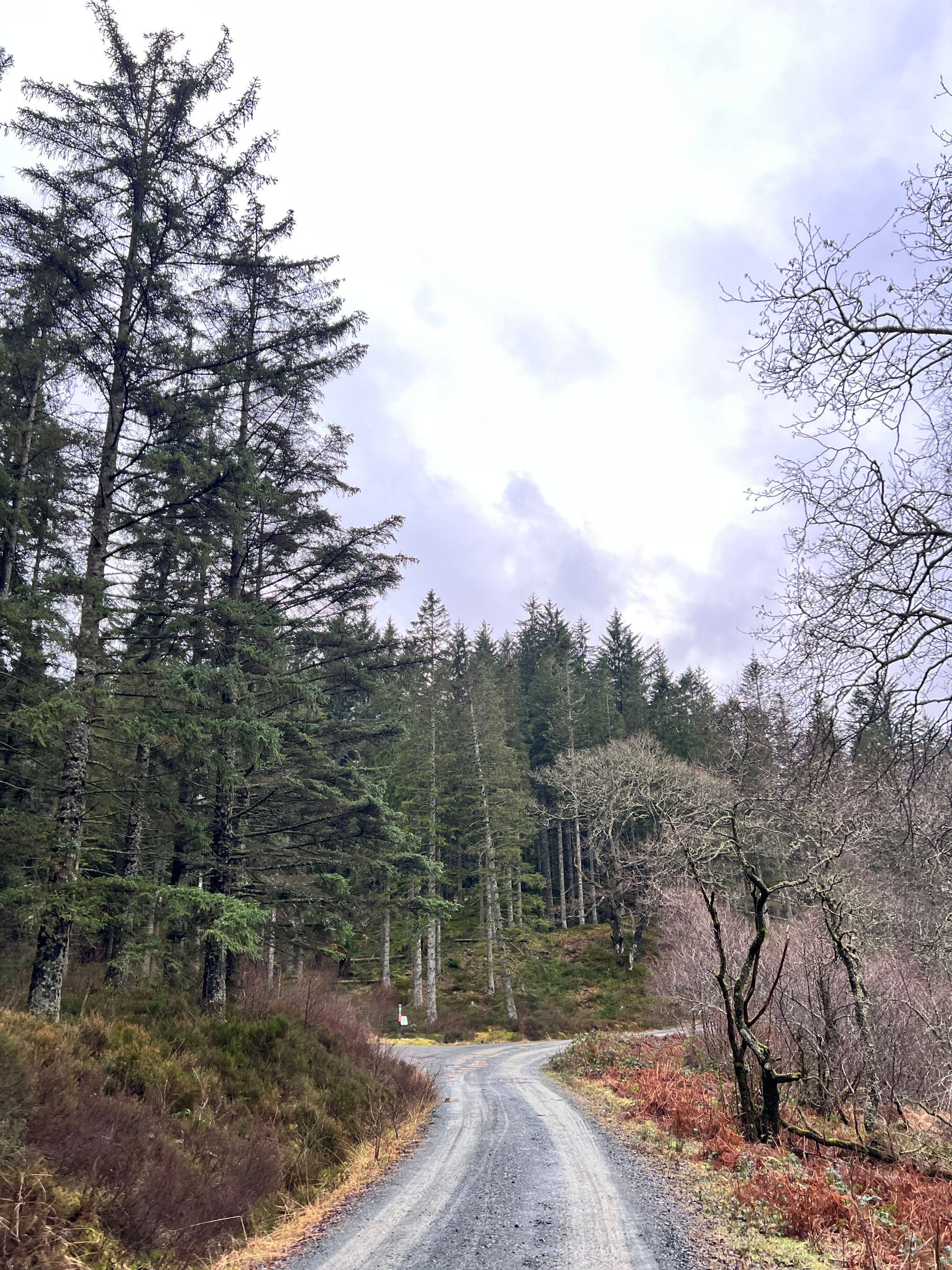 The walking from here was pleasant as the path changed from road to trail to path and eventually onto the Three Lochs Forest Drive. A very popular tourist route in summer. We walked slowly up and passed the campsite at Loch Achray.