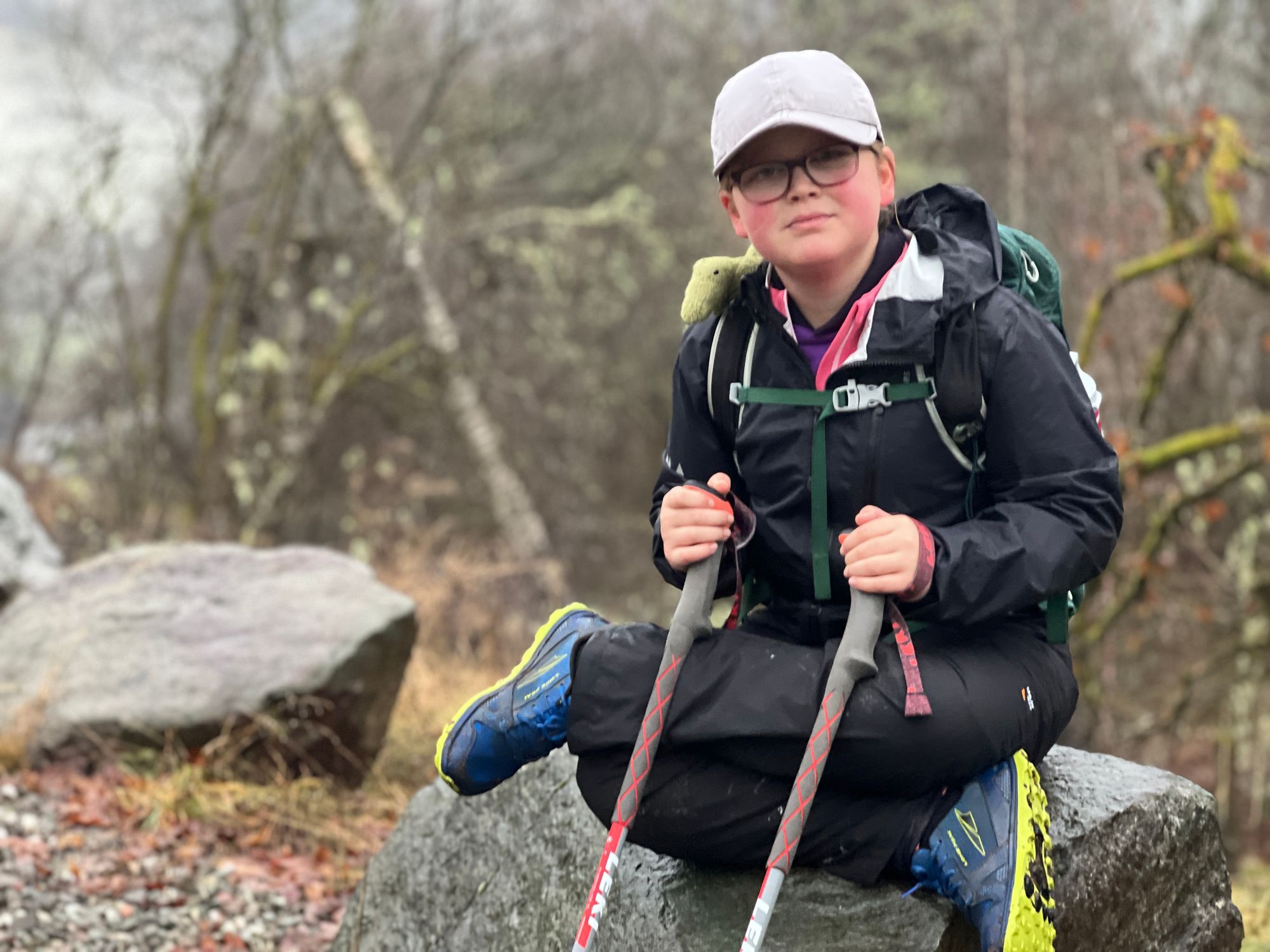 The trail from here changed to gravel. It was much more pleasant and the views were starting to open up. It was still wet and there was still a thick covering of fog. Eve was motivated and enthusiastic.