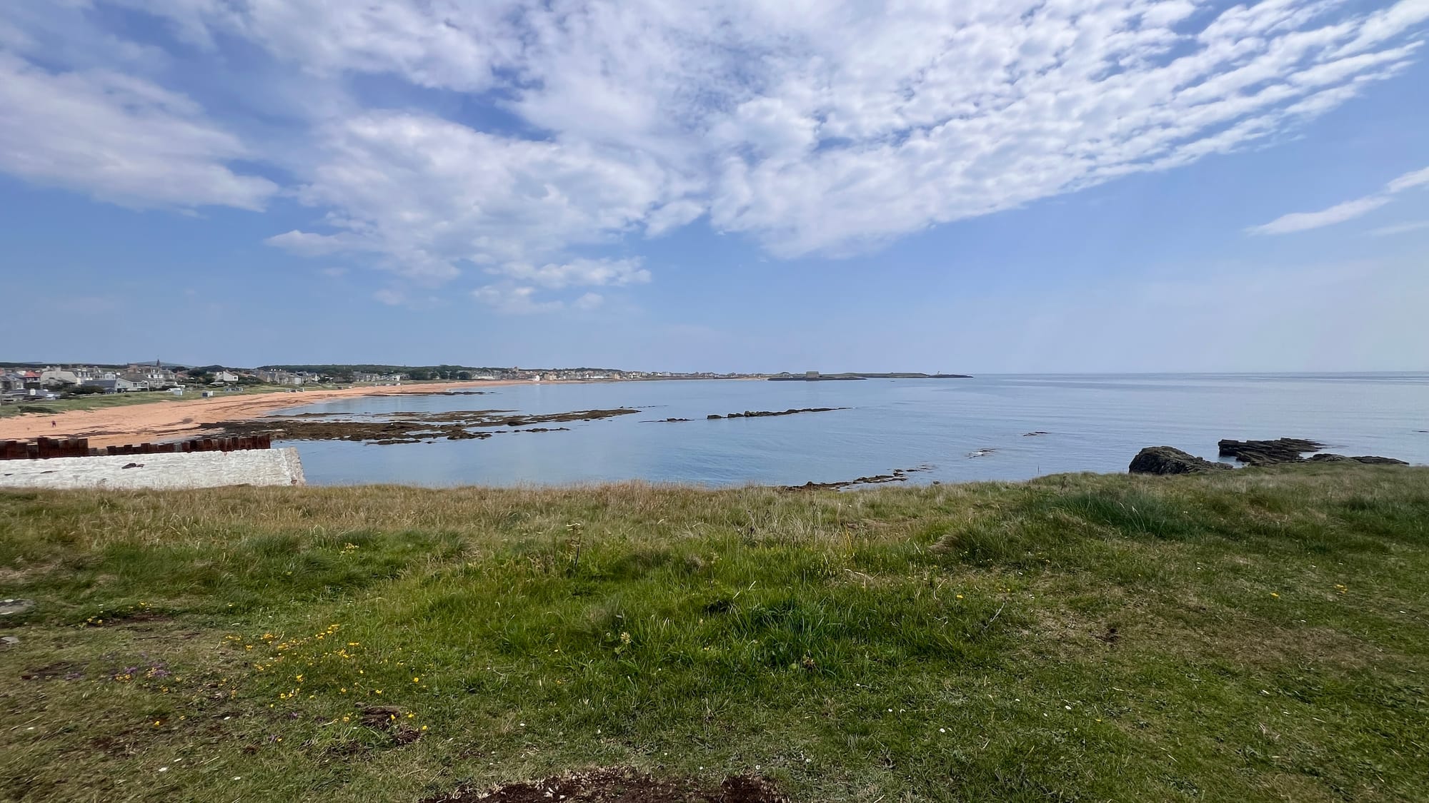 There is a lovely, grassy picnic area at the end of the road, where we ate our lunch before heading onto the Chain Walk. The view from here, looking around the bay towards Elie Beach, is simply spectacular! There are a couple of information boards that Eve and I read together, leaving Sarah on the bench.