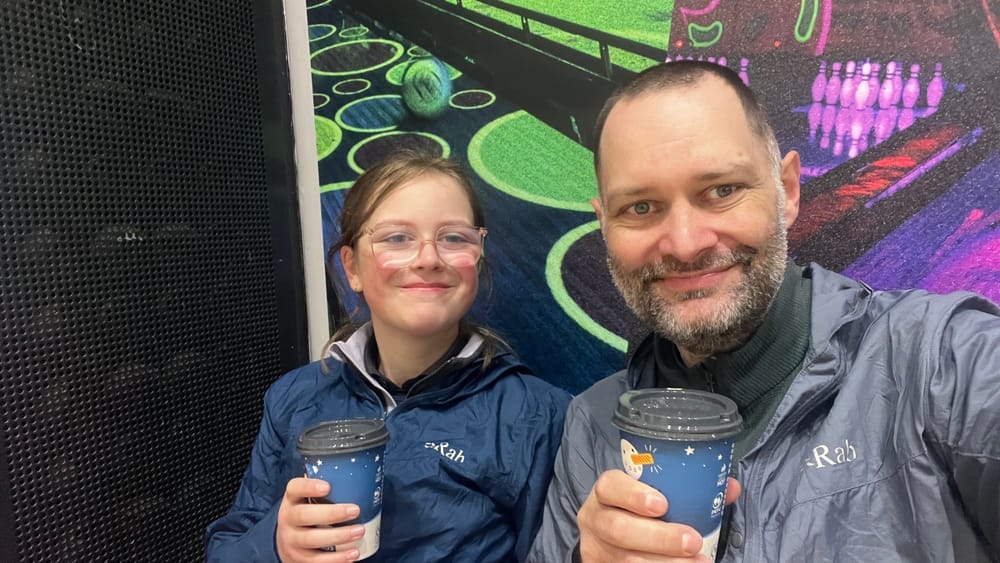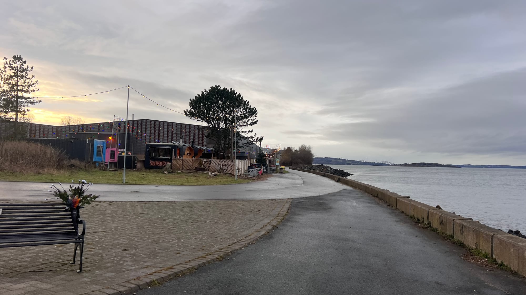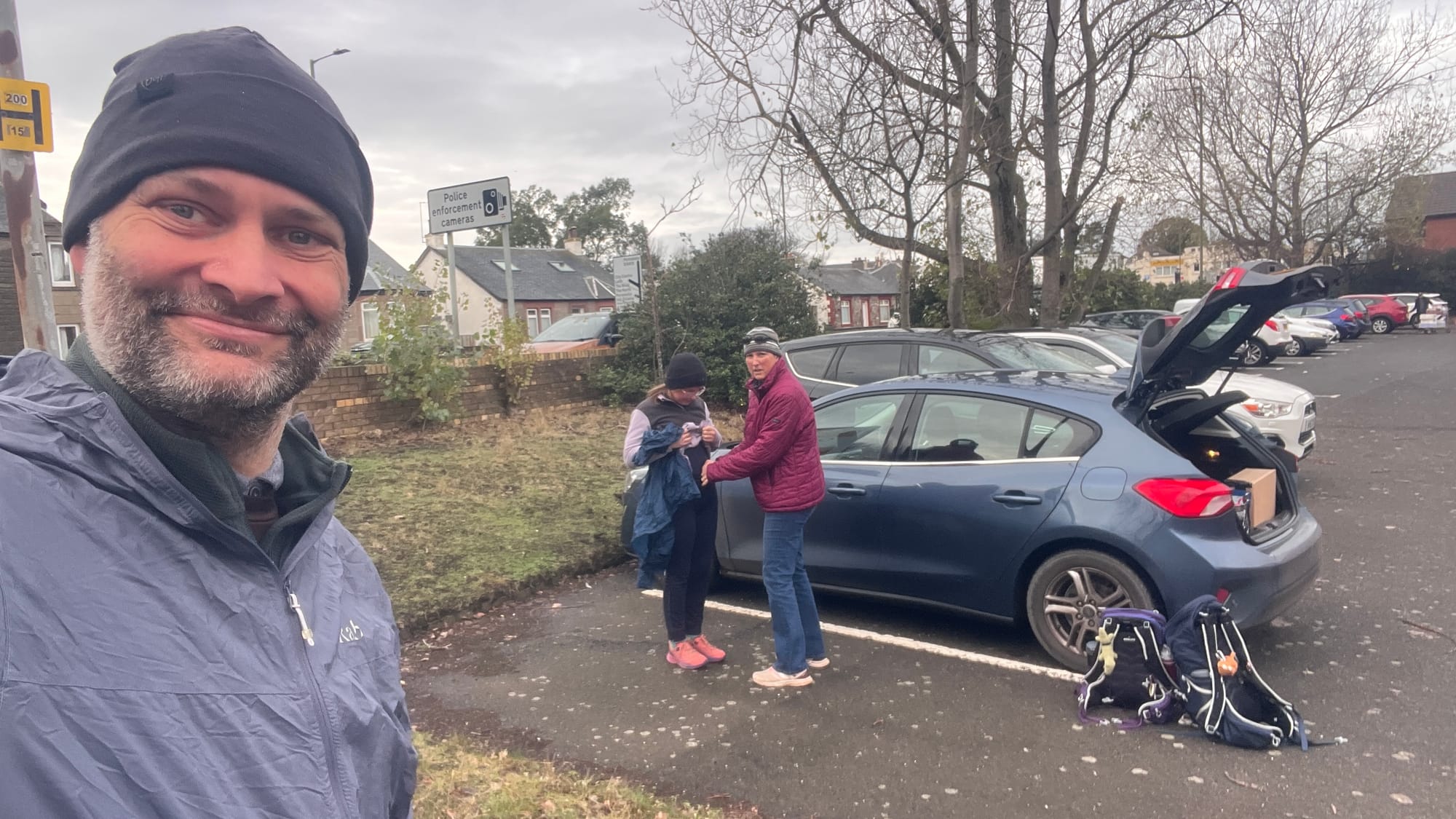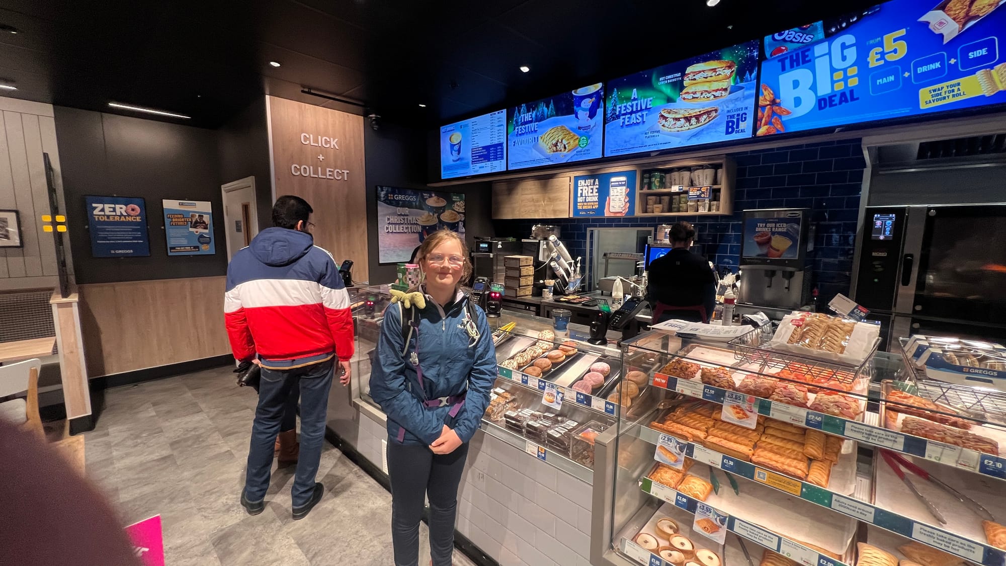 In Leith, we found a large shopping centre. We popped in to use the facilities and grab a hot drink from Greggs. I managed to get a free drink as a reward from our home energy provider, and Eve used some of the Buy Me a Coffee donations you have given us—thank you! I had a Gingerbread Latte, and Eve had a caramel Mocha. We sat on the floor in the shopping centre enjoying the warmth—and got a lot of strange looks from passersby!