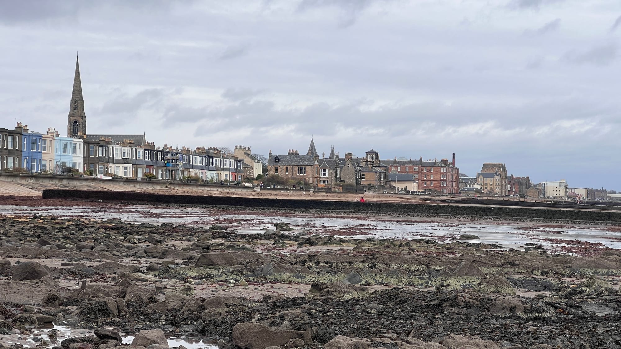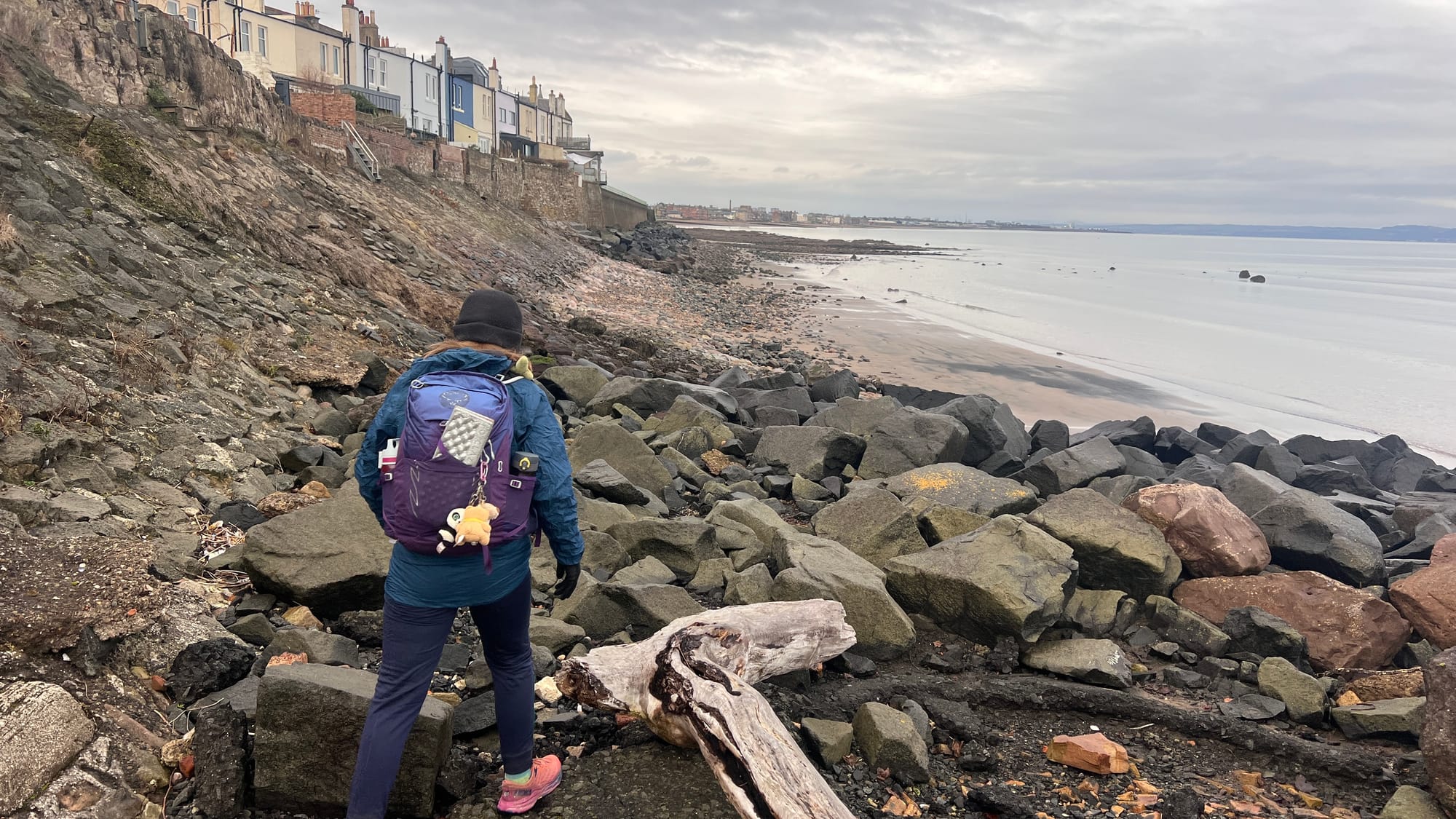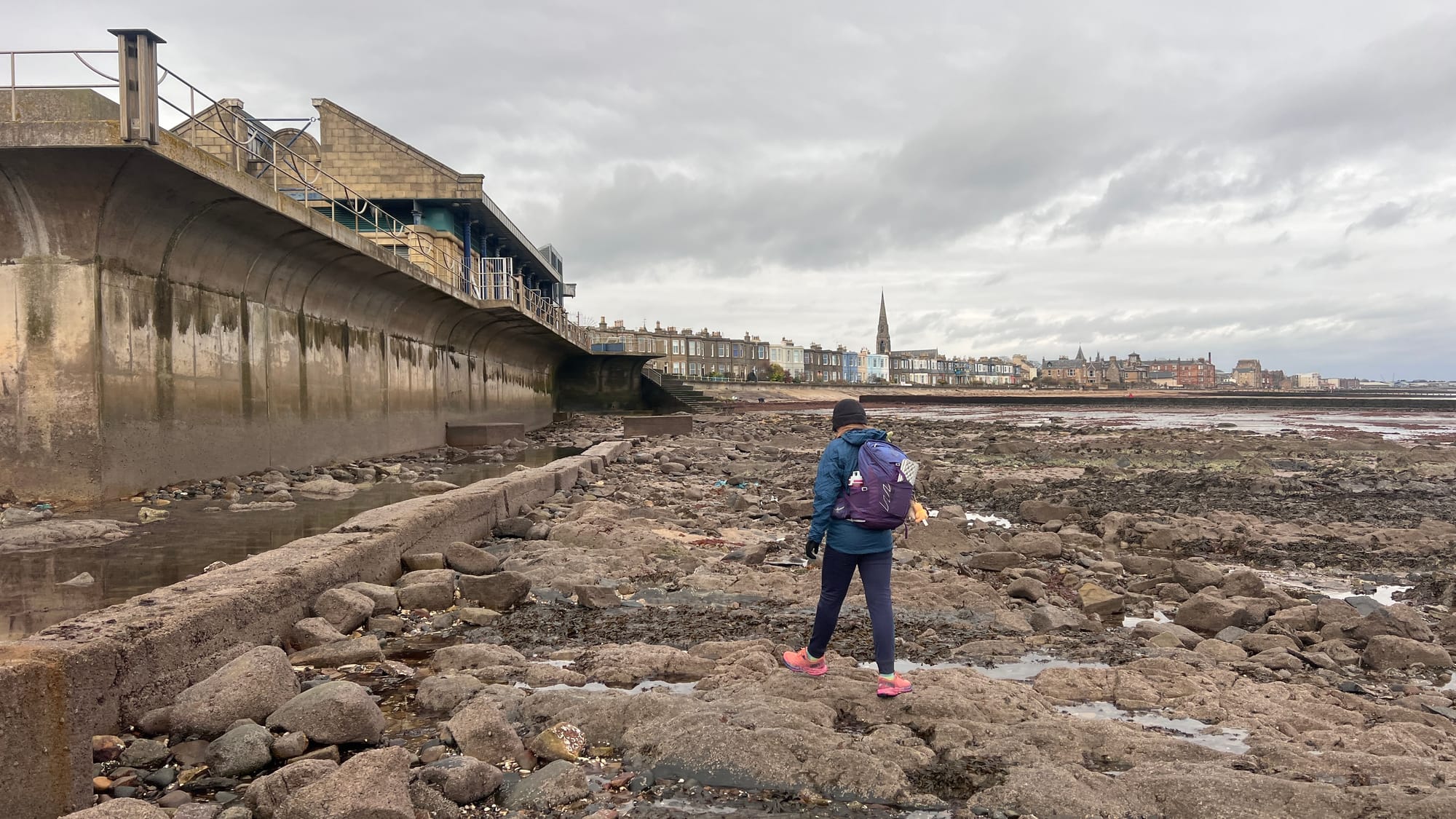 The tide was out. I hadn’t checked tide times, assuming there wouldn’t be much beach walking as we entered the city. I knew Portobello has a huge, expansive beach—but not much after that. With the tide out, we went straight onto the rocky shoreline, walking behind houses and flats toward Portobello. It was slow going, as the rocks were so slippery. This was one of the rare times we opted not to carry walking poles. I began to regret that decision.