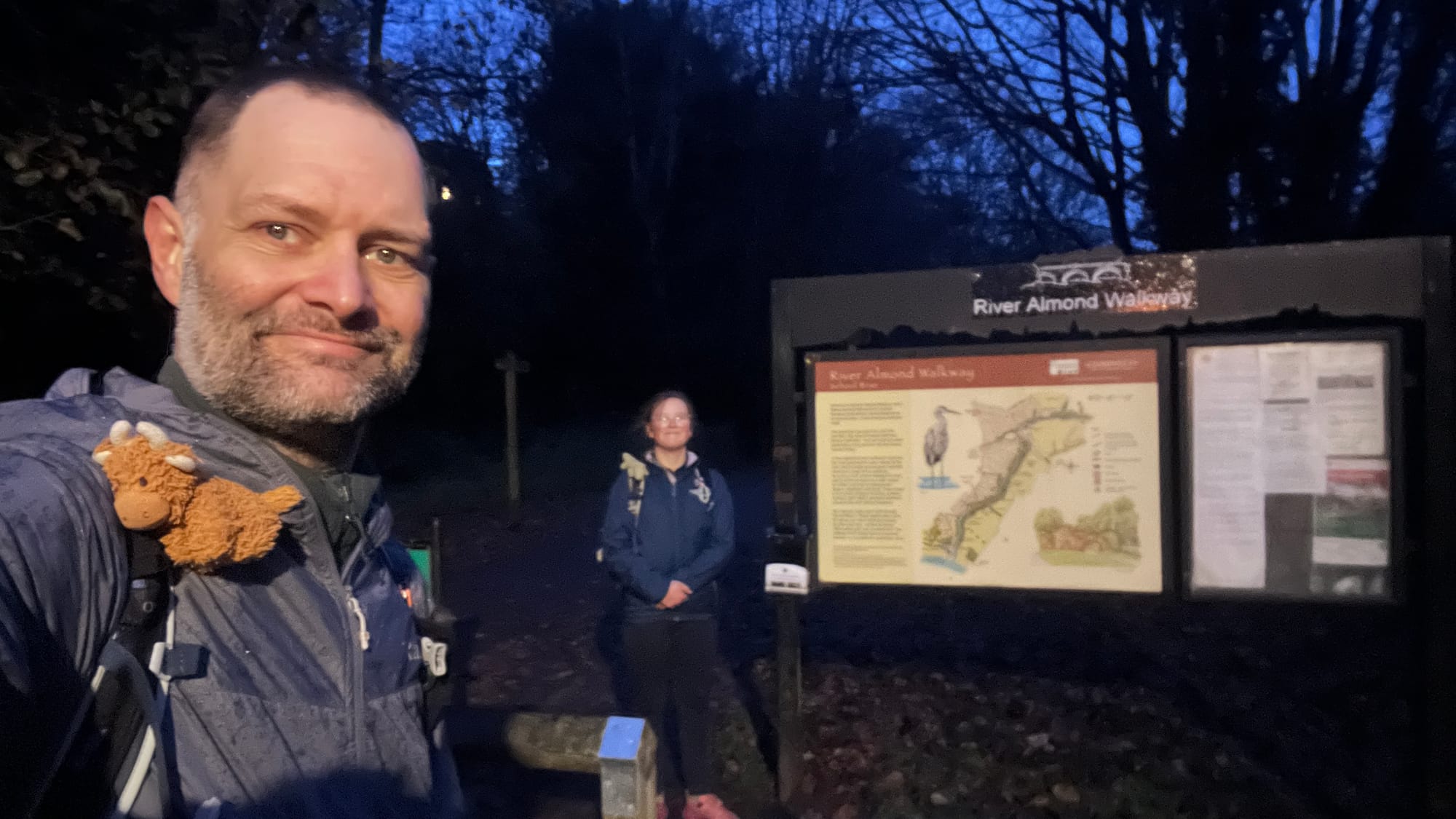 Eve and I sat down, had a wee break, and watched the lights twinkling over Cramond Island and the Firth of Forth. But we got cold, so decided to walk slowly up the banks of the River Almond to another car park we had seen on the map.