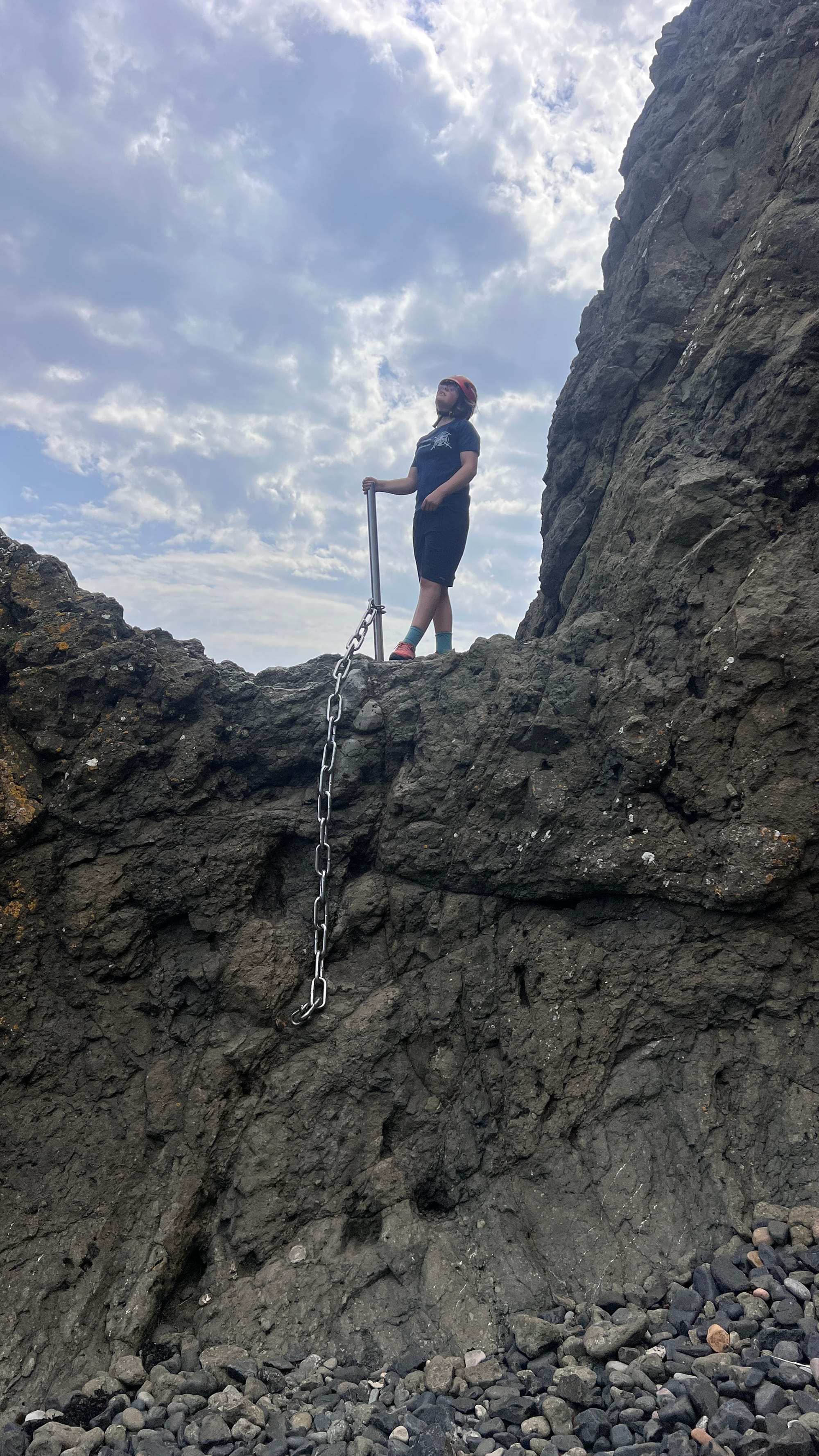 The remaining seven chains posed various challenges. Some long, some short, some high, some low. It never got boring! Two chains were particularly noteworthy. One that follows the contours of the rock at sea level, and the second chain that goes down a vertical slab of rock with footholds hidden from view. Stepping over the edge of this second chain required a degree of confidence and careful foot placement, especially in the heat, with sweaty palms slipping on the chain's smooth steel. One of my strategies was to rub my hands in the grit on the ground, as a climber would use chalk. This worked well, even if it was unconventional.
