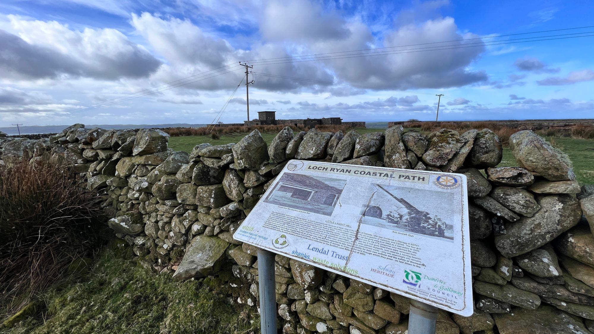 We walked into an open area where sheep were grazing and passed an old gun battery that was used to defend Loch Ryan. Once again there was an information board telling us all about the area and even had a picture of the gun!