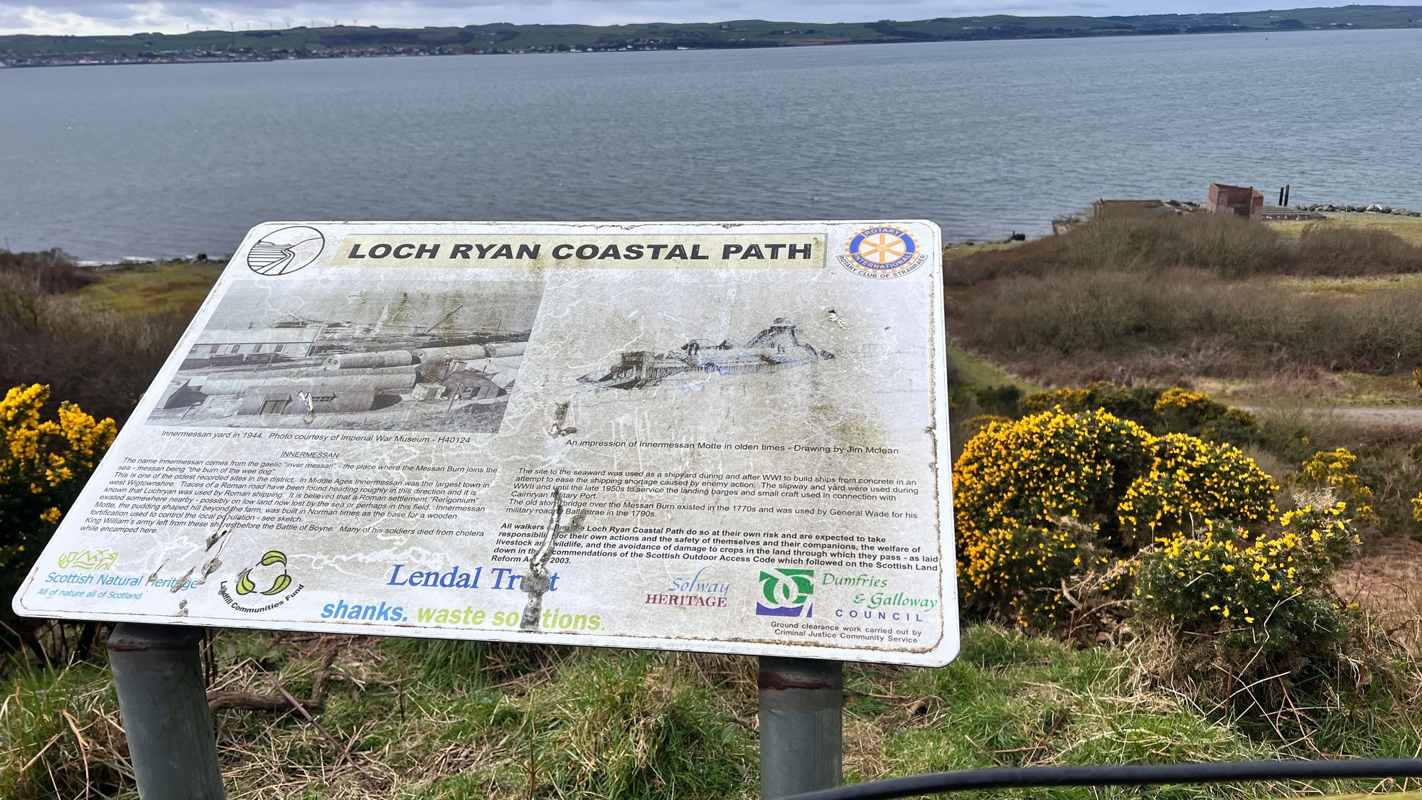 Walking through Cairnryan was nice as there was a really wide area of grass lined with flower pots and daffodils. There was an abandoned pier that we could see from a long distance away and we were pleased to come across an information board telling us about the history of the area.