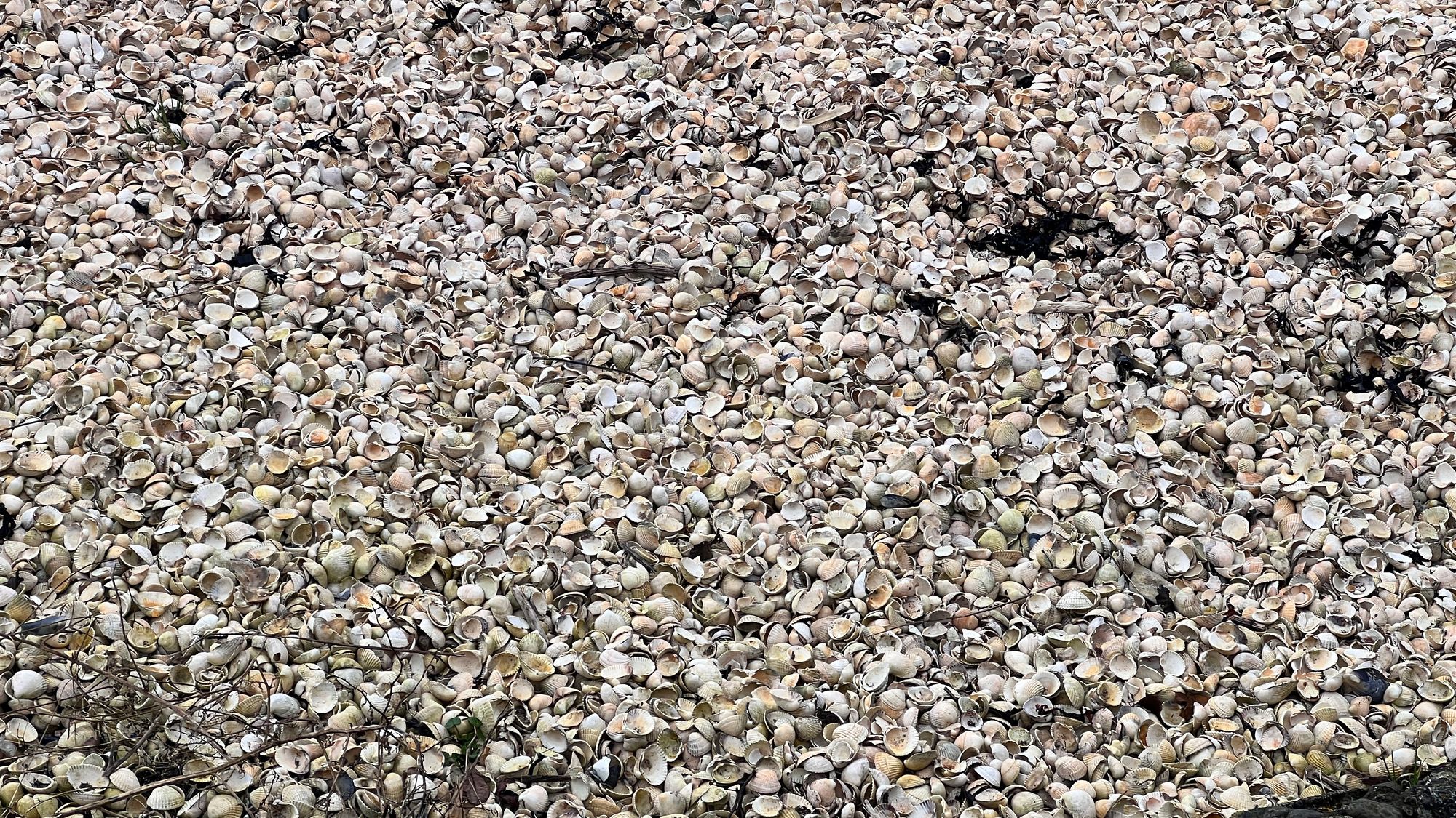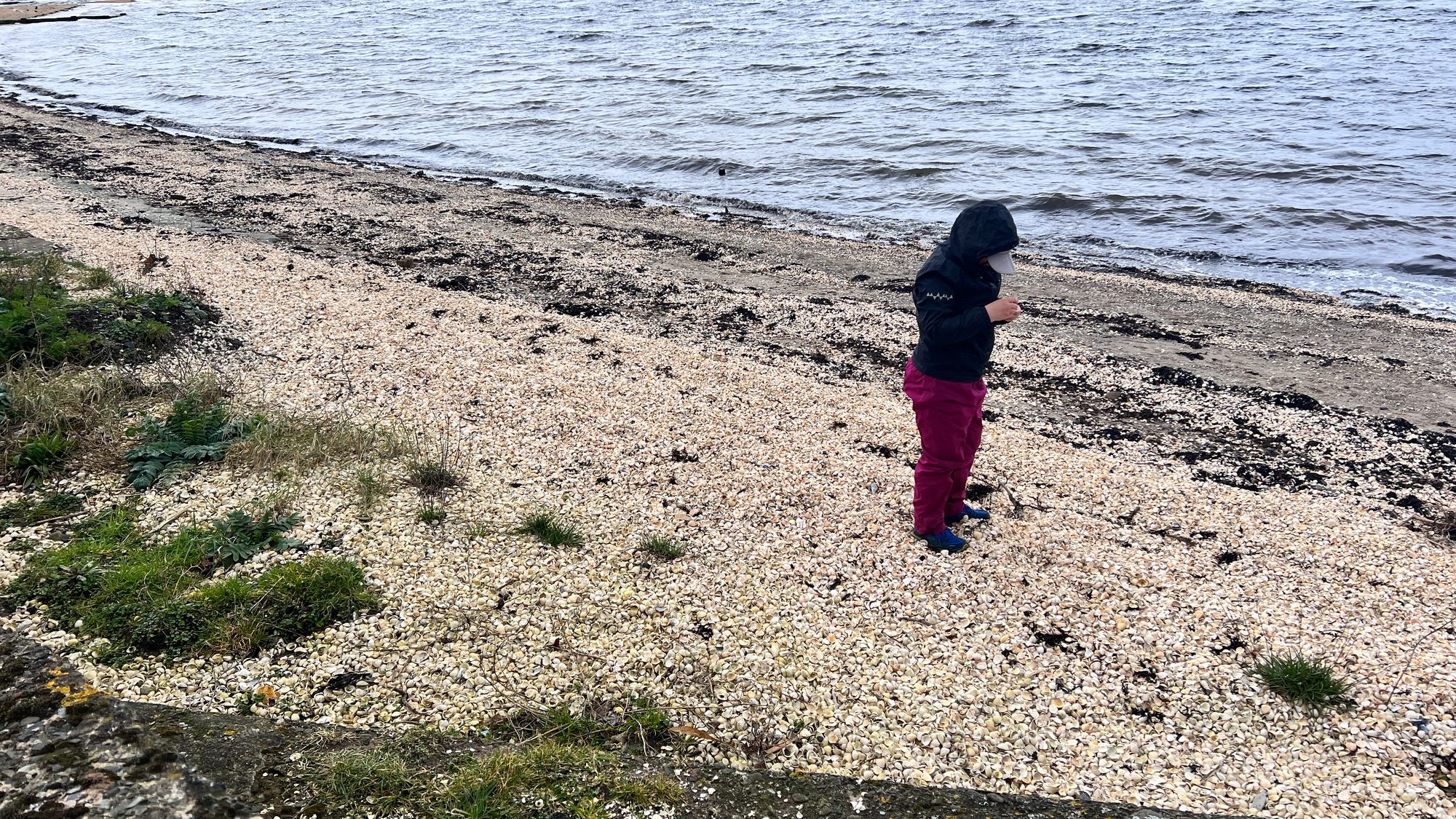 As we walked around the bay we were talking to each other about tue beach coming up and Eve was asking if she could go on it. It wasn’t until we were there and had stopped beside it to put our waterproof clothes on that Eve noticed it wasn’t sand at all, it was shells! Billions of shells! I had never seen anything like it and Eve (along with Sarah) are avid shell collectors. Keeping Eve off the beach was never going to happen, but I wouldn’t have stopped her anyway, it was so awesome! As soon as she had her waterproofs on I helped her across the wall and onto the beach whilst I sorted myself out and wrote a quick post for social media. Eve collected about 10 shells which is considerably less than I expected (I had phoned Sarah who was by chance not driving to tell her that Eve was shell collecting)
