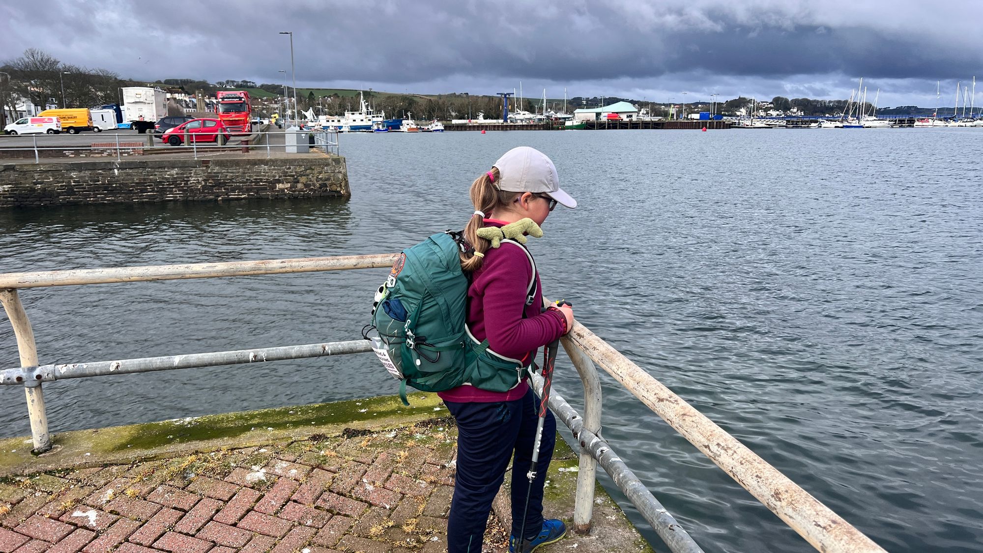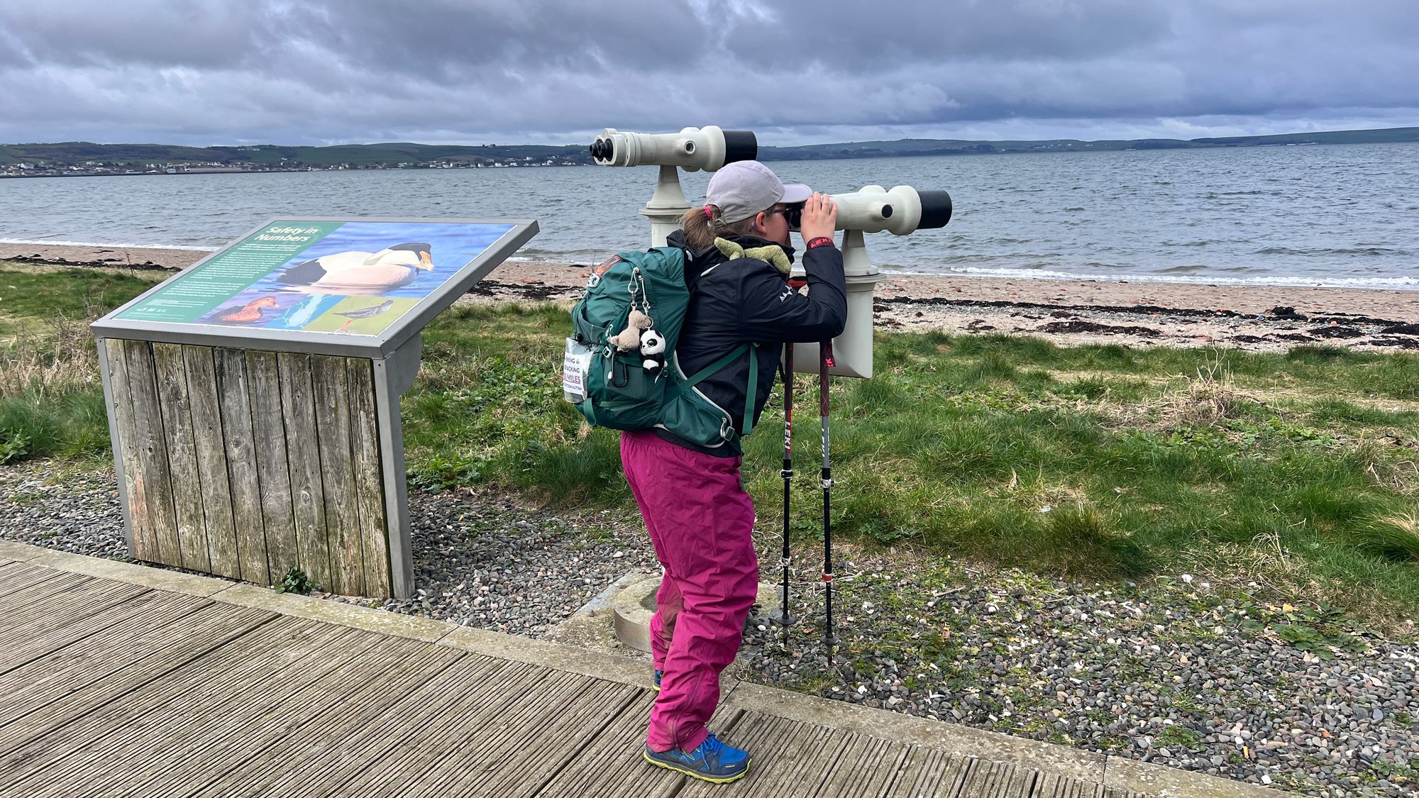We sat outside and ate them talking about what we could see over the bay. The lay-by also had some industrial binoculars that surprisingly were free to use! Eve asked me if she could have a look through them and I said ‘no’ assuming it would cost as much as our egg rolls! Eve told me she thought they were free as there’s no money slot. Eve inspected the entire bay through the binoculars with particular fascination on the ferry ports we would be walking past later on that day.