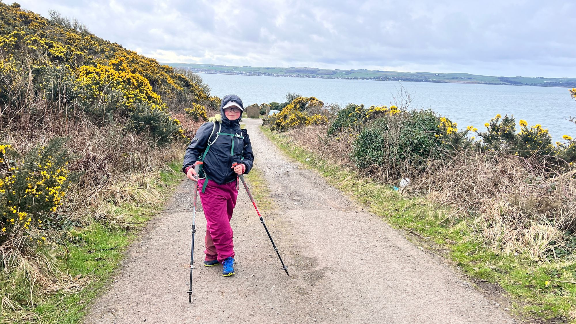 The trail now lead slightly away from the road to hug the shore line changing between beach walking and grassy trails lined with Gorse bushes and brambles with occasional short sections of road walking.