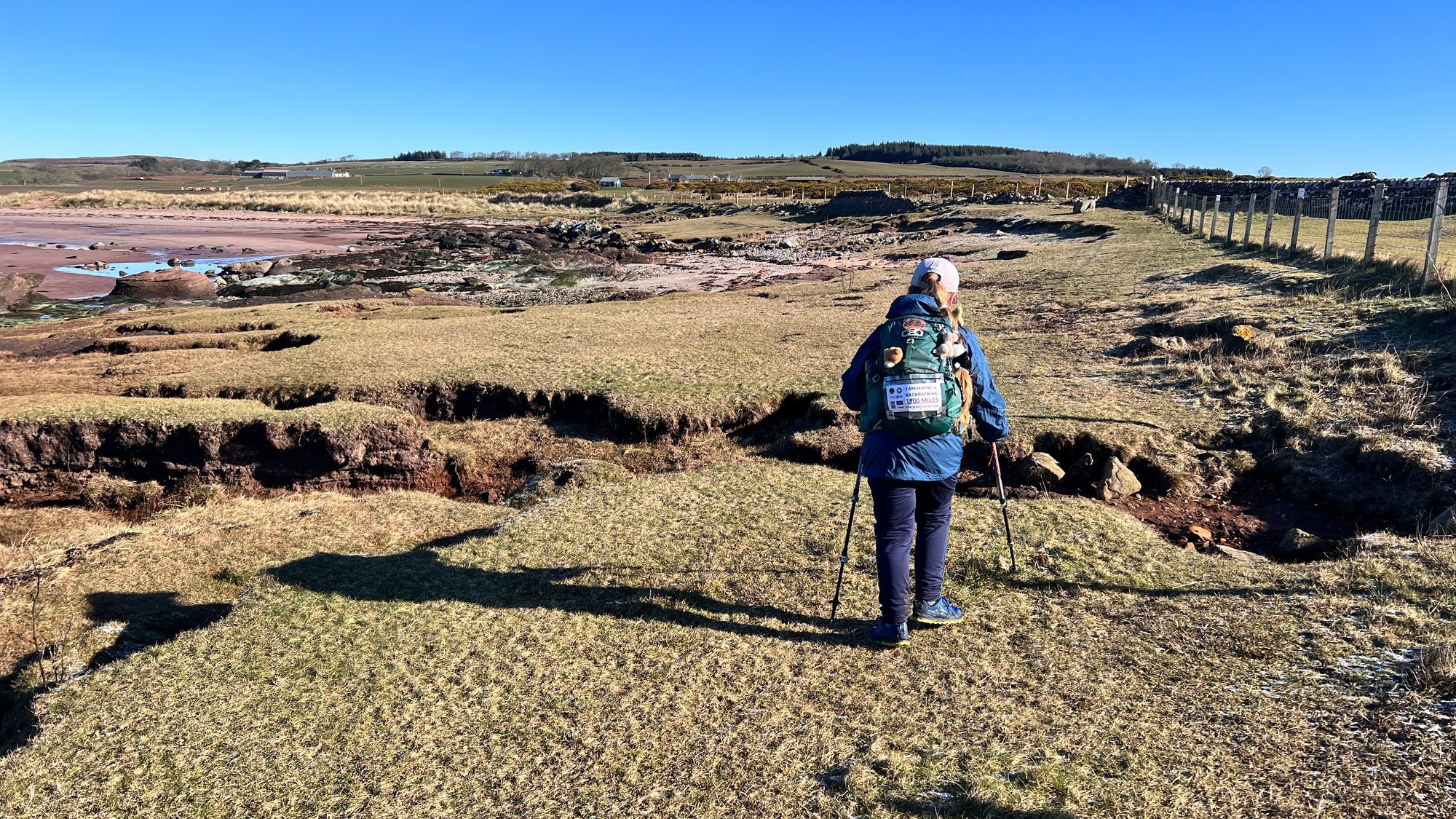 We encountered a small issue soon after Stravanan Bay. A field full of cows and calves. We kept to the edge, navigating large areas of muddy swamp. The cows left us alone, thank goodness, however the route took us up a small farmers track lined with barbed wire fences of each side. As we got up there we saw 4 bullocks who were very skittish! We walked carefully until we came to a gate into an adjacent field that we used to escape the track. We were concerned the track would end and the bullocks would only have one option, to run past us or at us! We walked through the field when all of sudden the bullocks ran in our direction and jumped the barbed wire fence like a horse in the Grand National. They jumped into the other field on the opposite side of the lane. Eve and I were amazed seeing cows jumping a barbed wire fence. We normally feel fairly safe walking past cows with a fence between us, but after seeing the bullocks jump I don’t think we will feel quite as secure behind a fence, even when it’s barbed wire!