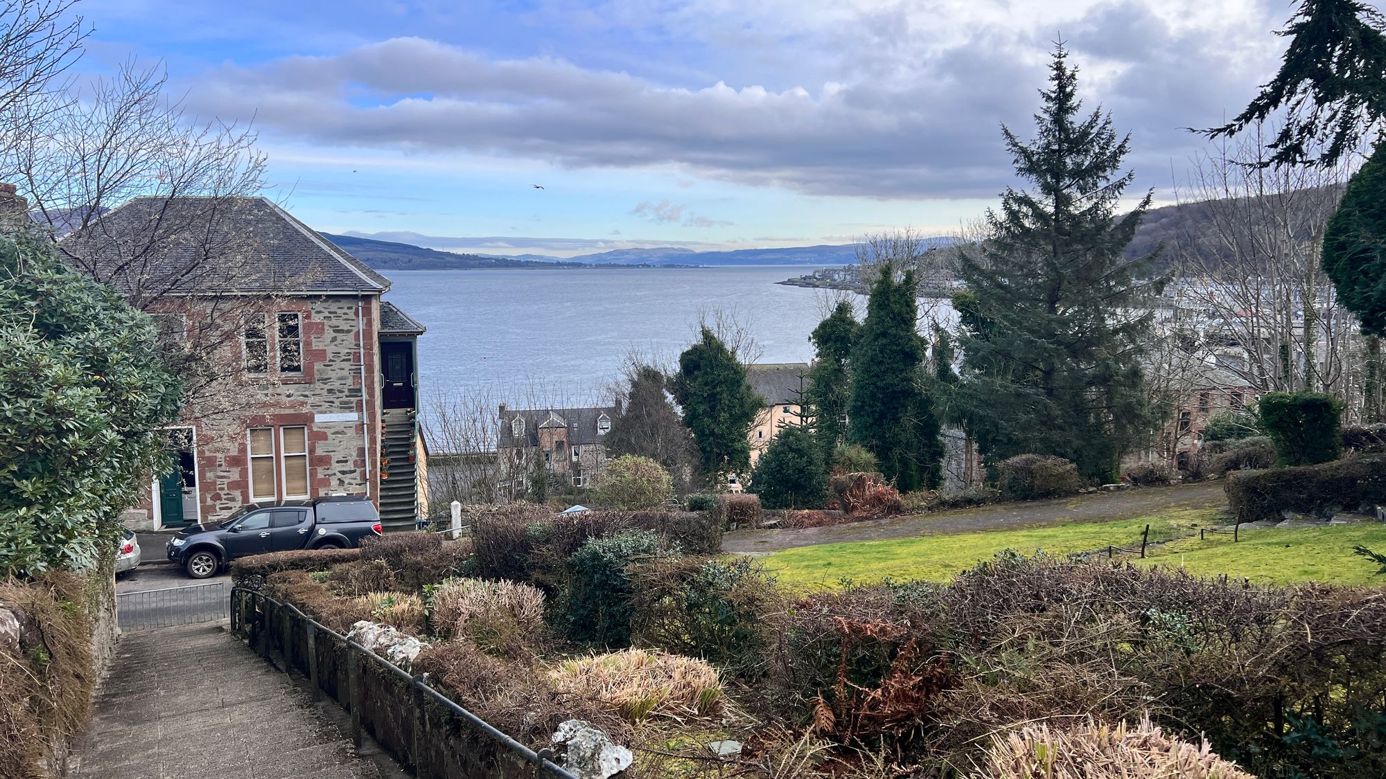 I succumbed and before long we were walking again, following a short, rocky path. Eve had to slow down on that path much to my relief before we reached the road on the edge of Port Bannatyne.