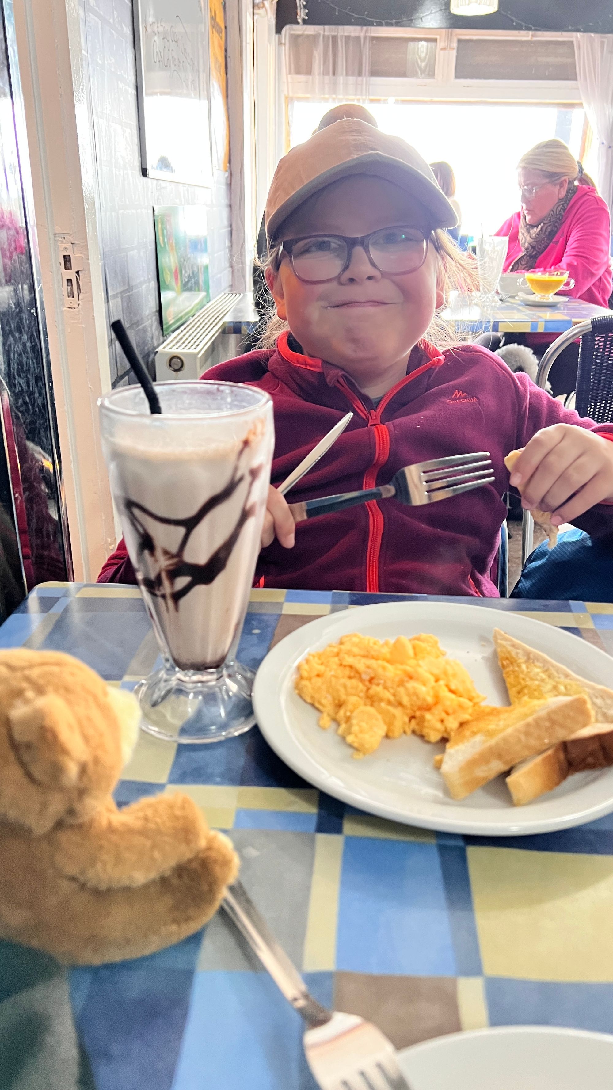 One of the best things is that Ettrick Bay has a cafe. When we arrived it was busy, really busy. We found a seat and looked at the menu. We finally decided to have scrambled egg on toast from the kids menu. Yes, I had the same from the kids menu as the kids portions are usually not that much smaller than the adults. We were not disappointed. Eve also had a chocolate milkshake as an alternative to the usual ice cream!