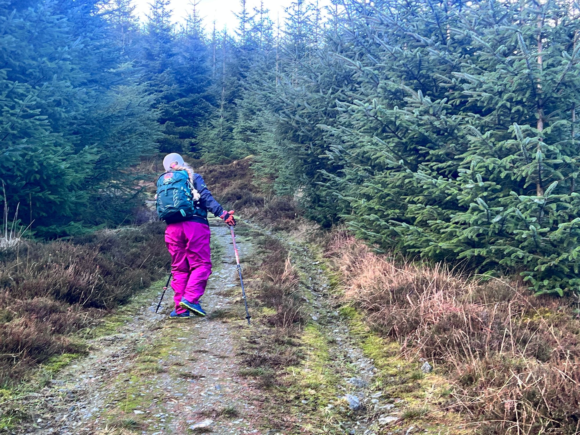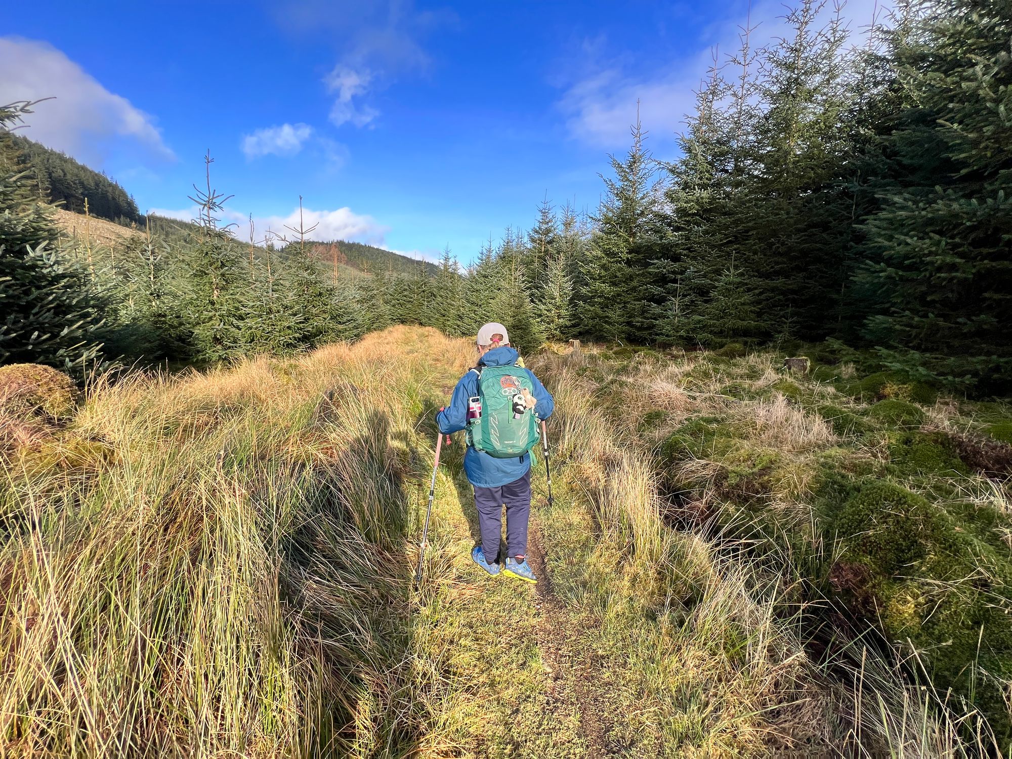 The trail went uphill a bit more before flattening out onto a forestry road again. The road was dull and muddy but the views were absolutely spectacular. The scenery as we walked today got better and better even if the weather was slowly getting wetter and wetter.