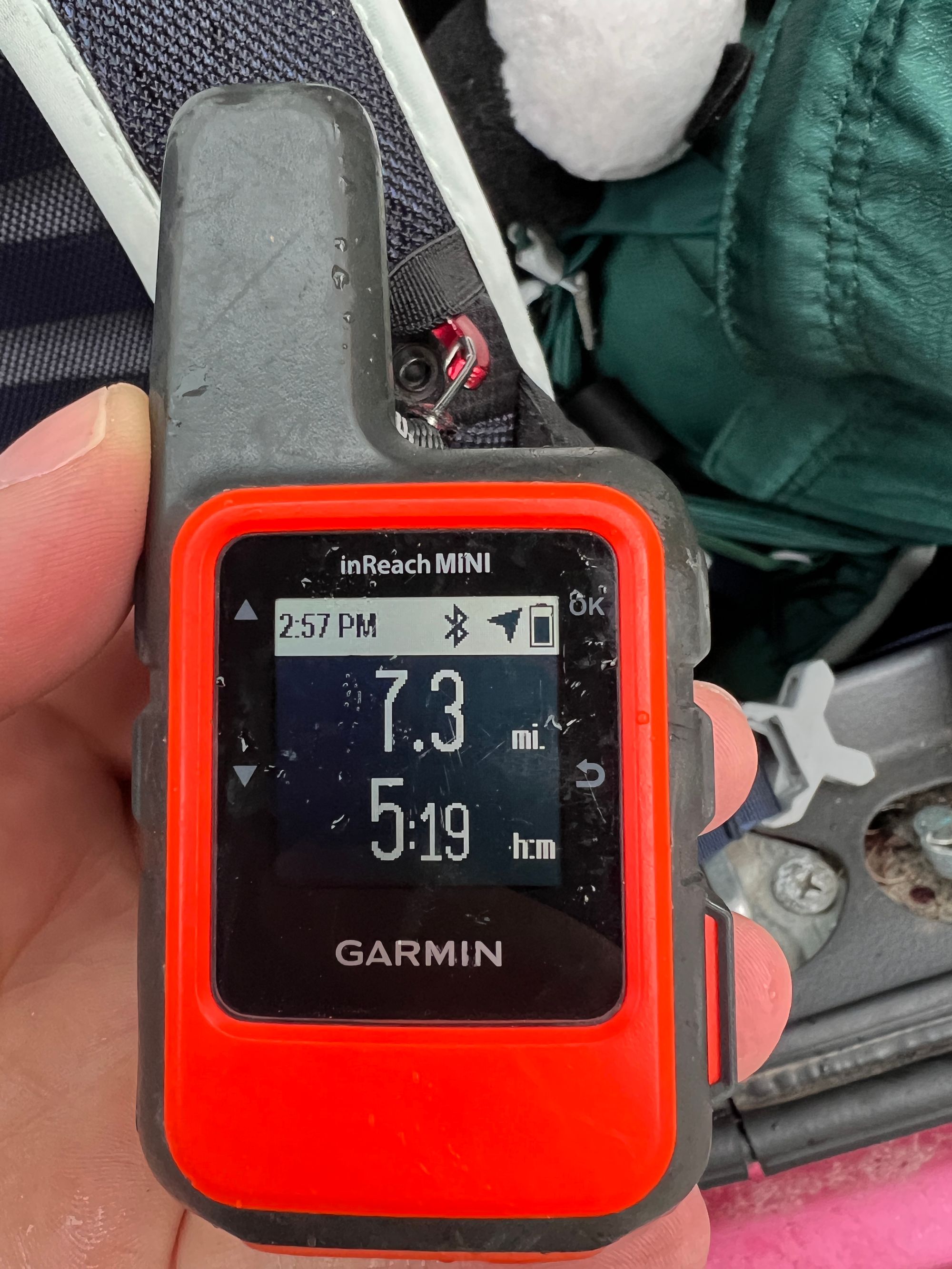 As soon as we sat down with our food it started to rain, a lot. I decided to use our shelter so we pulled it over ourselves and ate our lunch in the warm and dry.