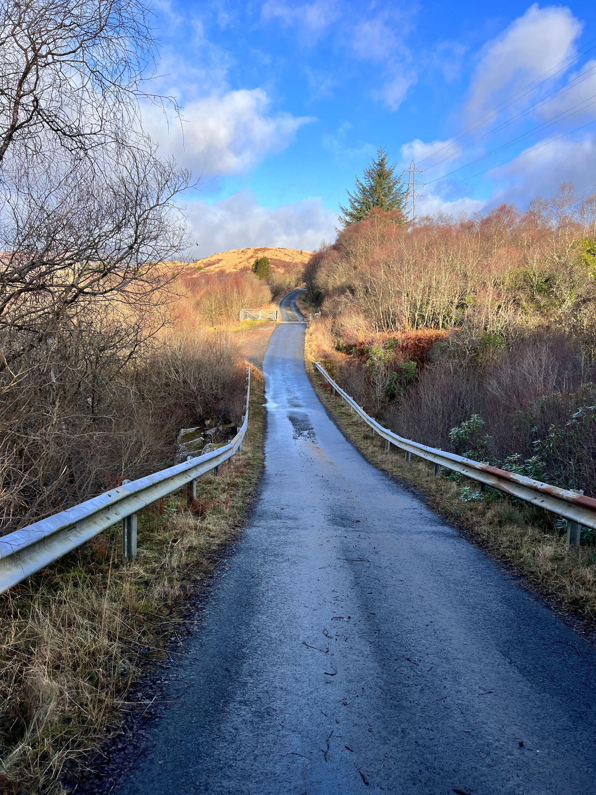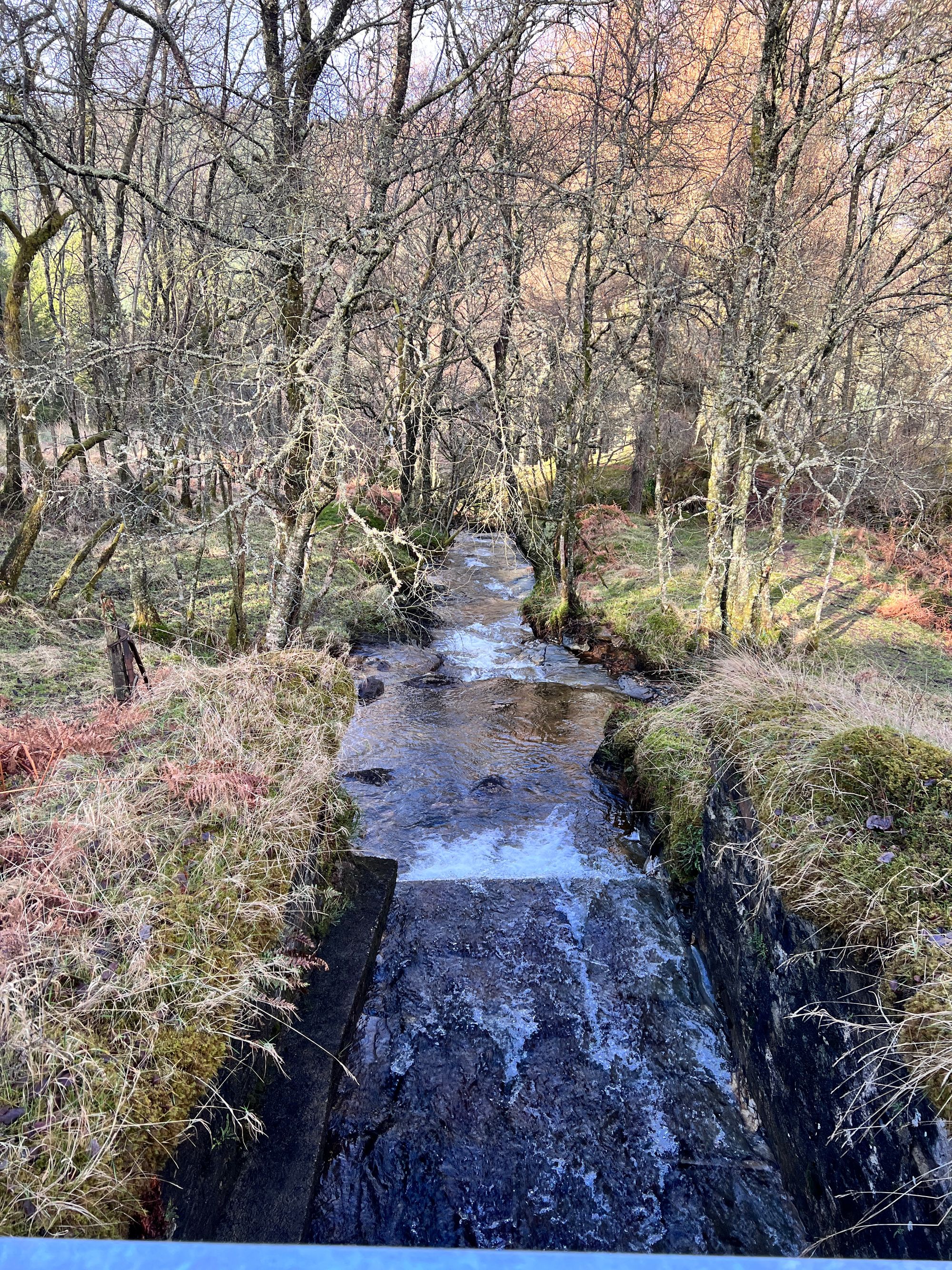 We walked down a beautiful narrow path between some trees. It was gentle and undulating with burns crossing the path regularly. It was lovely.