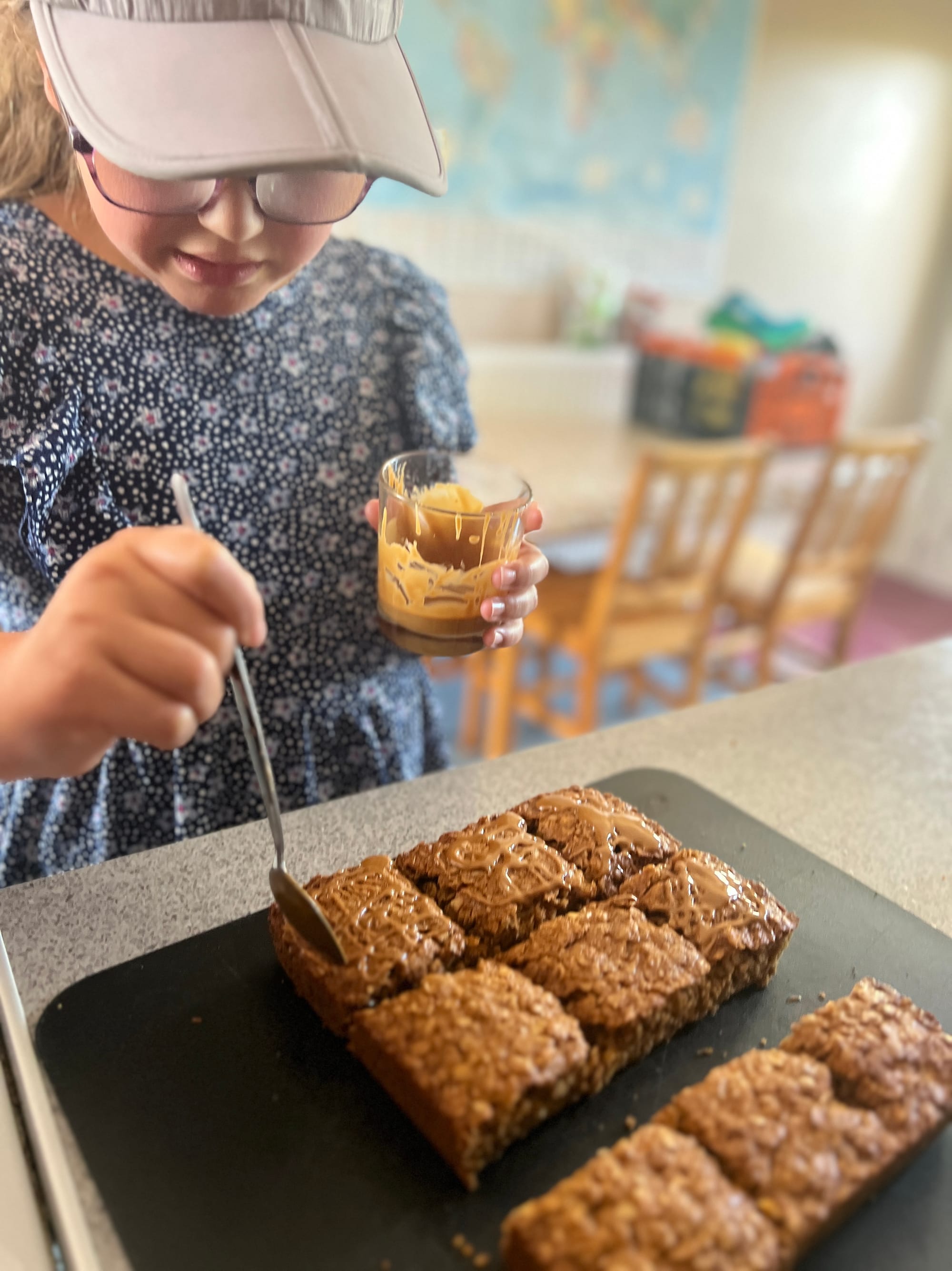 - Cut into slices (we cut into 9 squares) using a sharp knife. Leave to cool completely before turning out. Once out of the tin, you will need to reslice it.
