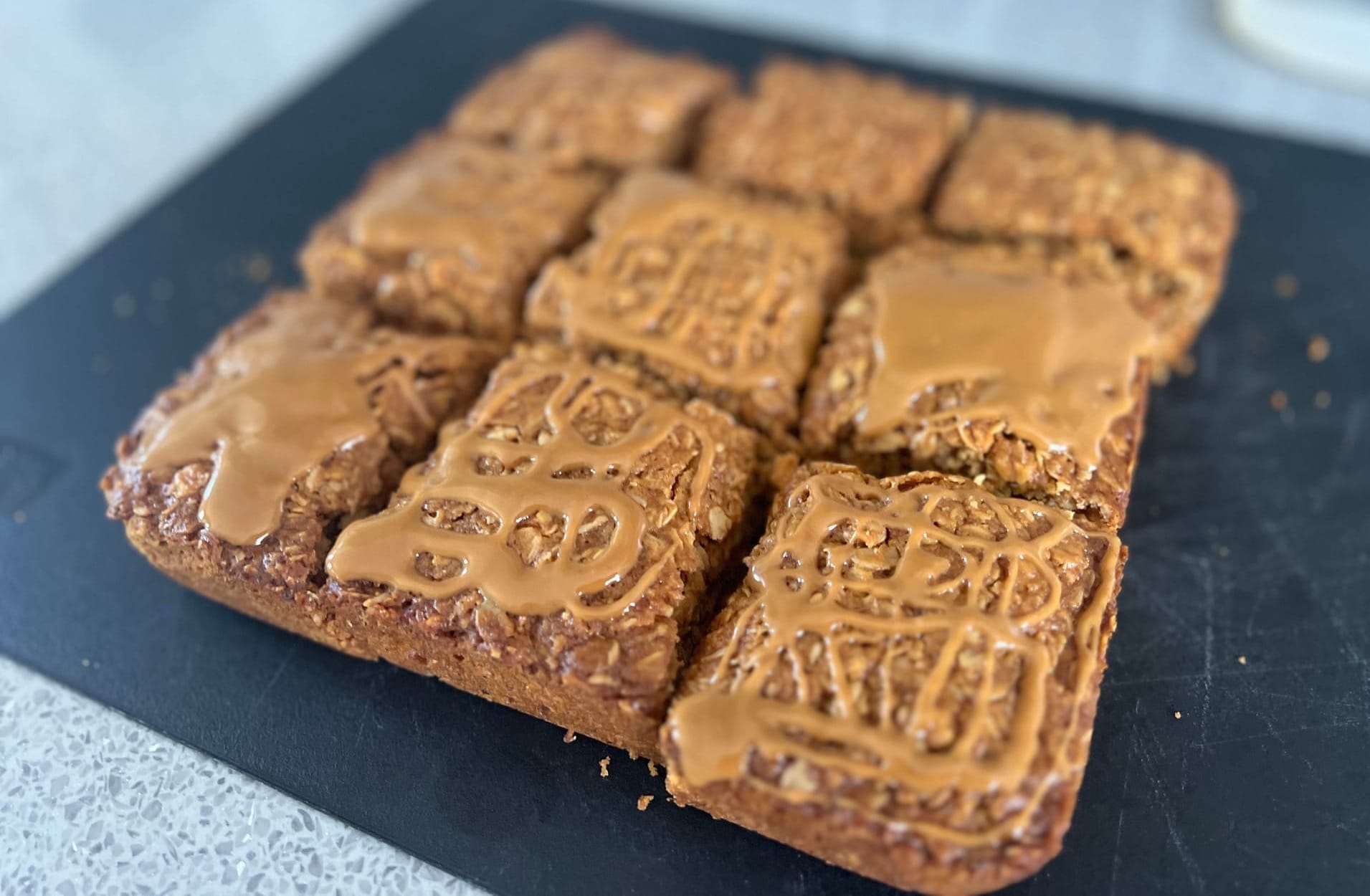 My advice is to make a batch in advance, cut it into pieces, wrap it in cling film, and freeze it. The flapjack will keep well for a few weeks, but will last for months in the freezer, if you can resist it for that long!
